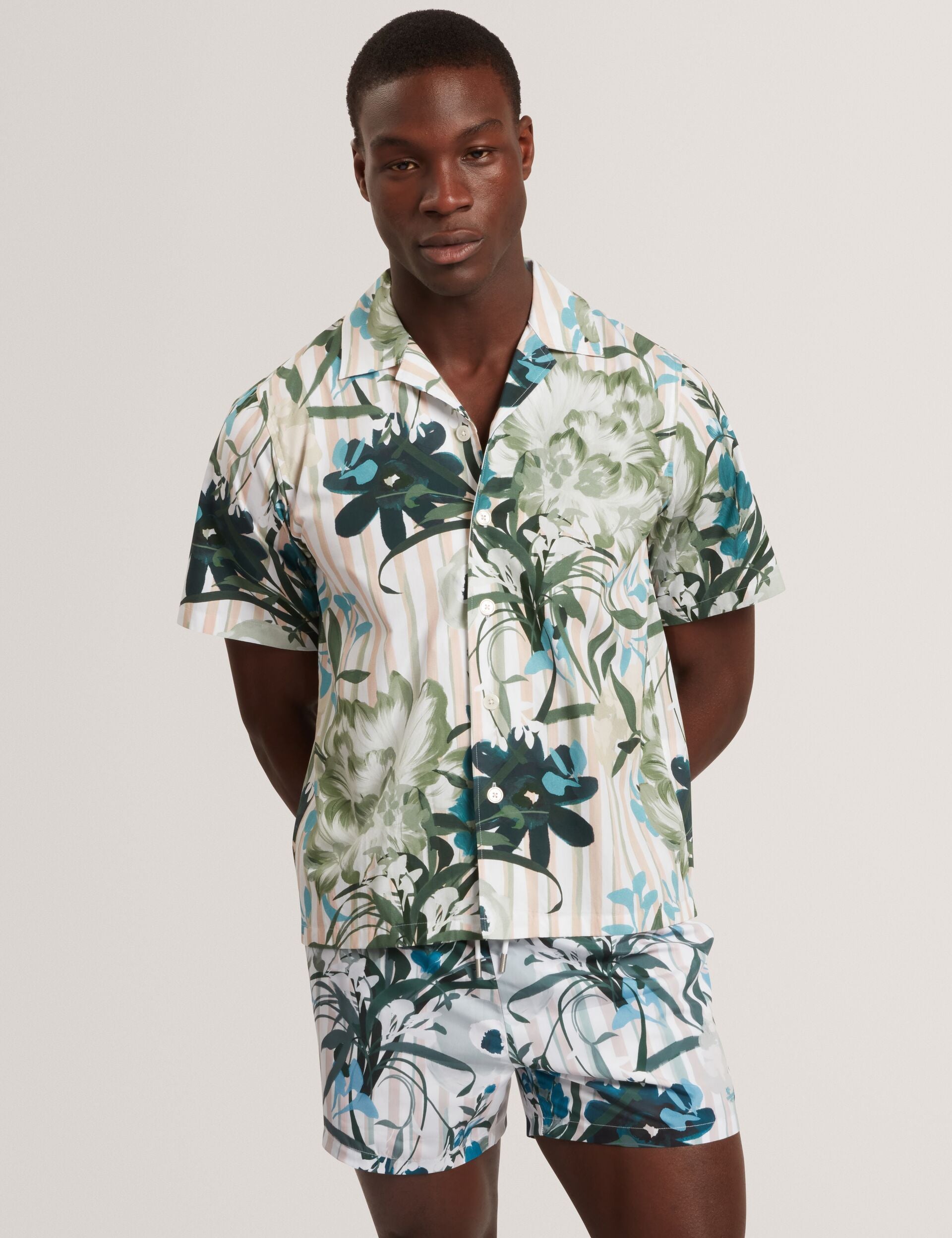 The ANUKIS short sleeve shirt channels that resort feeling, mixing natural botanicals and nautical stripes into a single statement print. Made from breathable cotton, its relaxed fit and open neck collar feel instantly laid back.