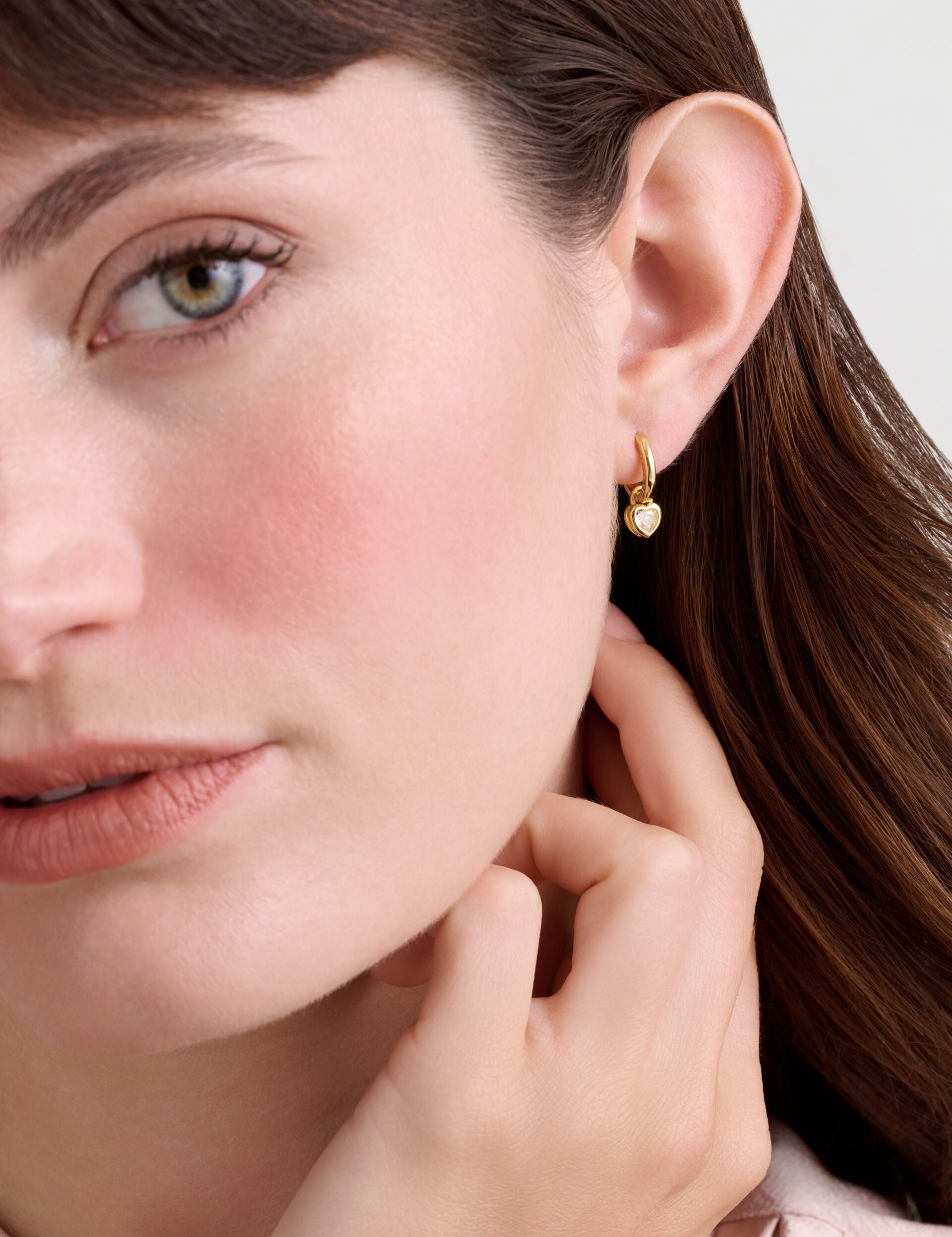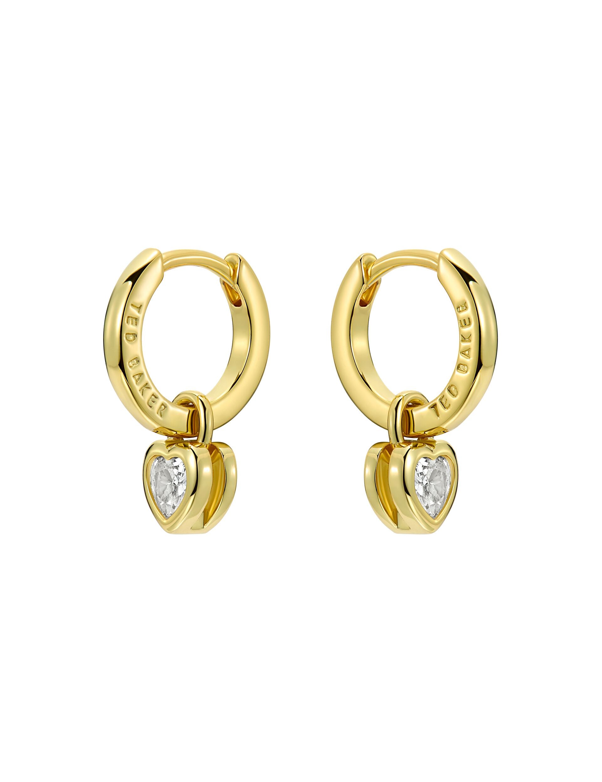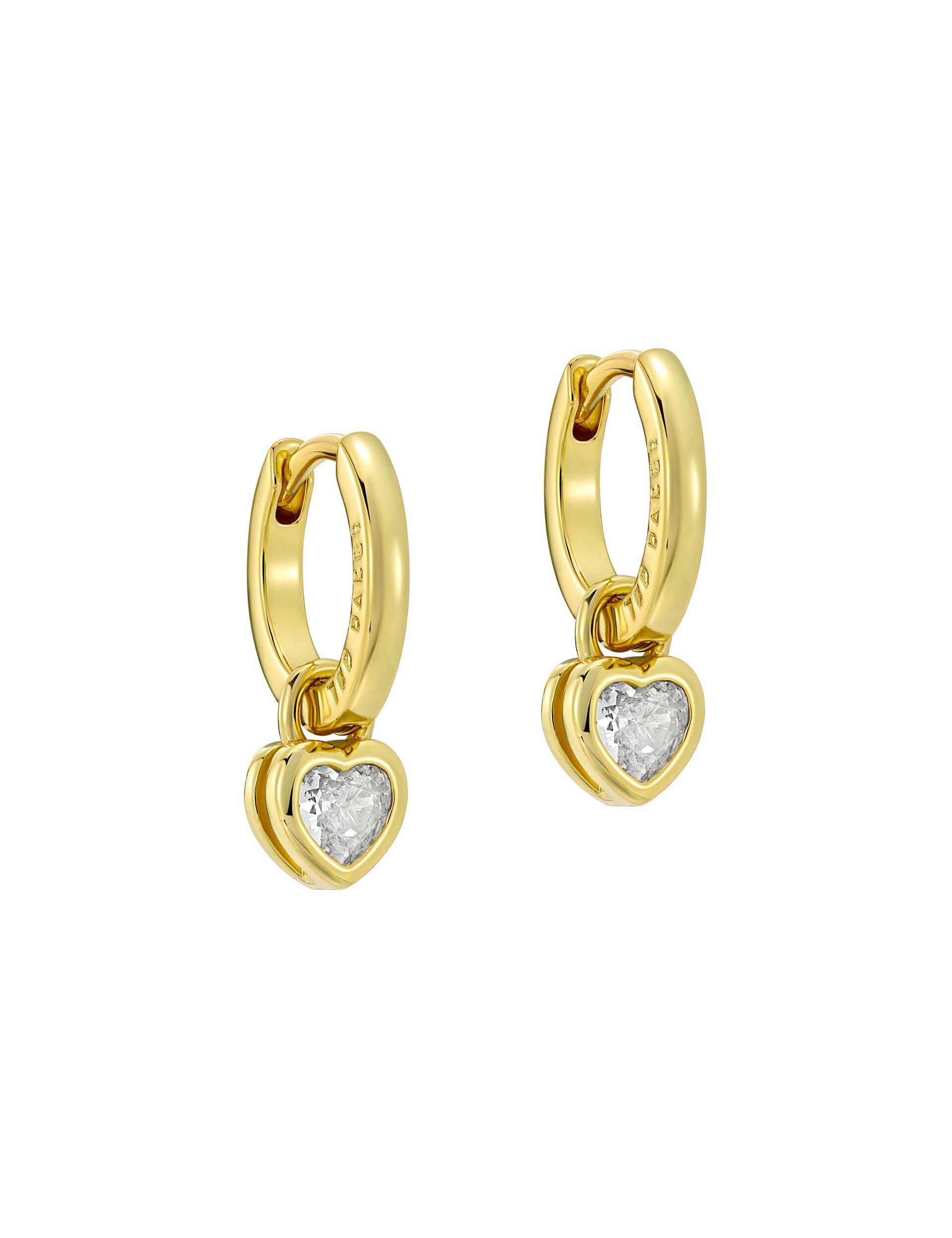 The HARPERG huggie earrings bring subtle sparkle and movement, featuring a mini crystal heart pendant hanging from a shiny gold-tone hoop. They add a sweet touch that works for everyday looks as well as dressier moments.