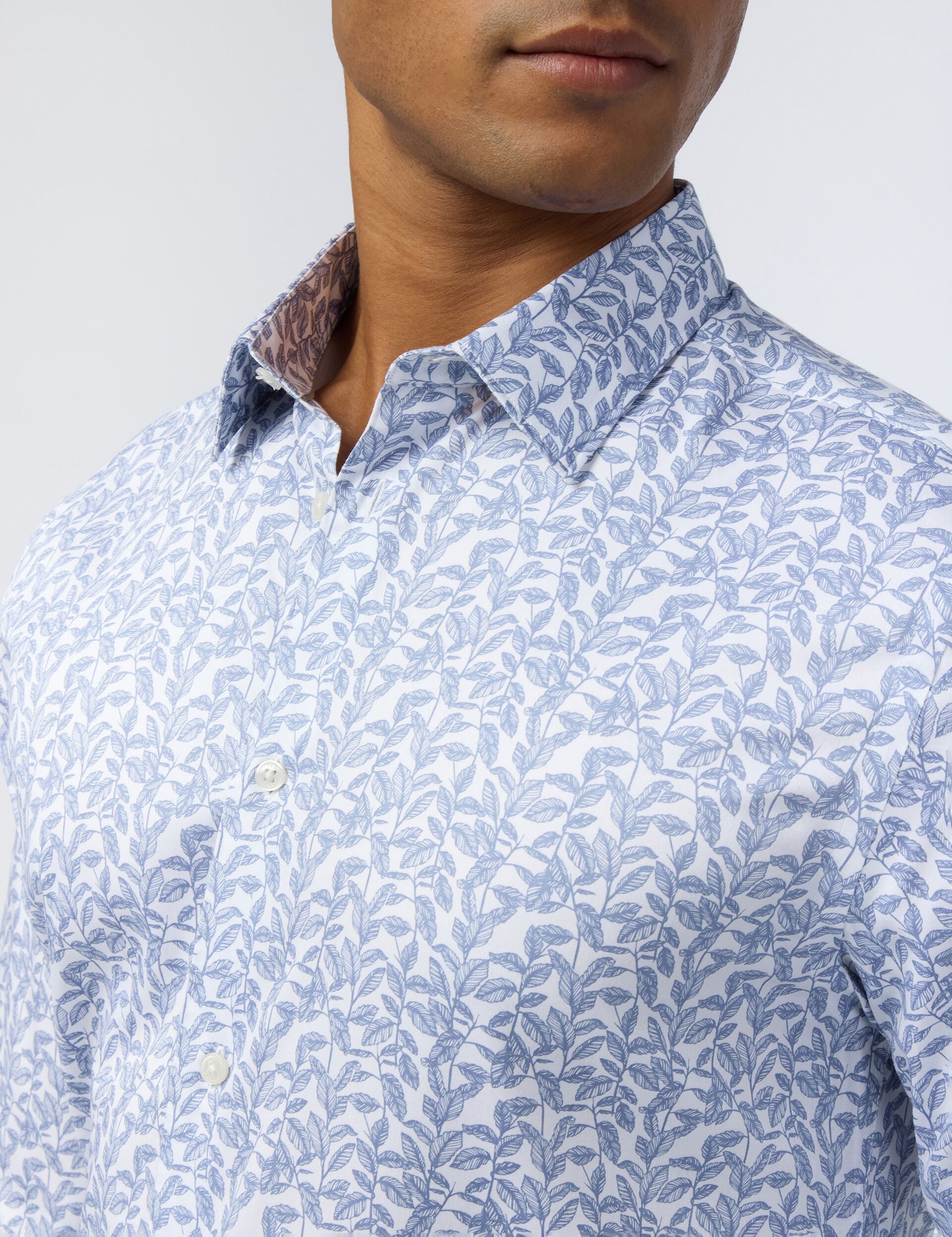 Designed with a blue leaf print on a clean white base, the HENDRA slim fit shirt brings a playful twist to your tailoring. The soft sateen fabric not only looks sleek, but it provides all day comfort thanks to the breathable organic cotton blend with added stretch.