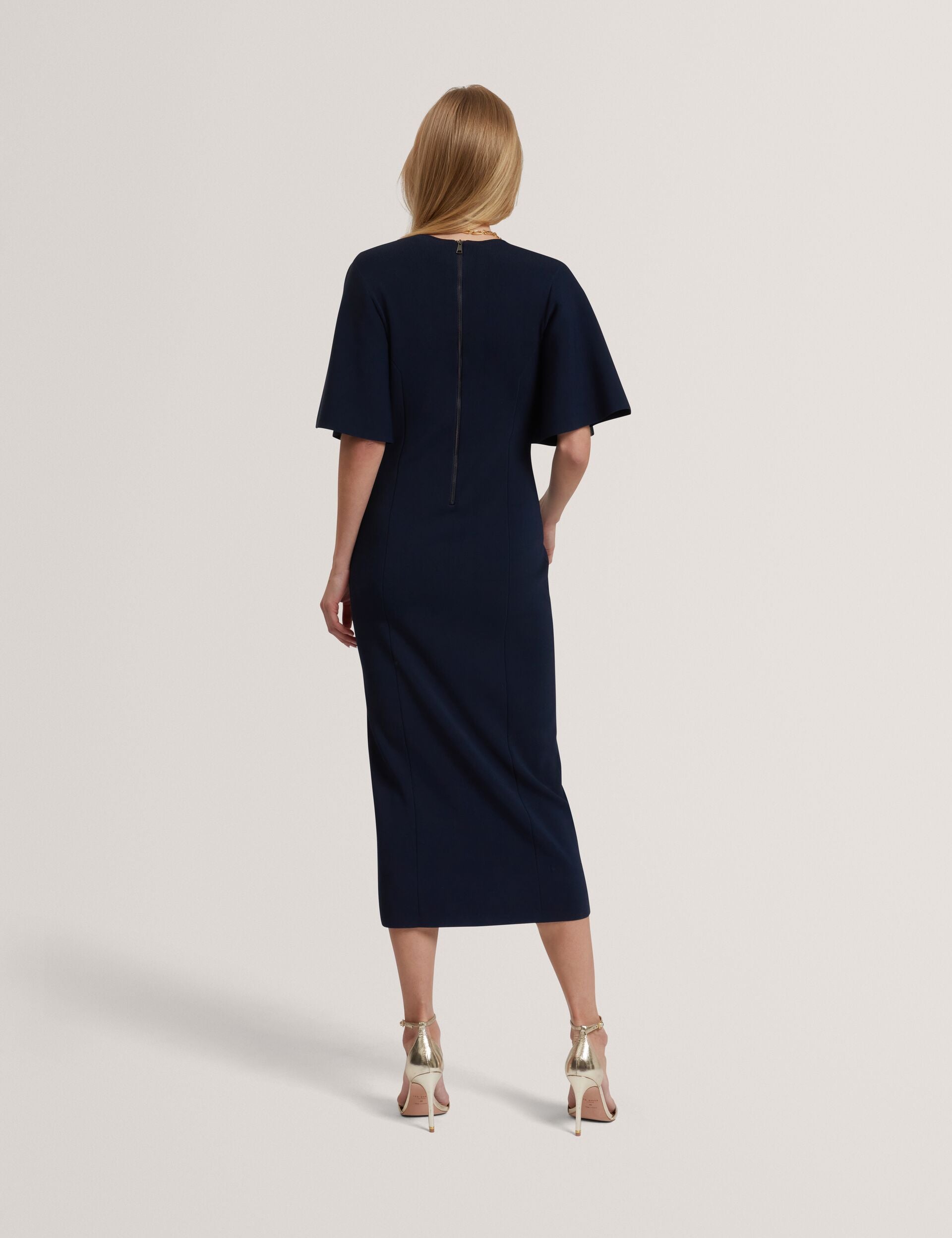 The AEDNA bodycon midi dress is staple elegance, crafted from a plain rib knit fabric that sculpts your silhouette. A split hem gives it that modern edge, with short fluted sleeves to add some movement. It's a piece you'll always feel good, no matter the occasion.