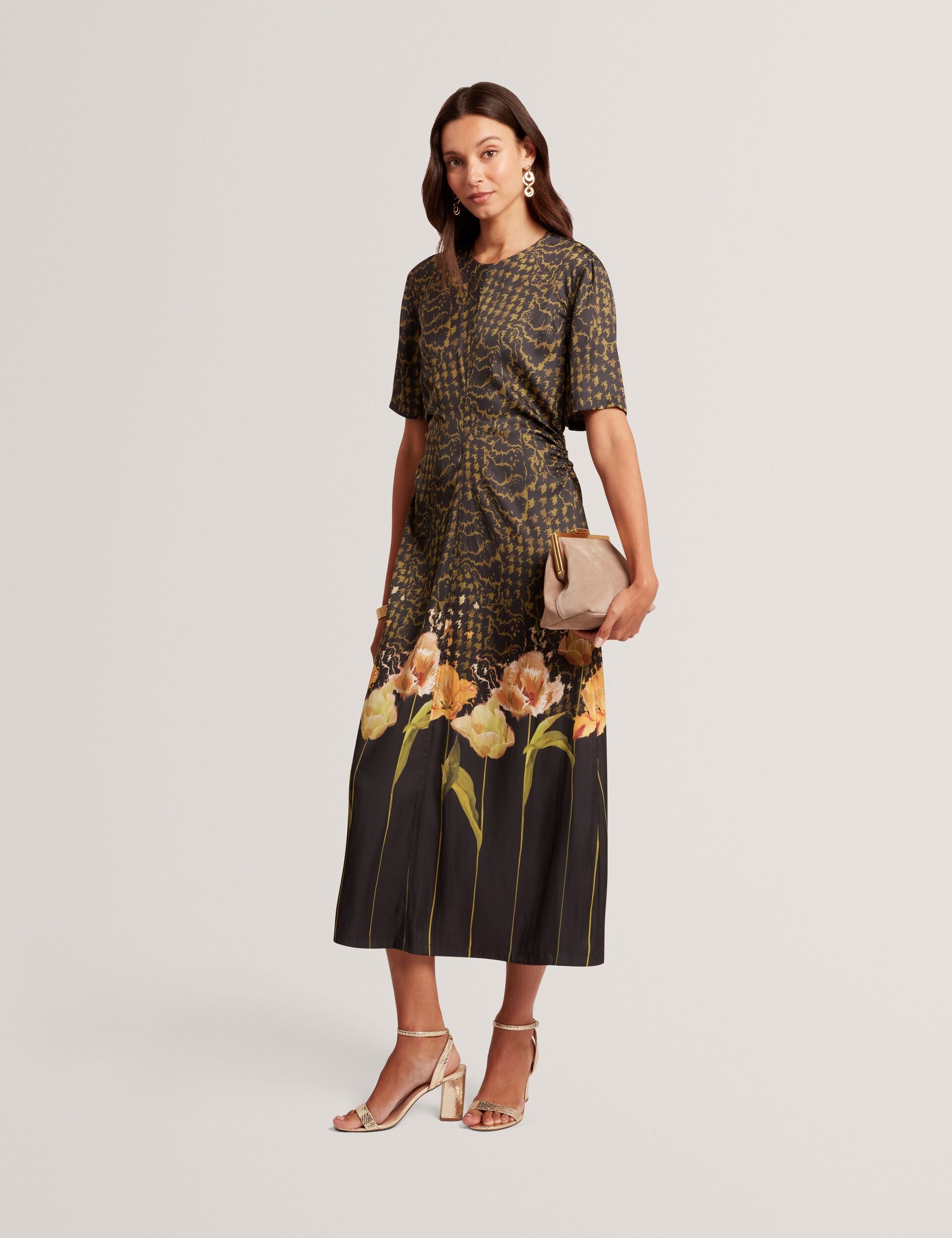 The AEVAA midi dress brings shape and style to your transitional wardrobe. Designed in our bold floral check print in the ultimate autumnal colour palette, we've added gatherings at the waist to create the dreamiest wear-anywhere staple.