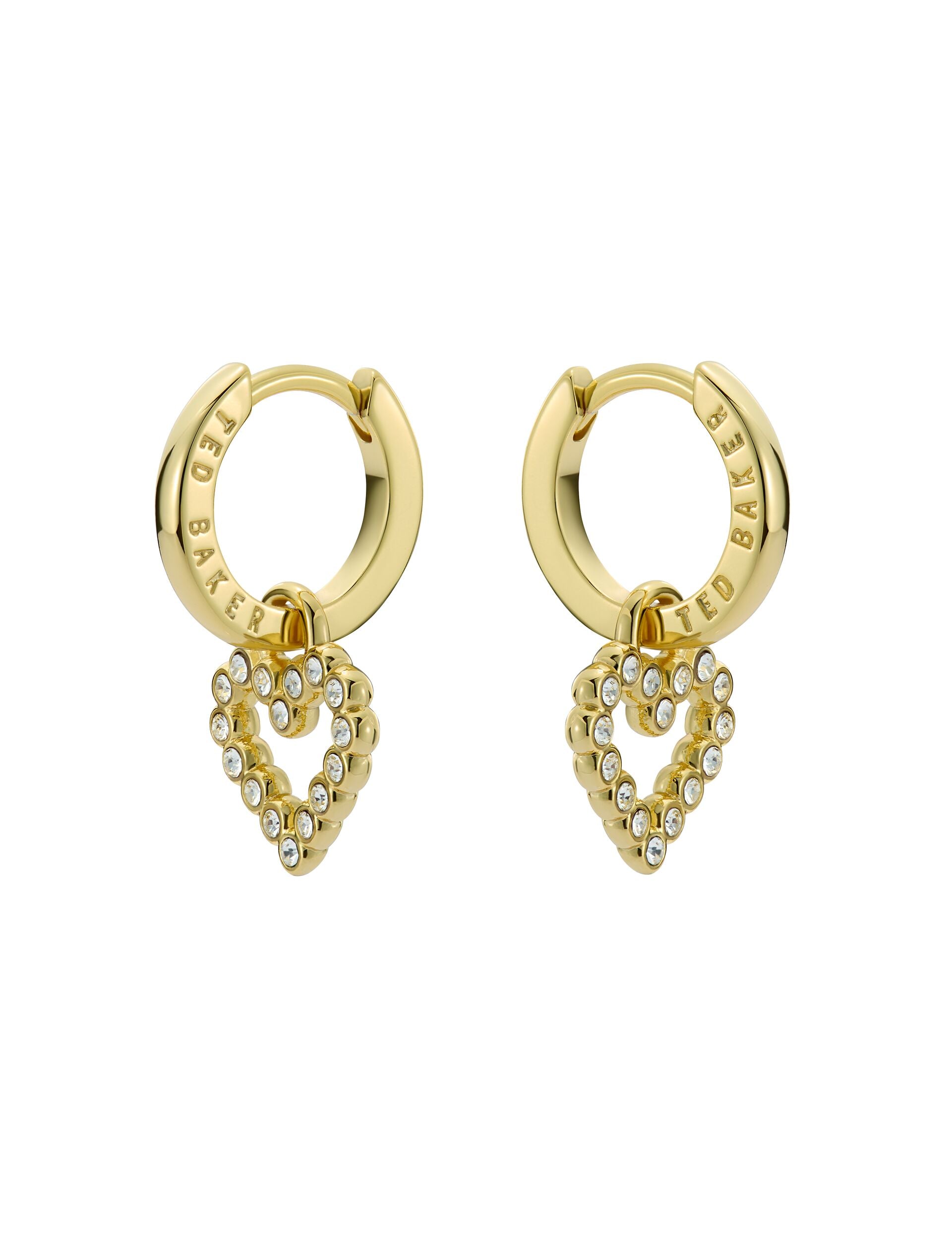 A classic pair of huggie hoop earrings gets a loving touch with AMORA. An open heart drop pendant is encrusted with clear European crystals to sweeten up this staple, complete with subtle engraved branding and secure hinge closure.