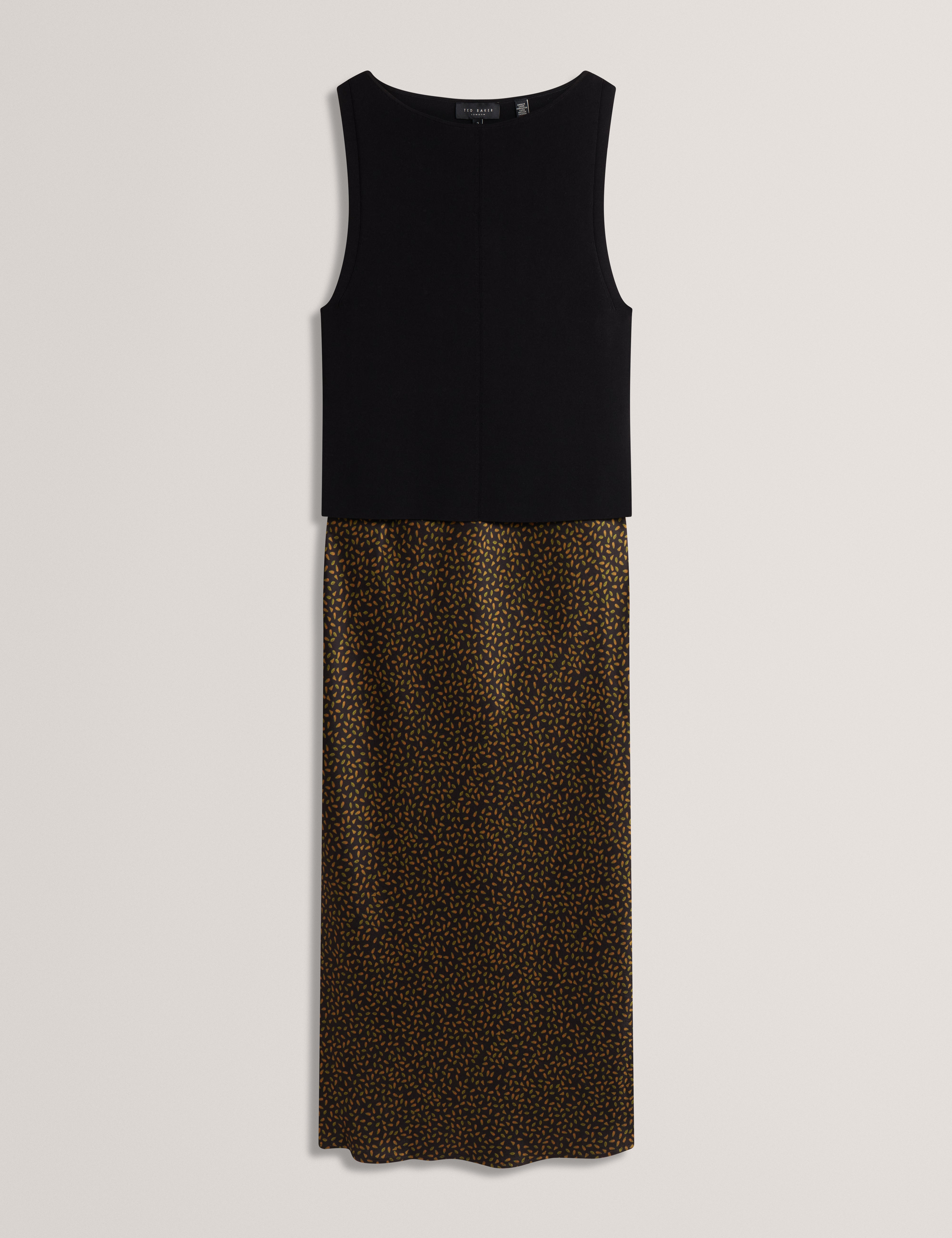 Have 2 looks in 1 with the ANDERA slip dress, which features a removable knitted tank top to layer on the style. The satin fabric is printed with a ditsy leaf design that lets this midi dress charm on its own, given a skimpy finish with spaghetti straps and a V-shape neckline.