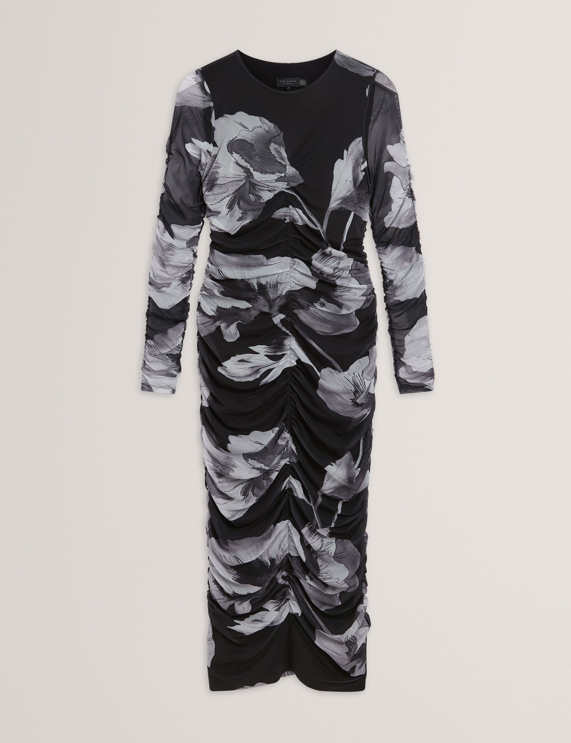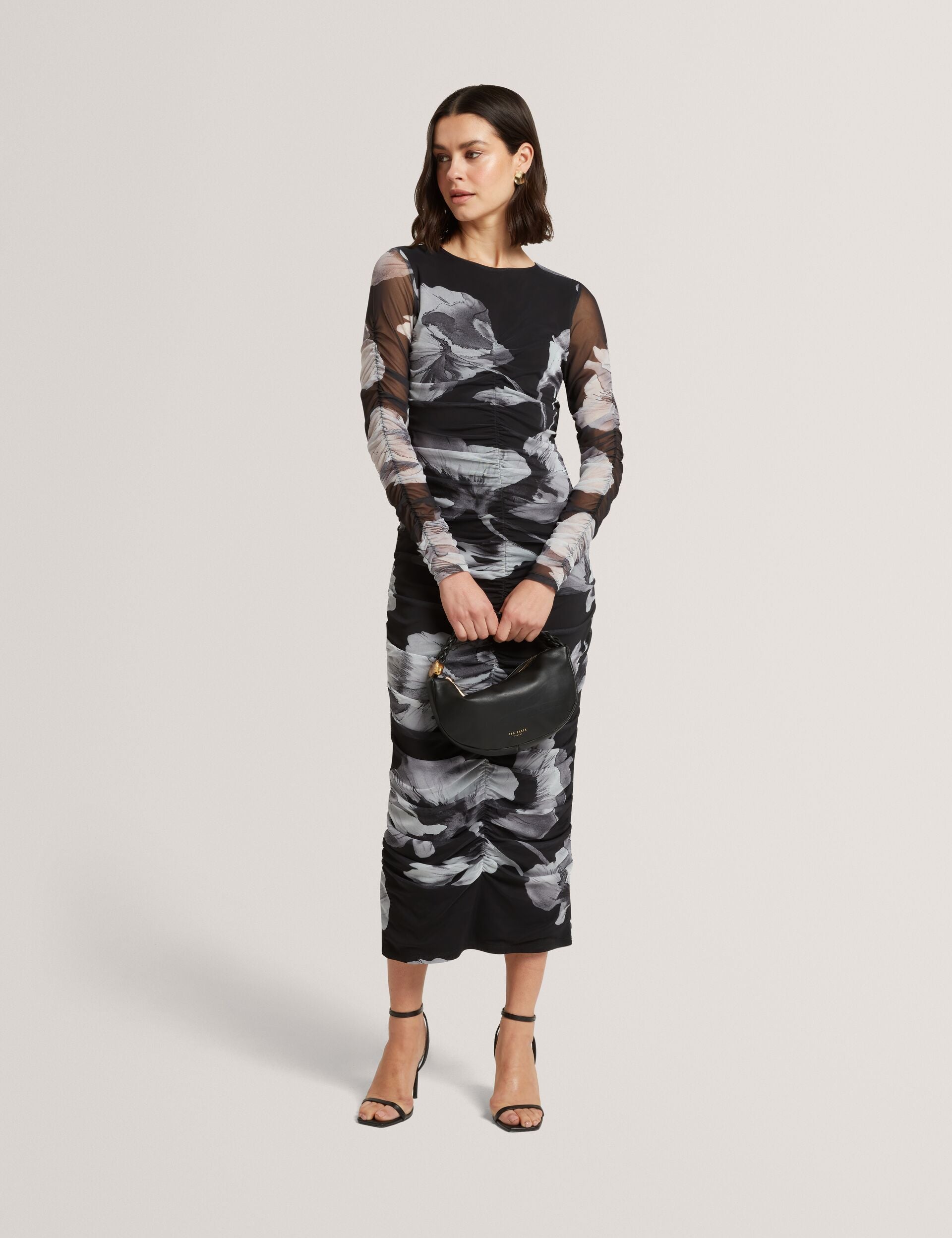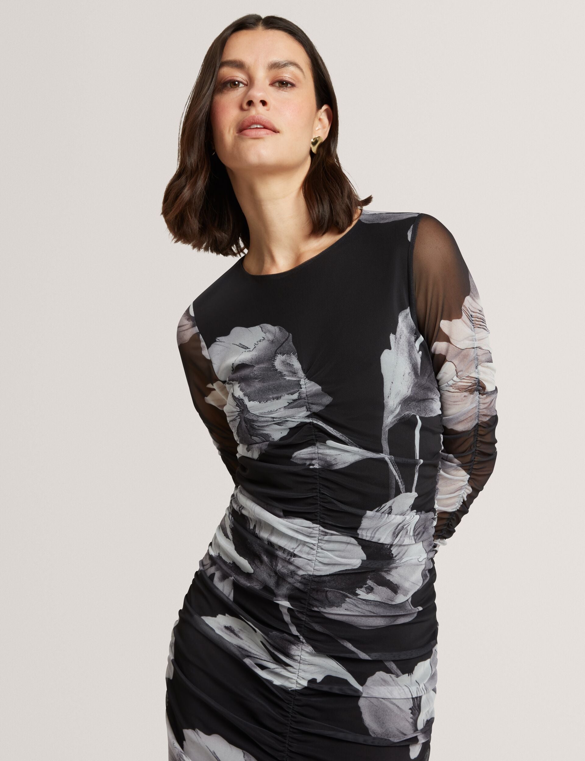 Featuring our painted poppy print in a monochrome palette, the ARIETTY mesh midi dress is the epitome of dark romance. Ruched seams bring textural interest to its sleek bodycon silhouette, whilst the sheer long sleeves flash just a hint of skin.