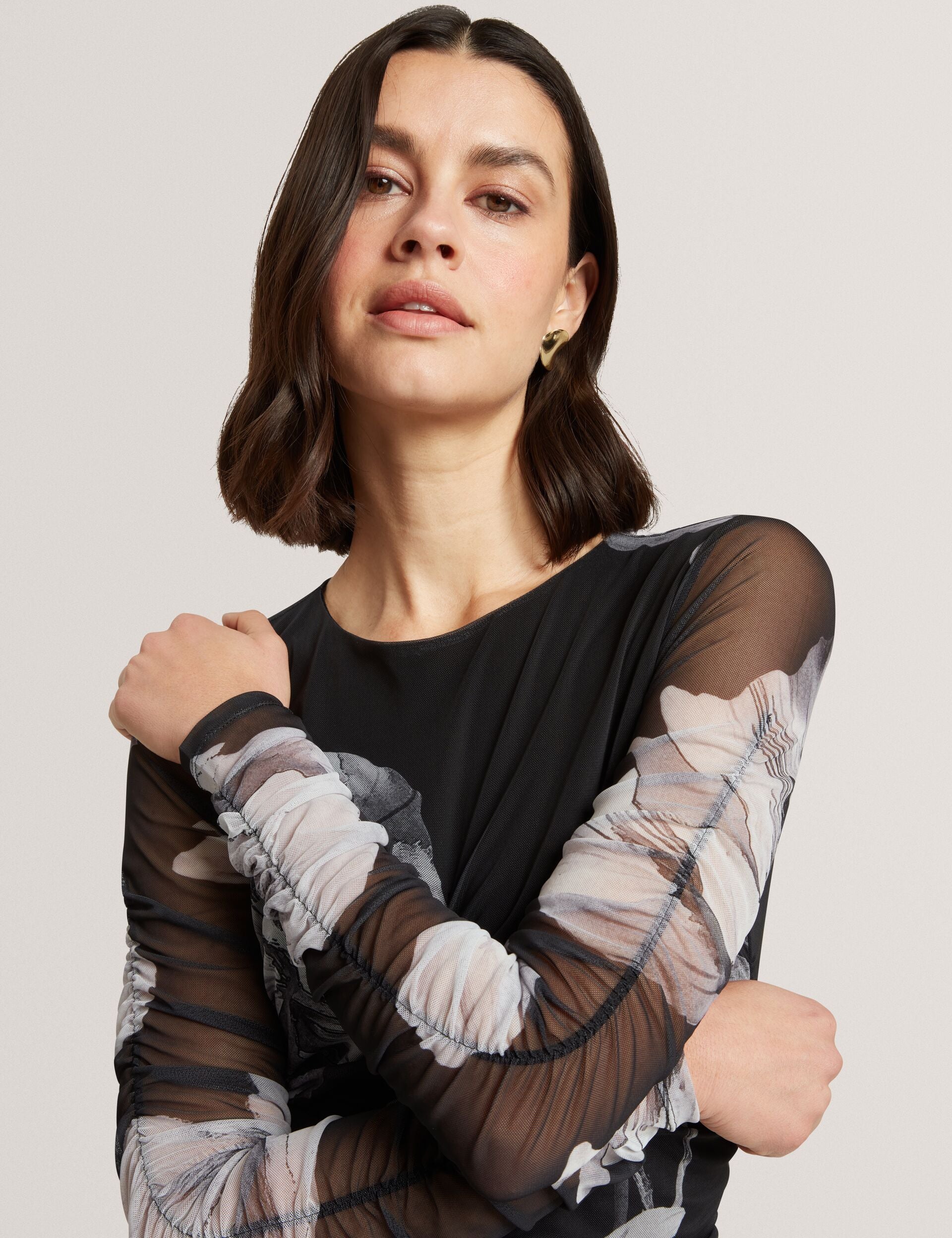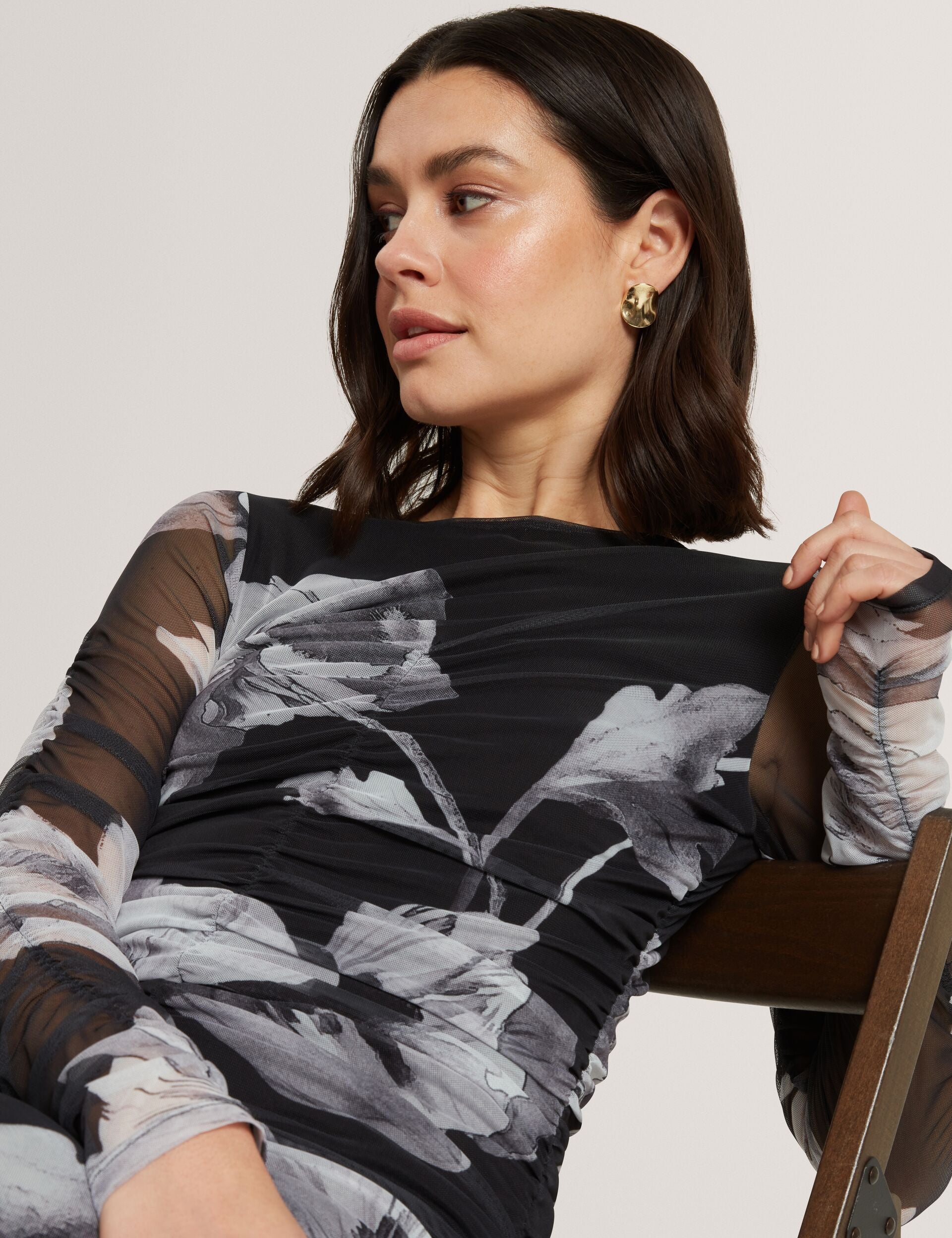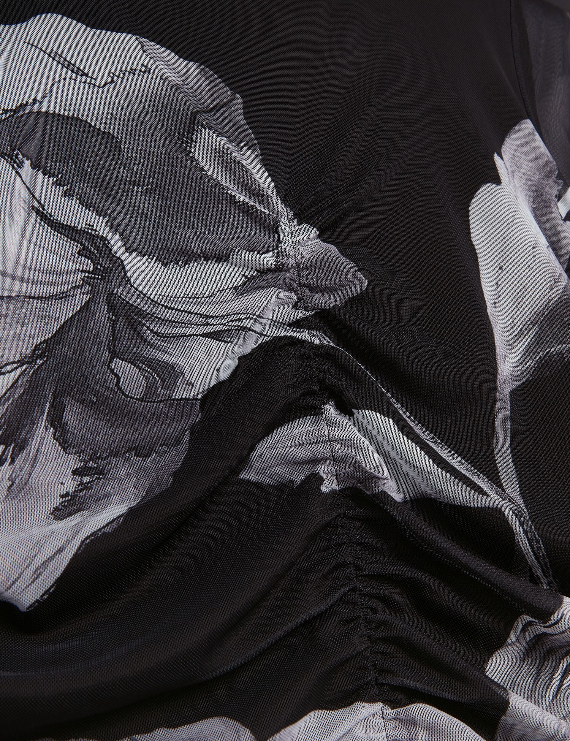 Featuring our painted poppy print in a monochrome palette, the ARIETTY mesh midi dress is the epitome of dark romance. Ruched seams bring textural interest to its sleek bodycon silhouette, whilst the sheer long sleeves flash just a hint of skin.