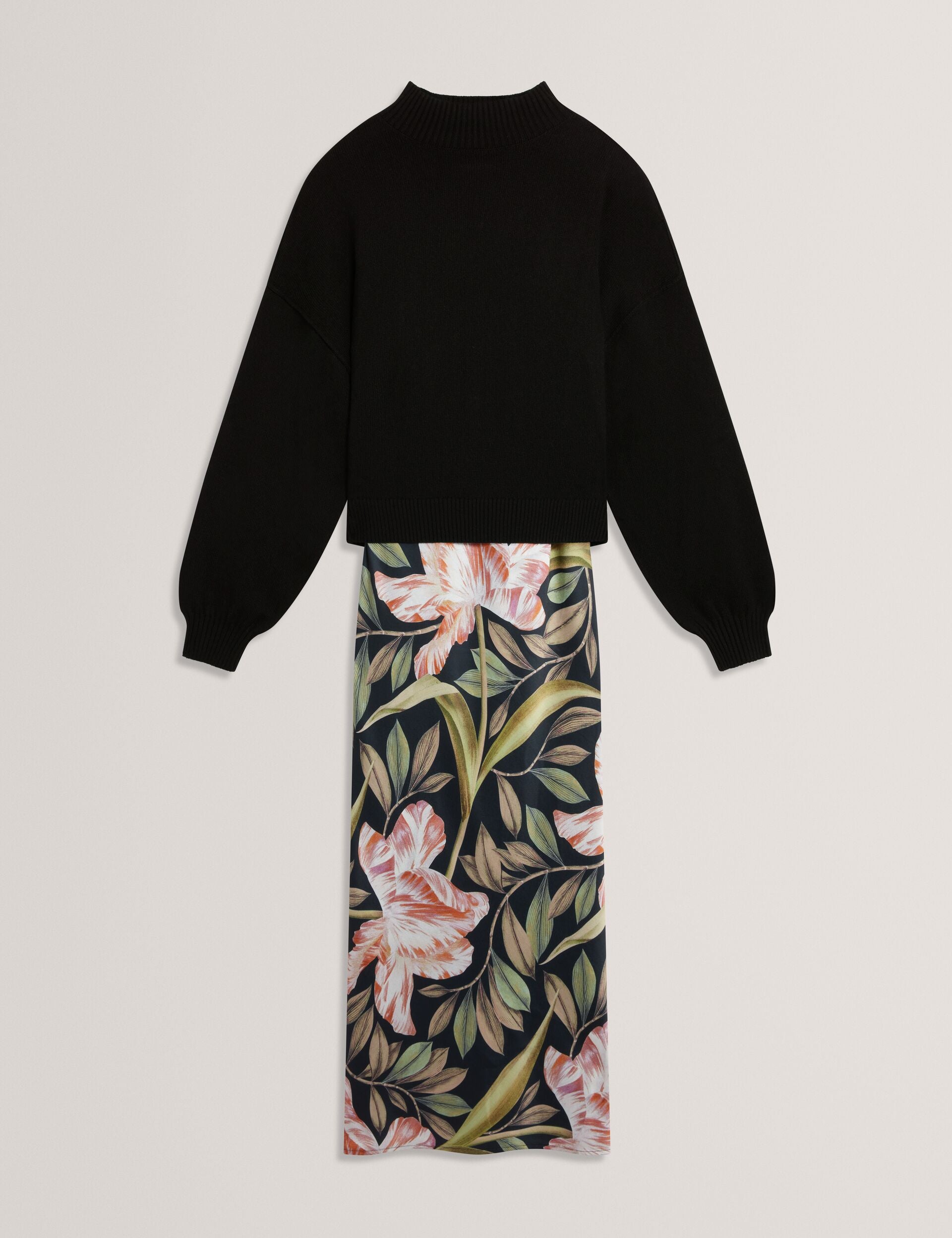 Take a statement floral print, layer on cosy knit, and you've got BERGNIA. The satin slip dress feels bold yet feminine with its painterly tulip print, and to make it even more versatile, we've added a detachable knit jumper for a relaxed layer of warmth.