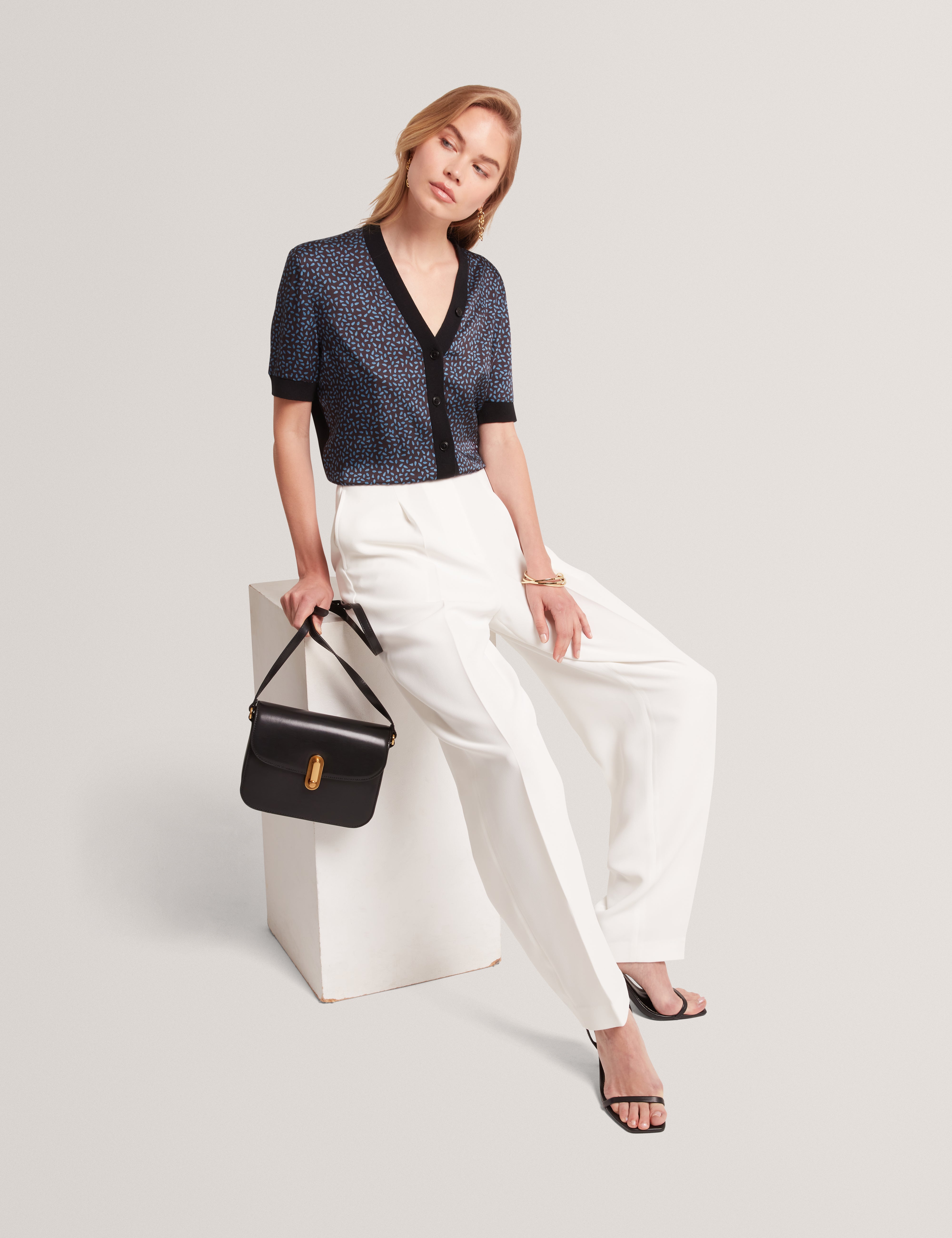- Cropped length with banded hem