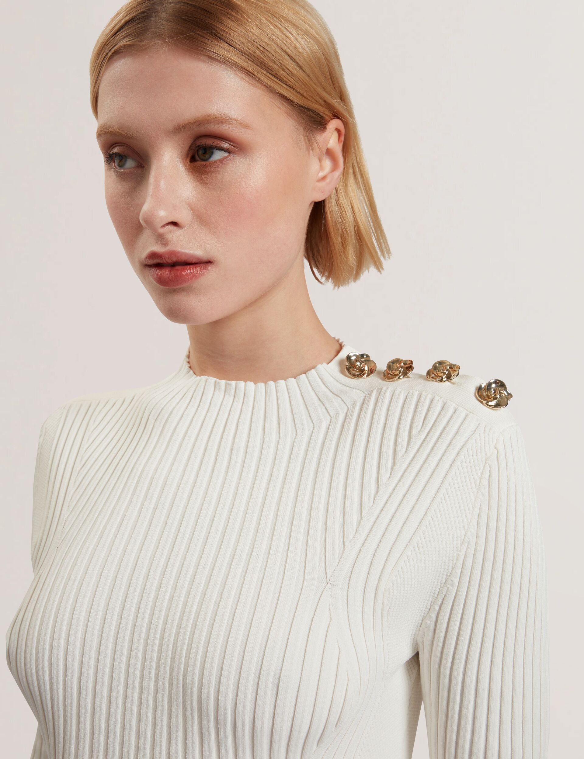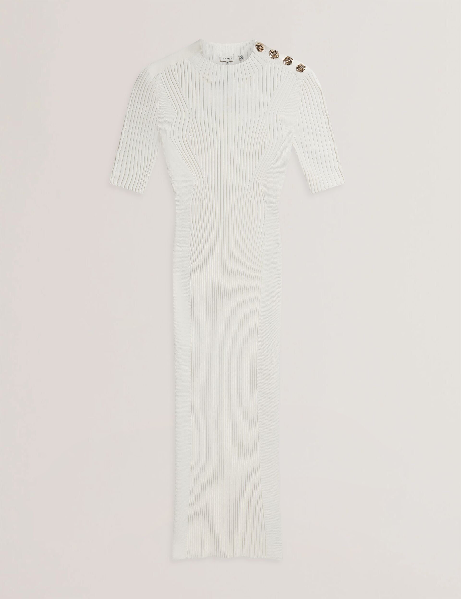 Meet CANDIIC: the elevated essential that's always in season. This bodycon dress hugs your figure with its sculpting knit fabric, elevated by the all-over ribbed texture and gold-tone rose buttons at the shoulder.
