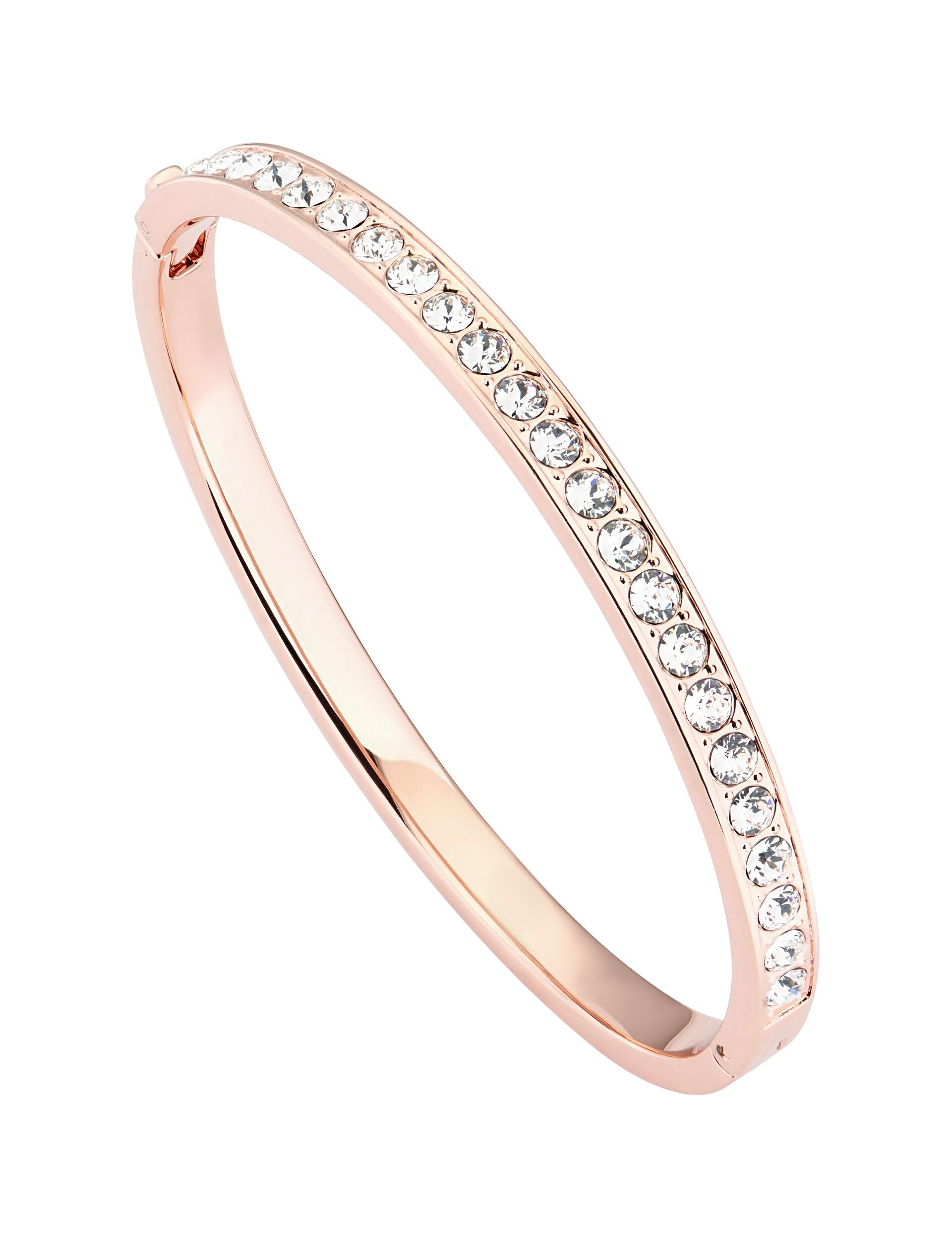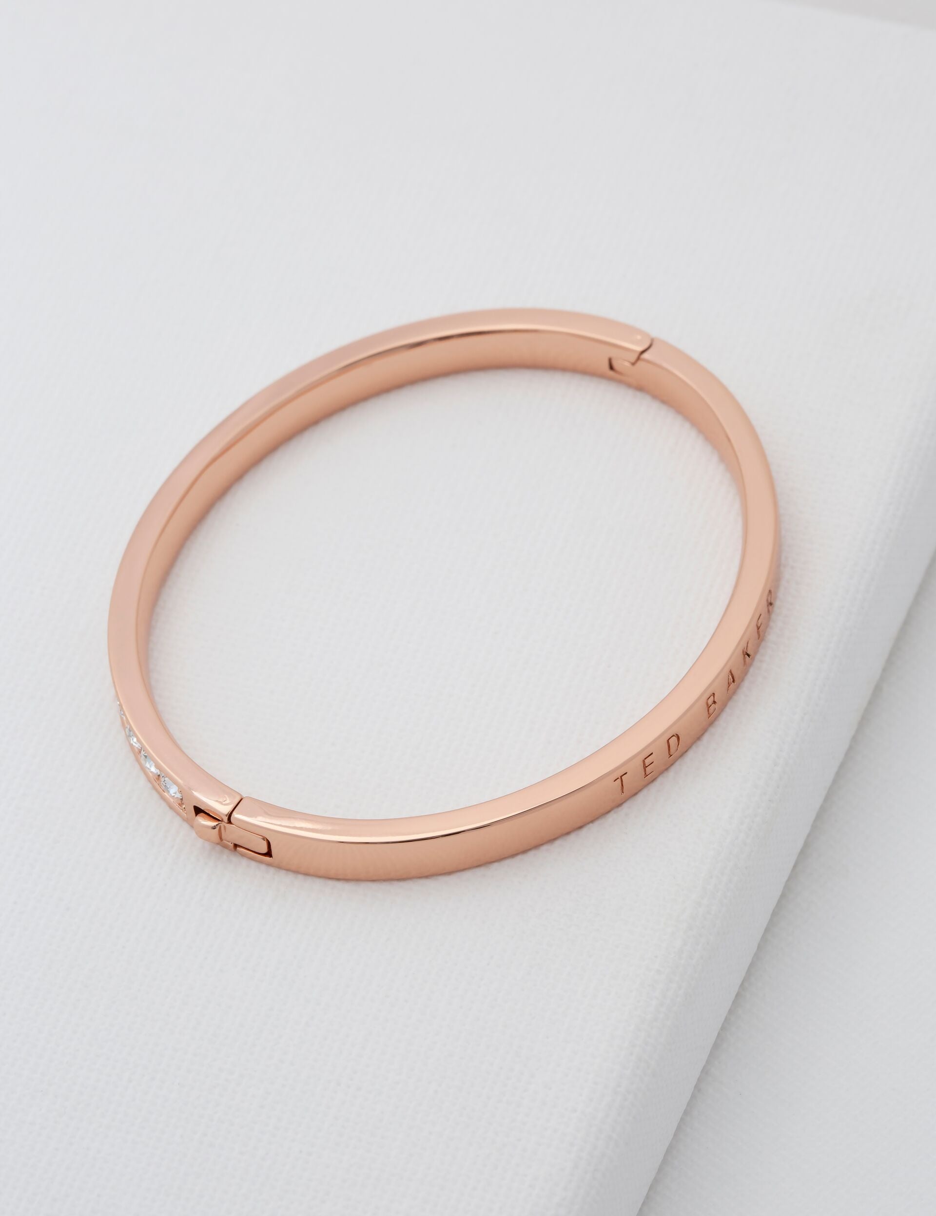 Featuring a row of crystals on one side and an engraved logo detail on the other, CLEMARA brings two elegant looks in one bracelet. This dainty bangle is a great piece for stacking or showcasing on its own, finished with an easy-to-use hinge closure.