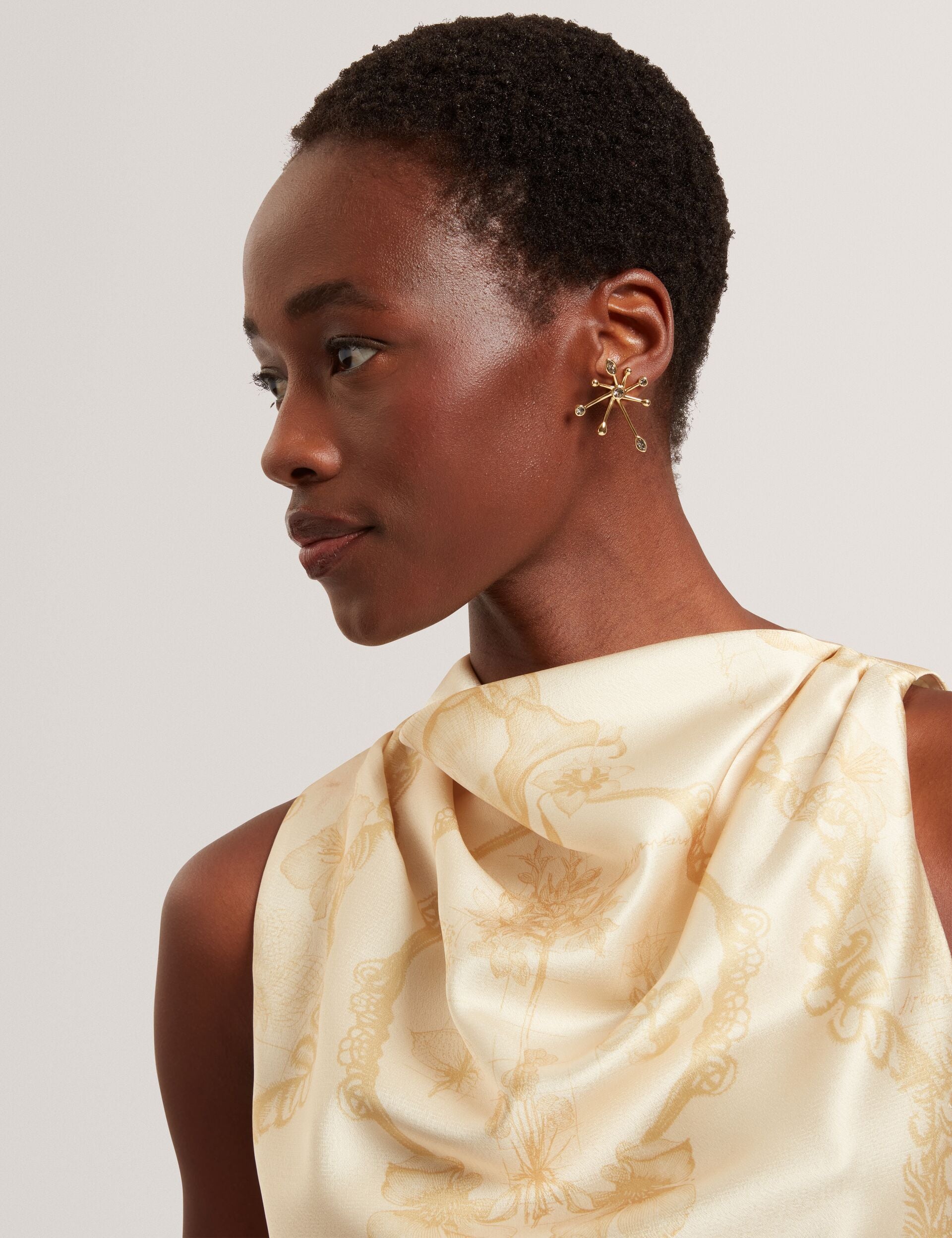 Featuring an ornate Nottingham lace-inspired print on a light yellow satin, COBLA makes an effortlessly feminine statement. Pair this drape neck top with your favourite jeans or tailored trousers.