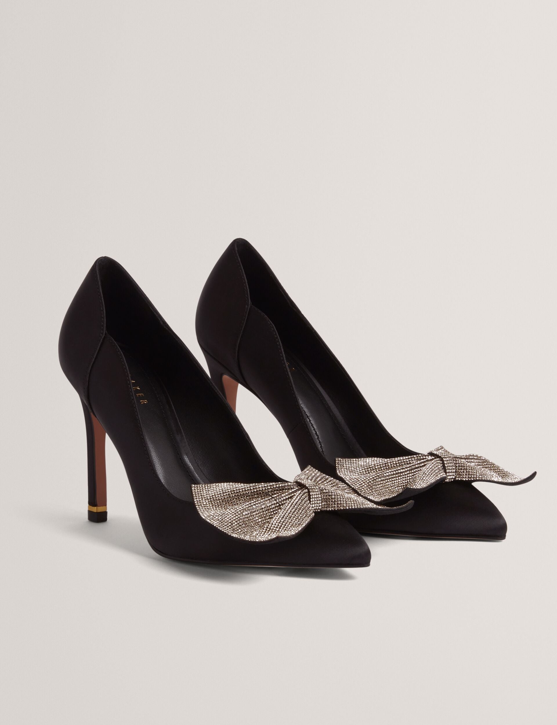 Elegance with a touch of sparkle. The CRIISTI pointed court shoes feature a sleek satin finish and slim stiletto heel, embellished with a statement rhinestone bow at the toe for refined glamour.