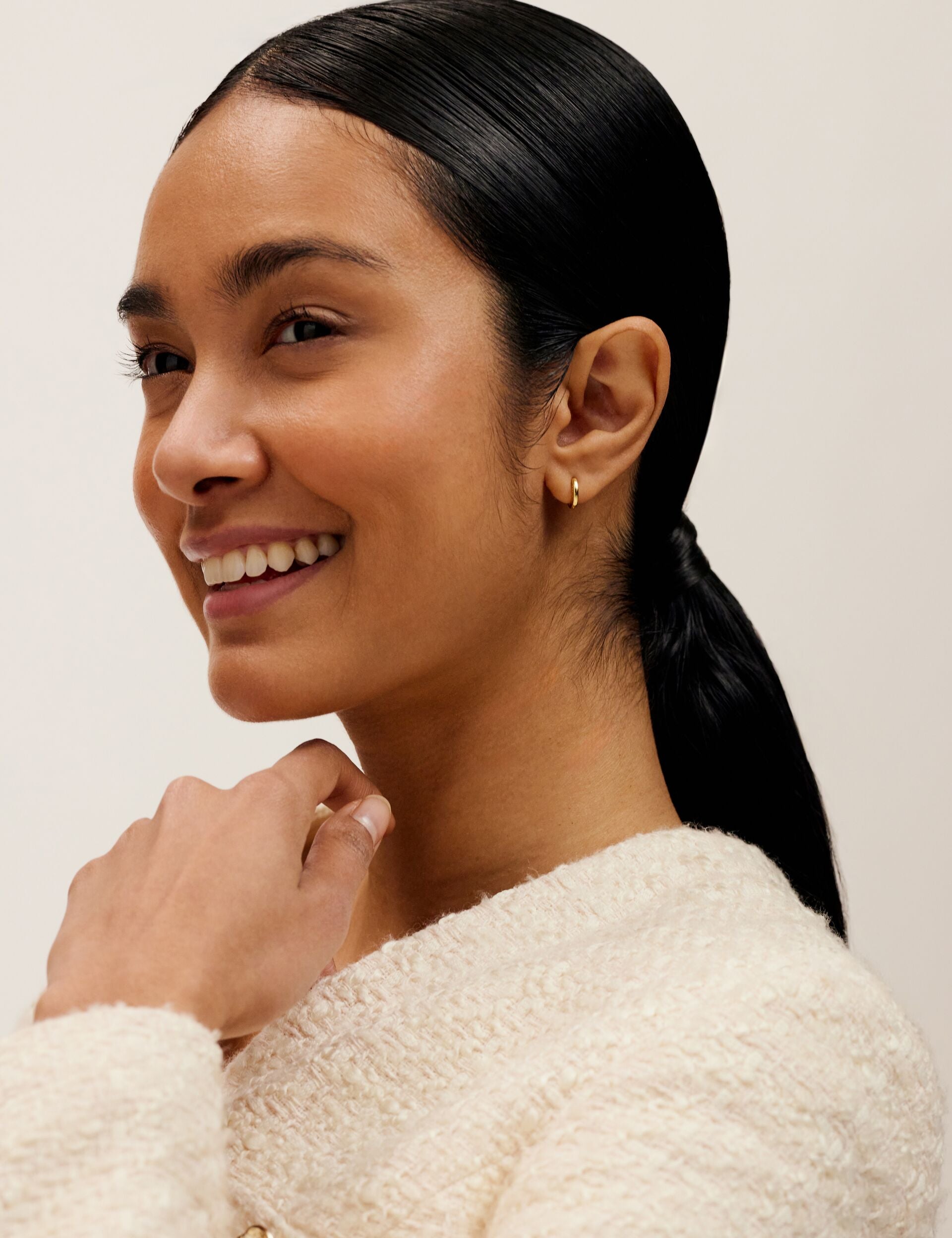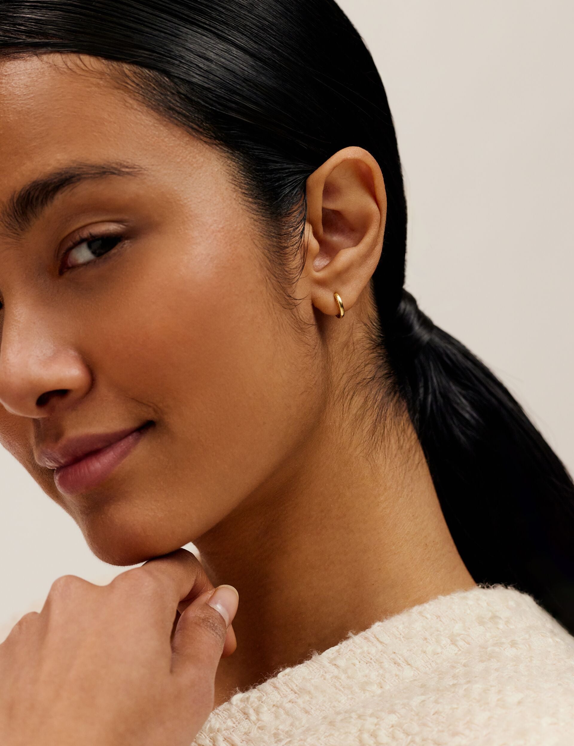 Add a dainty pair of hoops to your jewellery repertoire with CRISETE. Made in a huggie style, these classic earrings feature an engraved logo detail for that contemporary touch. Wear on their own for a sleek look, or make them a staple for your earring stacks.