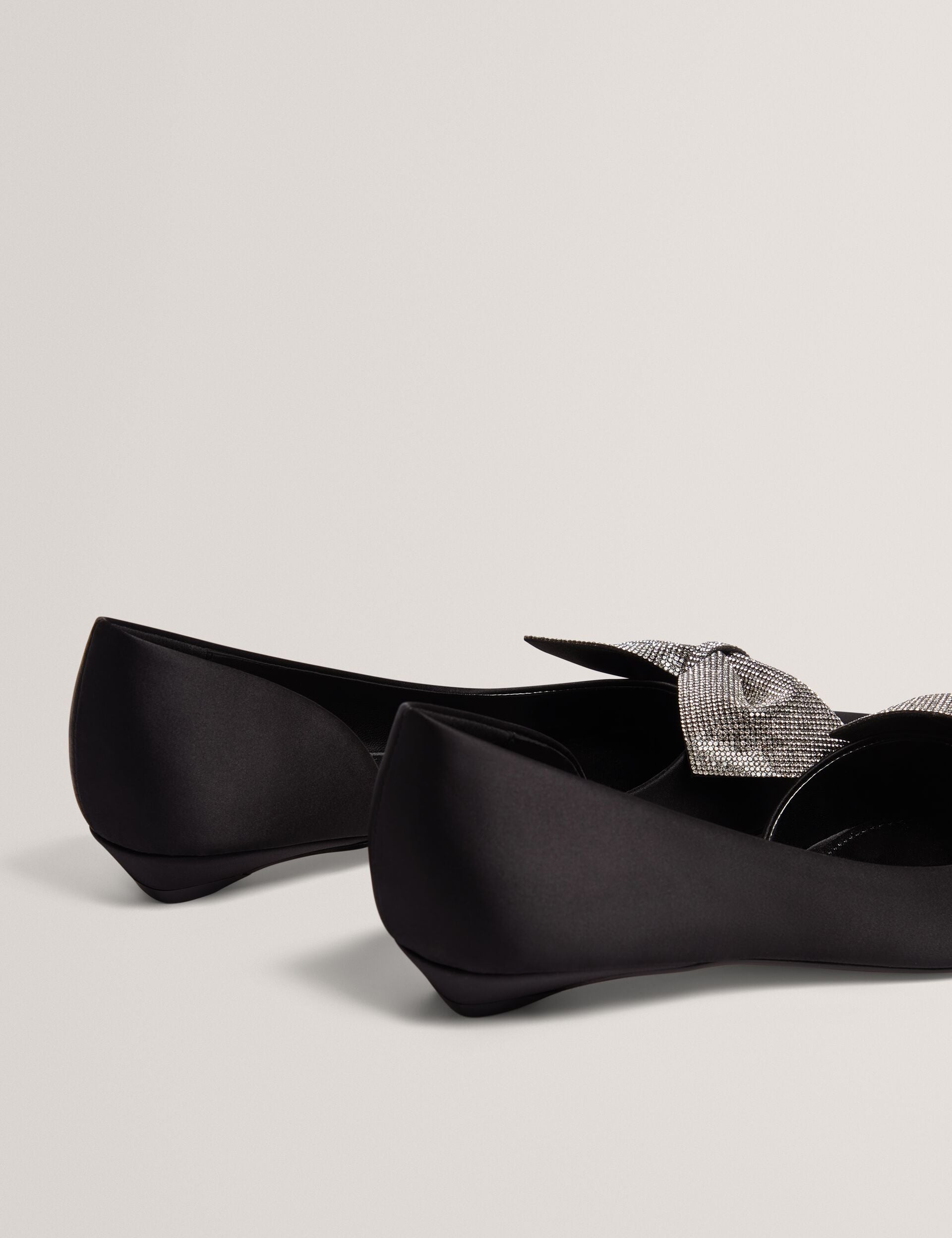 Delicate yet dazzling, the CRISSLY kitten heels feature a sparkling rhinestone bow atop a sleek satin fabric. Designed in a pointed toe silhouette, these shoes are feminine elegance with a luxe finish.
