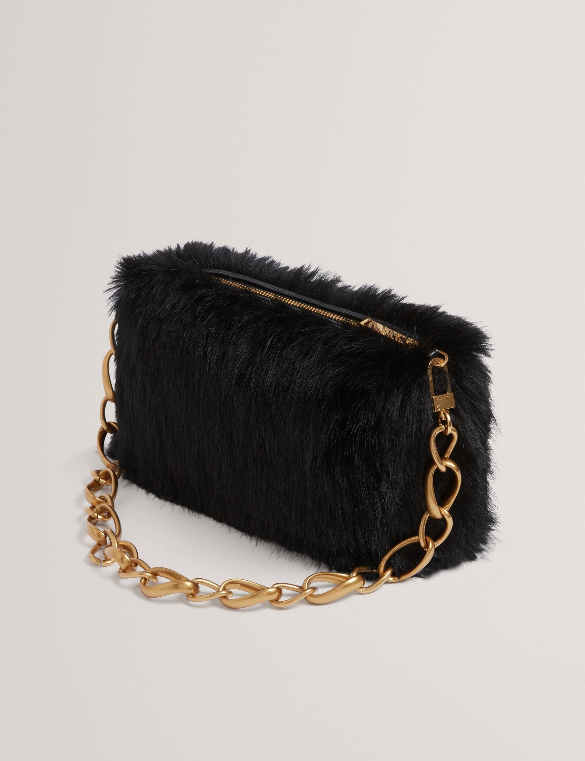 Soft, snug, and seriously stylish. The CUDDLES clutch brings texture to your look with plush faux fur and a sleek baguette shape, finished with a gold tone chain strap for that extra touch of glam and hands-free wear.