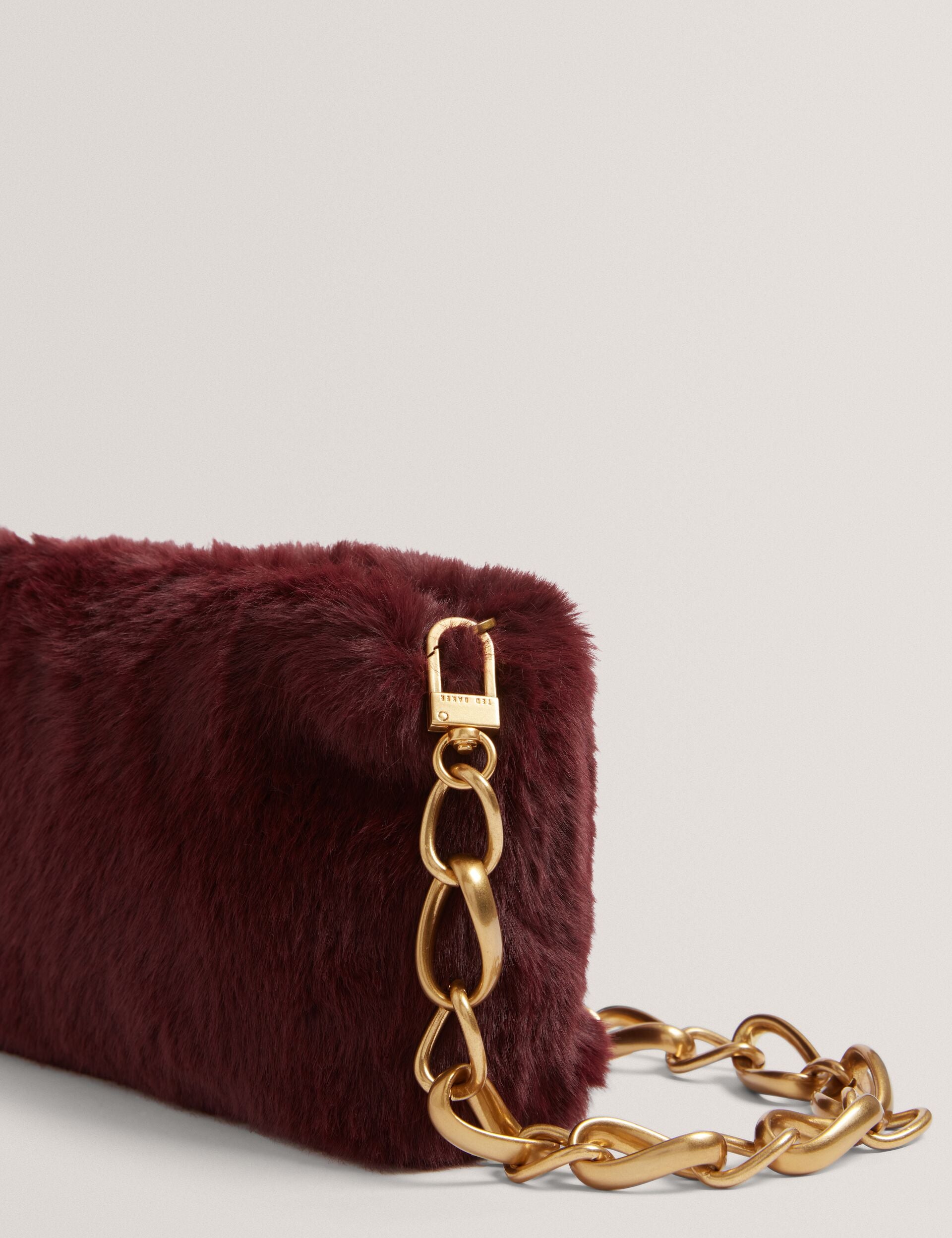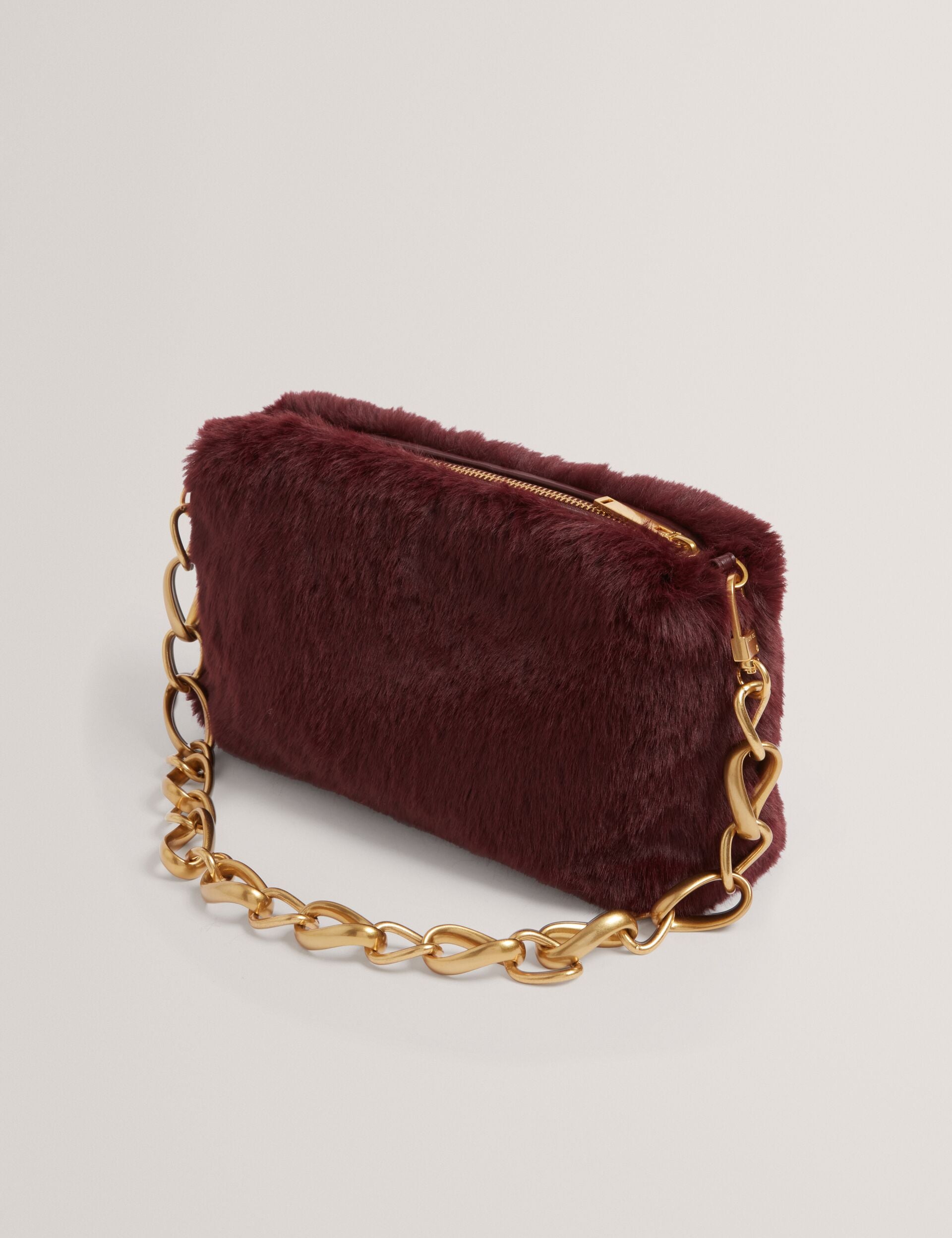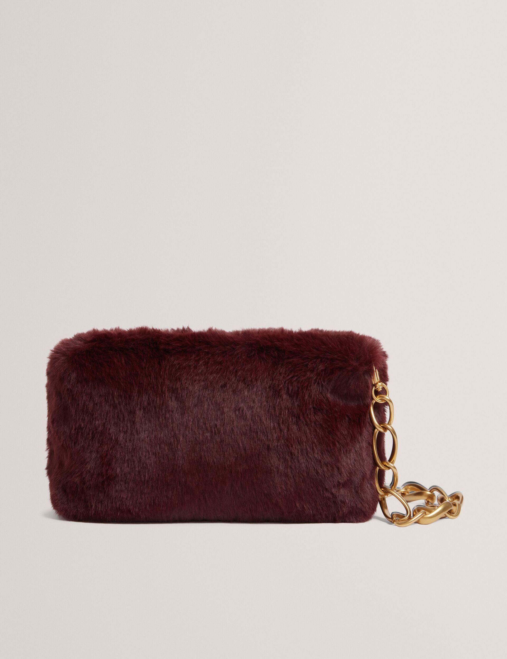 Soft, snug, and seriously stylish. The CUDDLES clutch brings texture to your look with plush faux fur and a sleek baguette shape, finished with a gold tone chain strap for that extra touch of glam and hands-free wear.