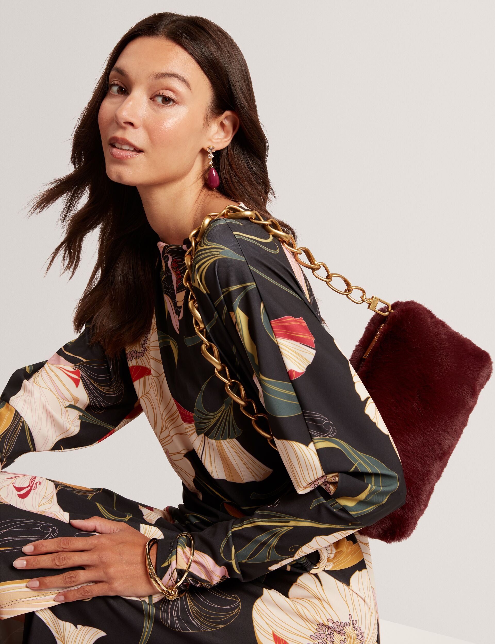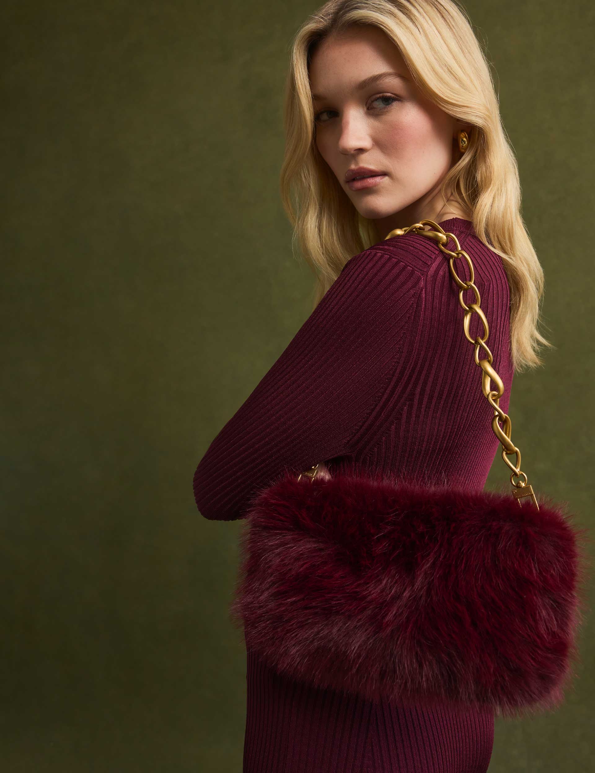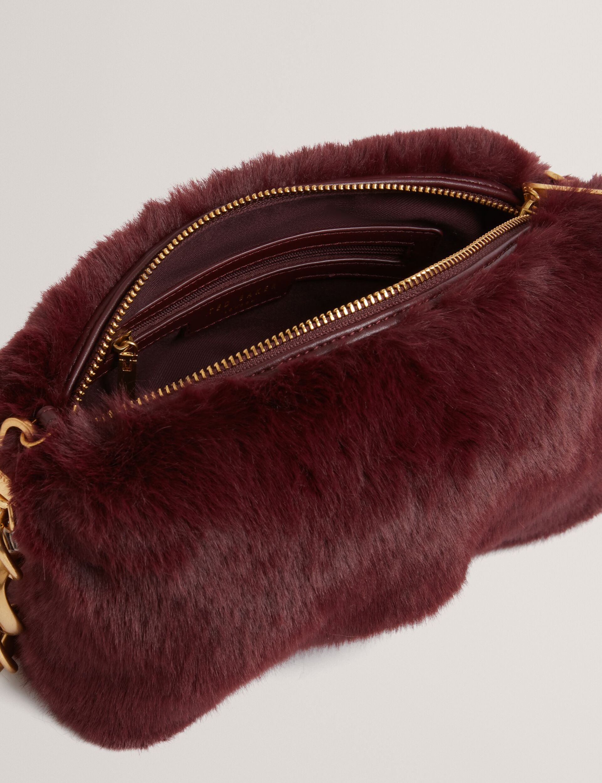 Soft, snug, and seriously stylish. The CUDDLES clutch brings texture to your look with plush faux fur and a sleek baguette shape, finished with a gold tone chain strap for that extra touch of glam and hands-free wear.