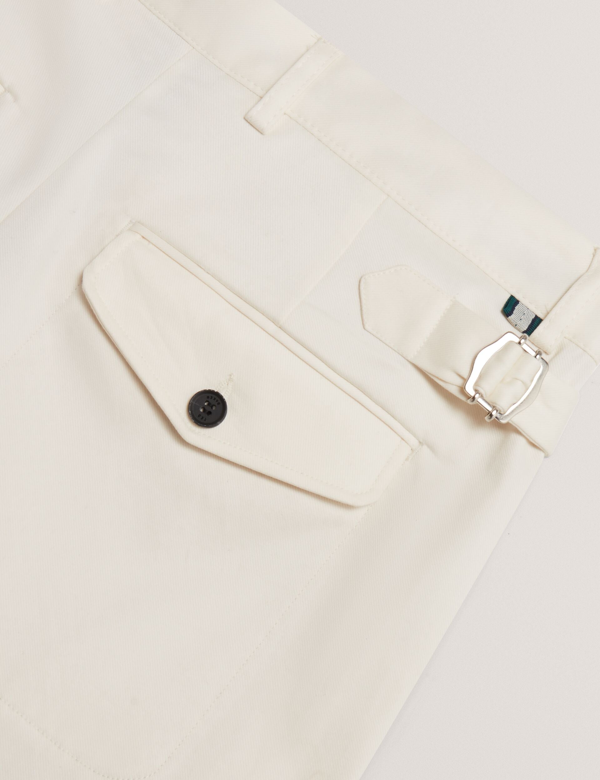 - Buttoned flap back pockets