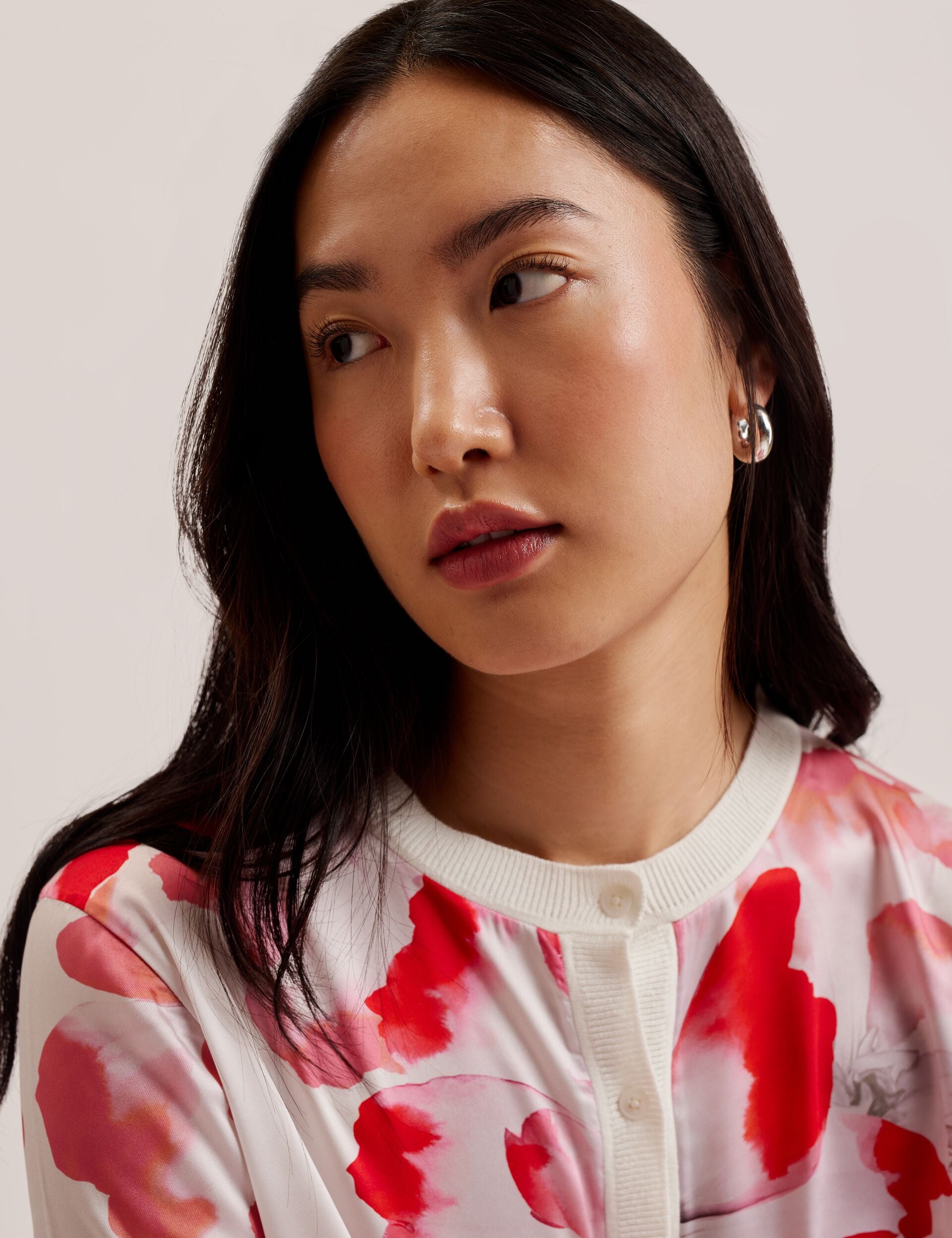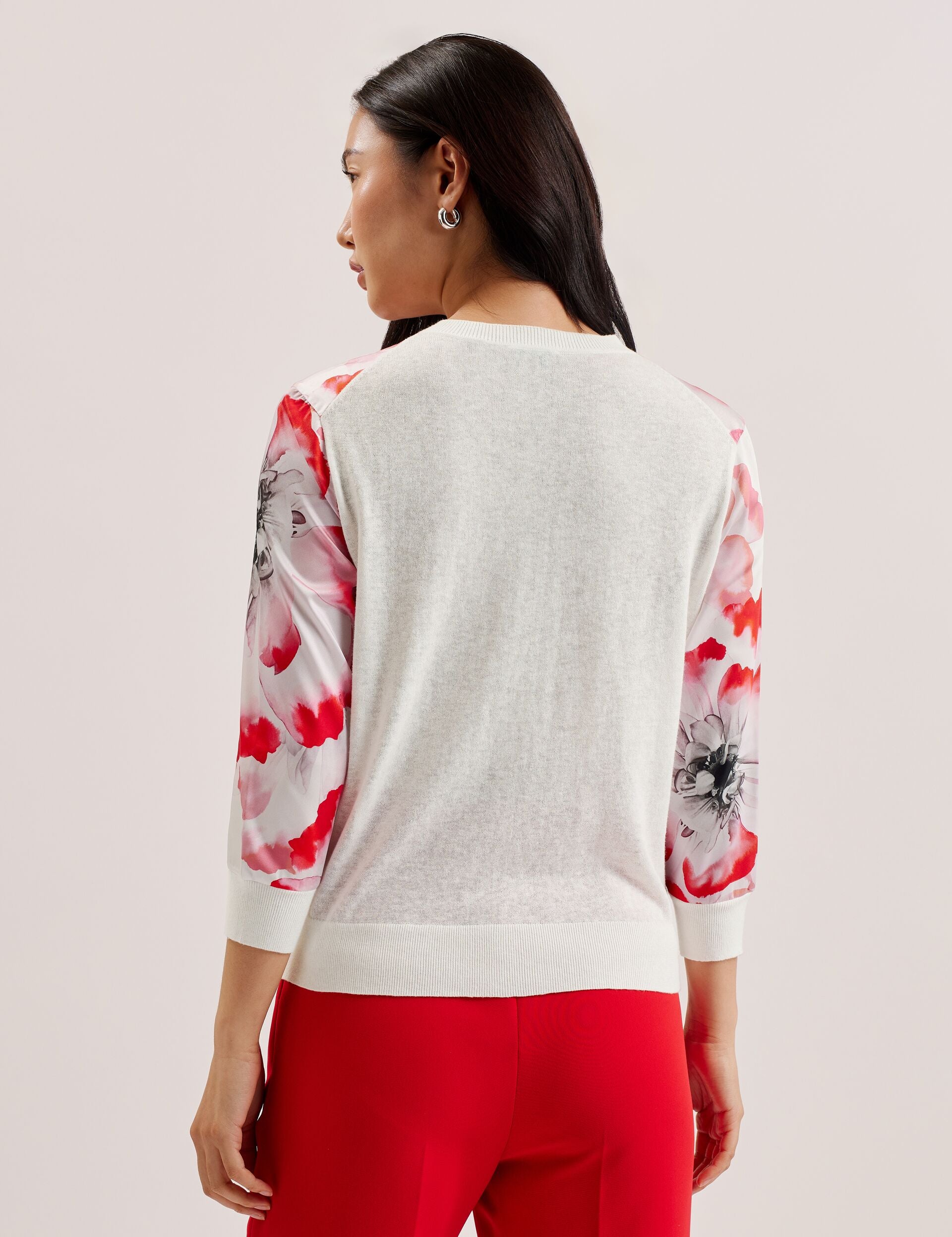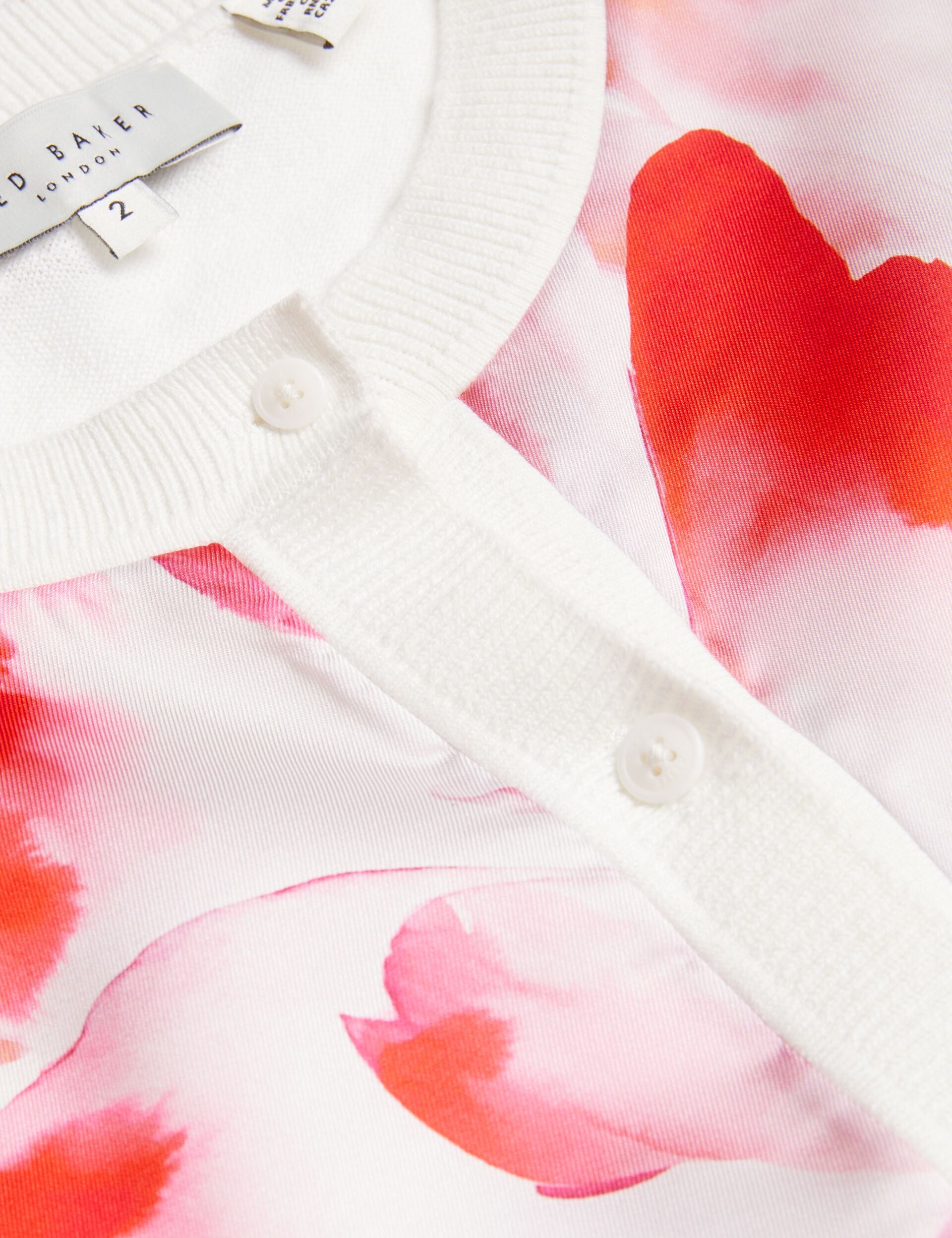 - Woven front with floral print