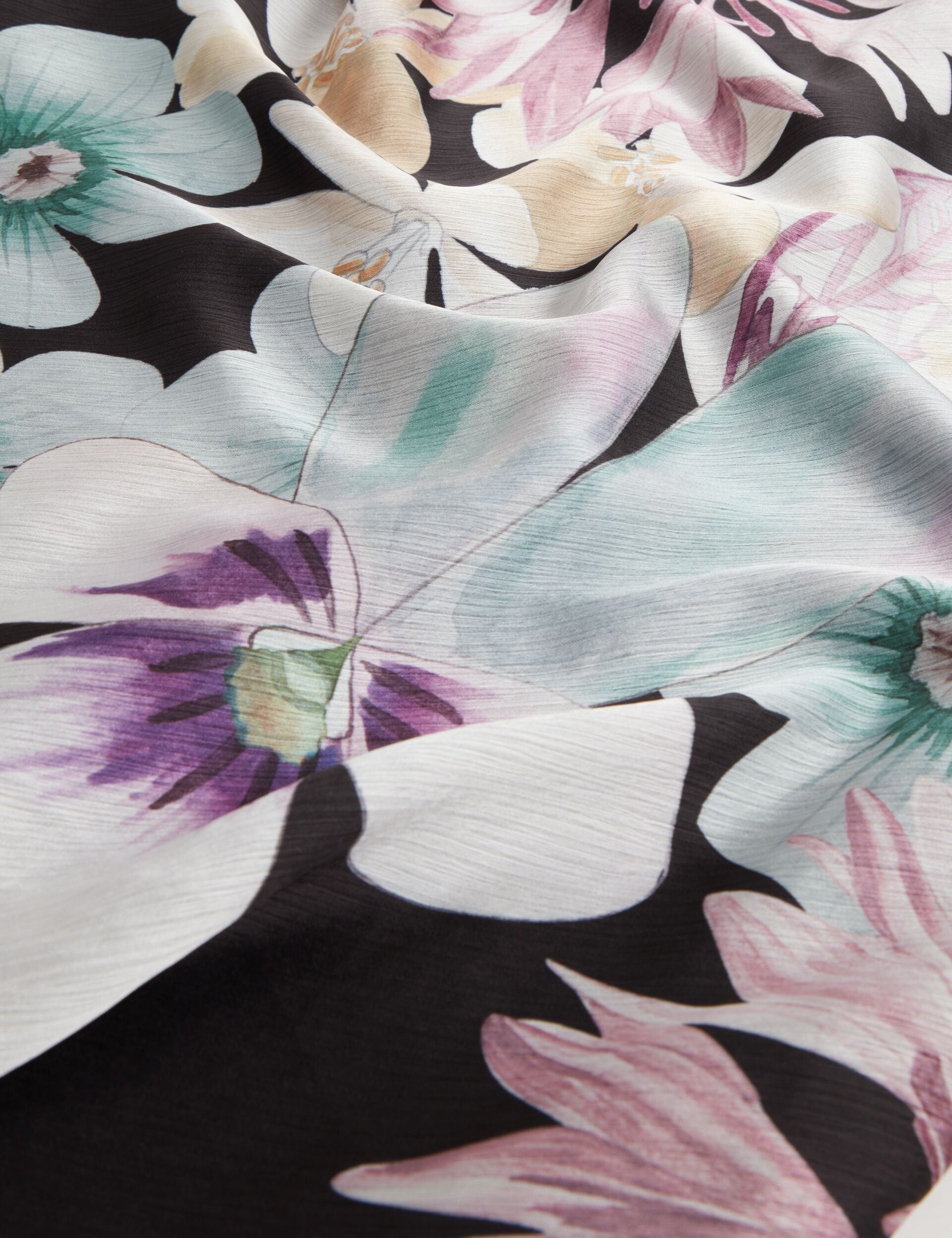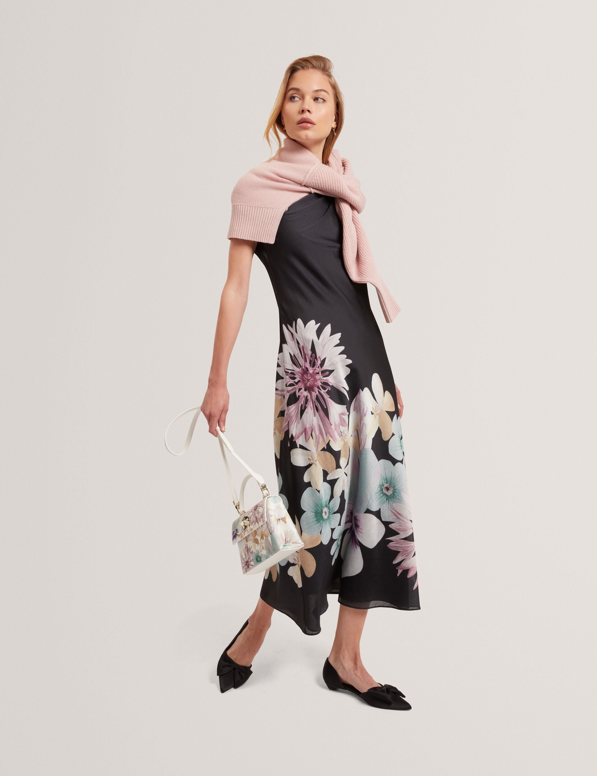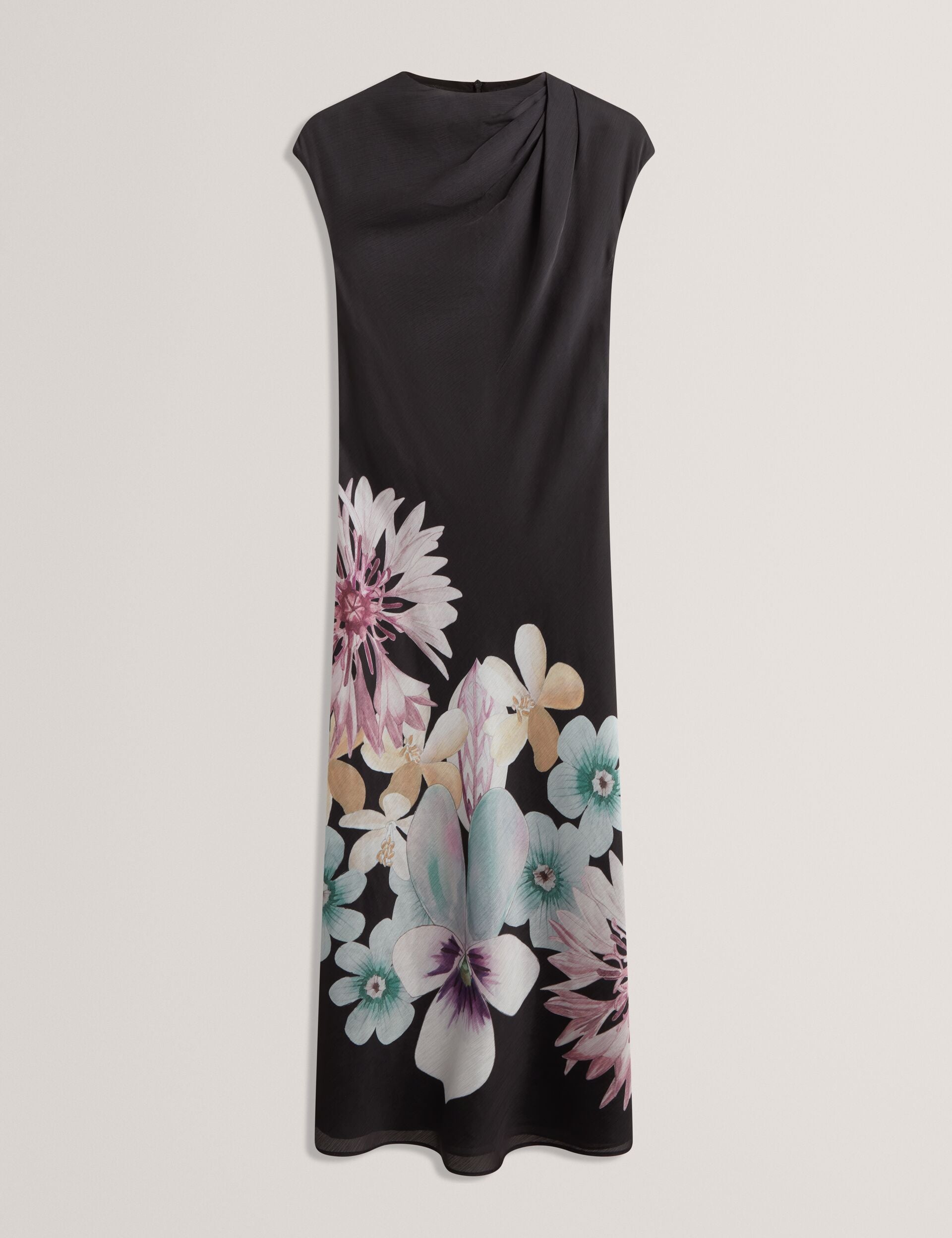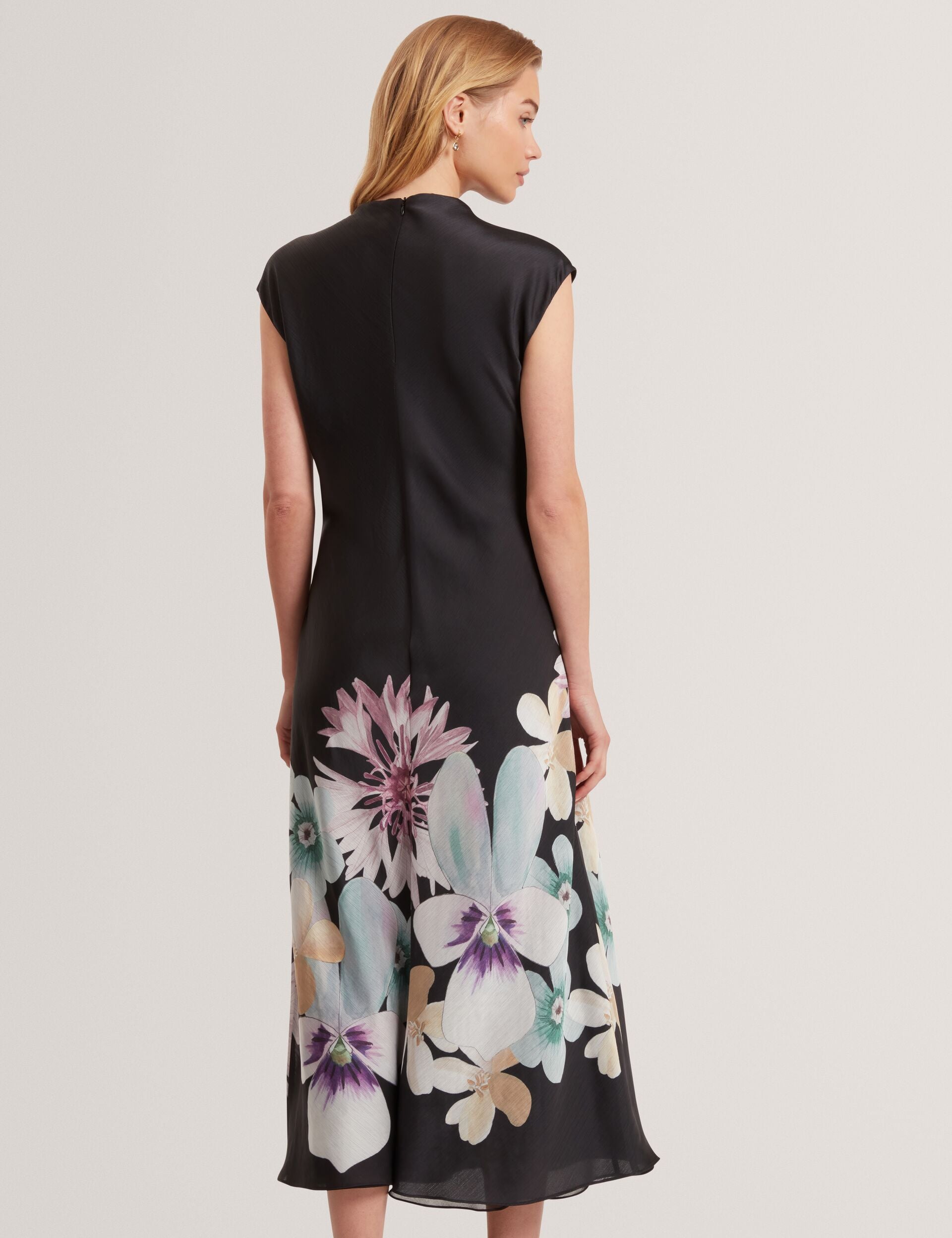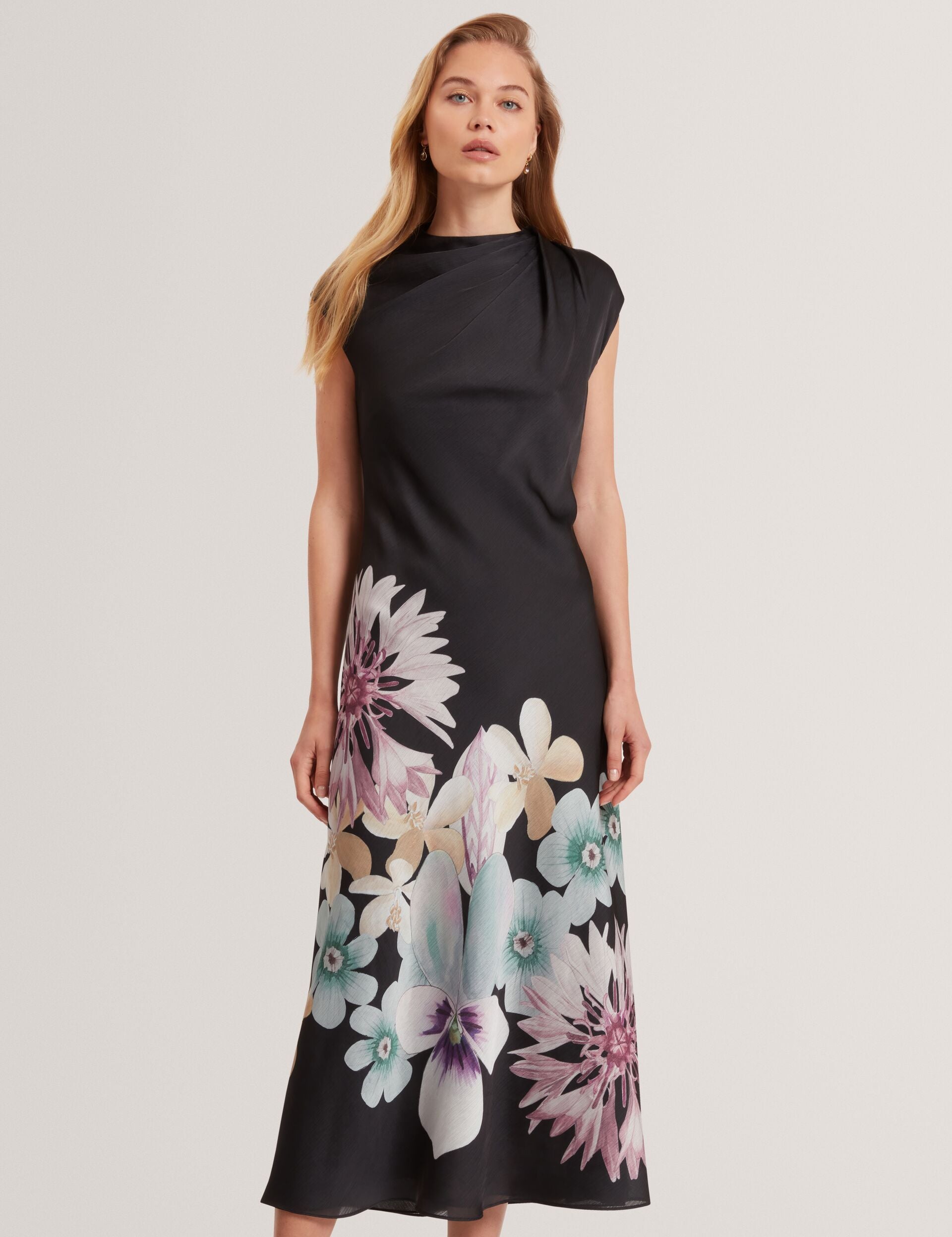 Pretty meets polished in the DEMITA midi dress, featuring a soft pastel floral design printed on an elegant black crepe chiffon. The column silhouette creates flattering clean lines, whilst the draped neckline adds volume in the right places.
