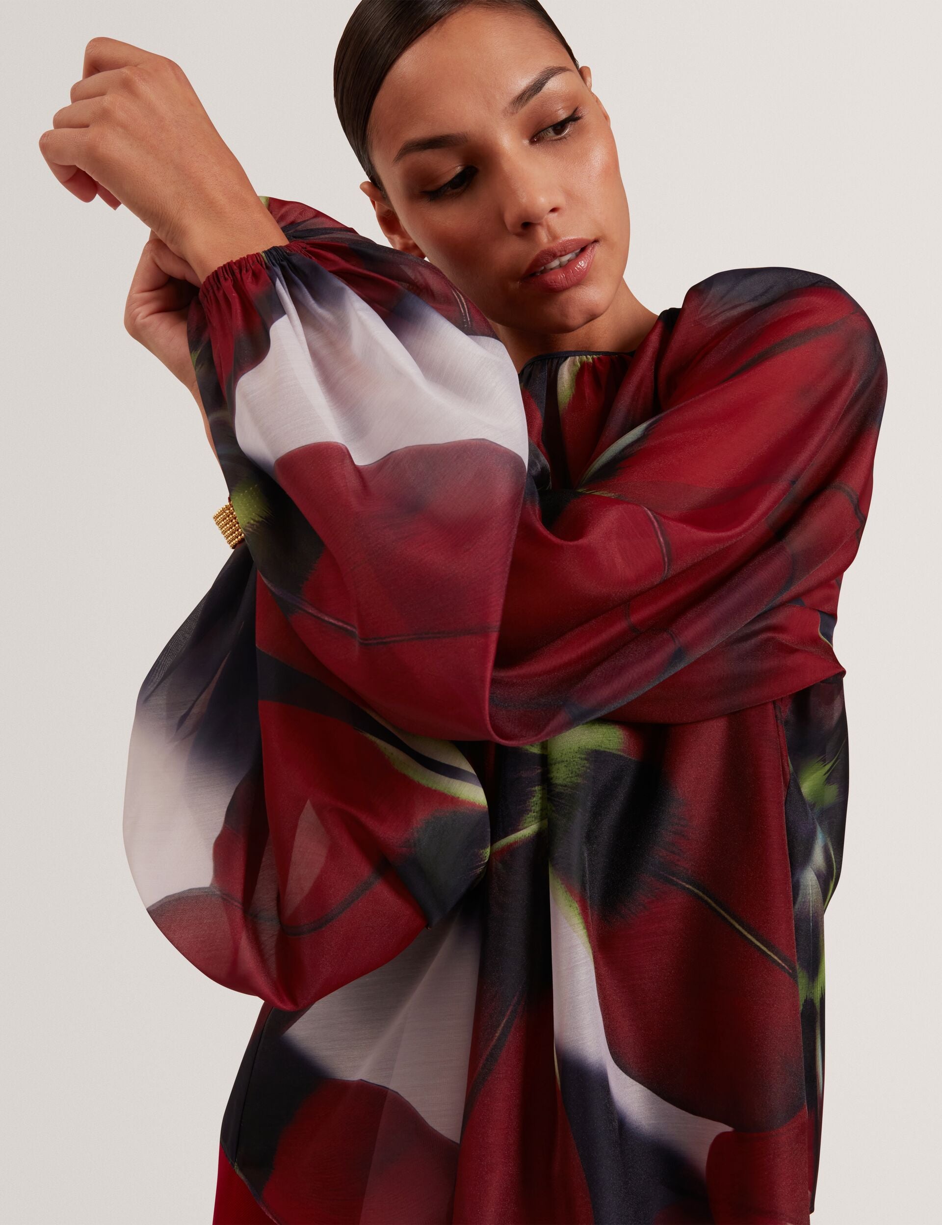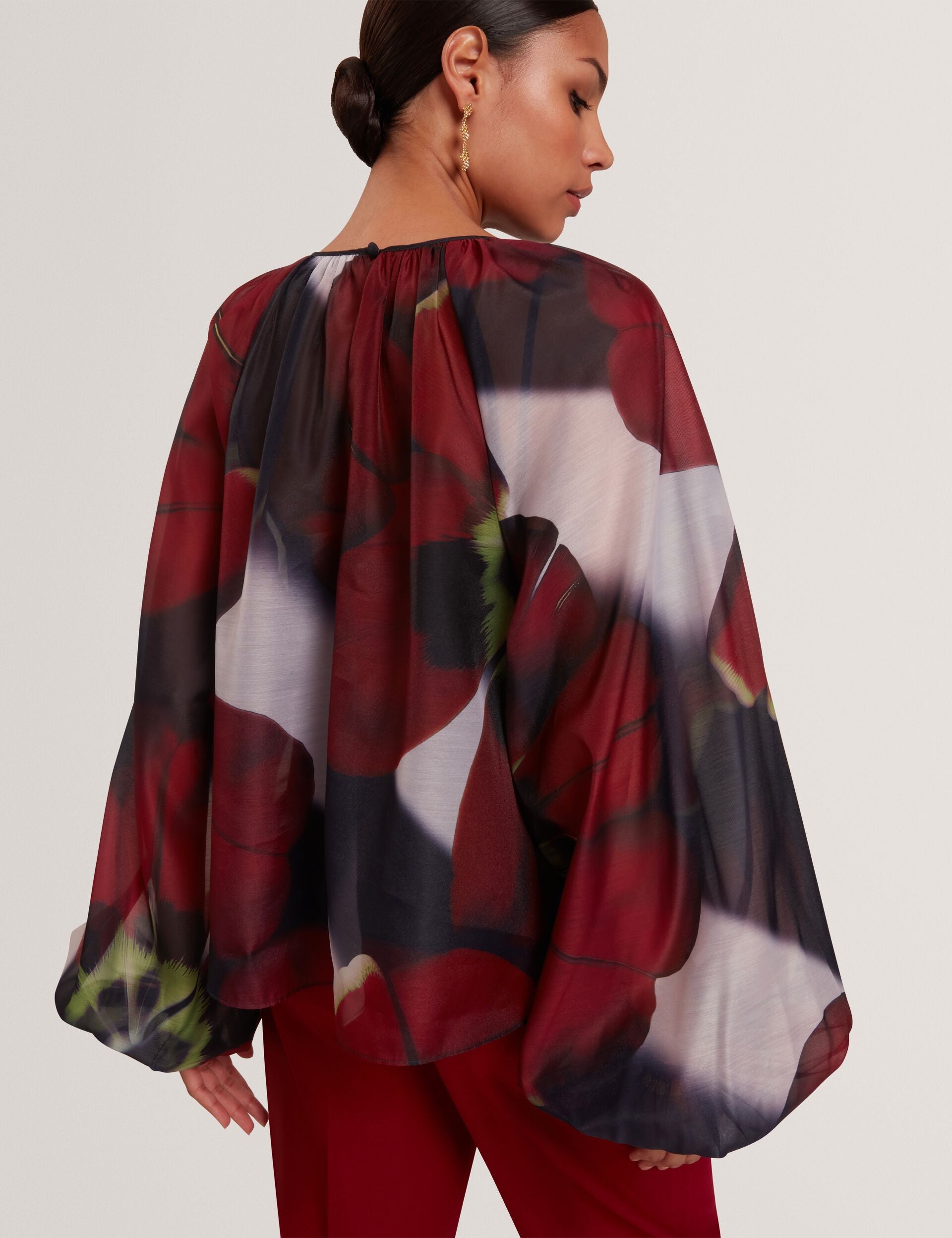 Red Bloom Organza Balloon Sleeve Blouse