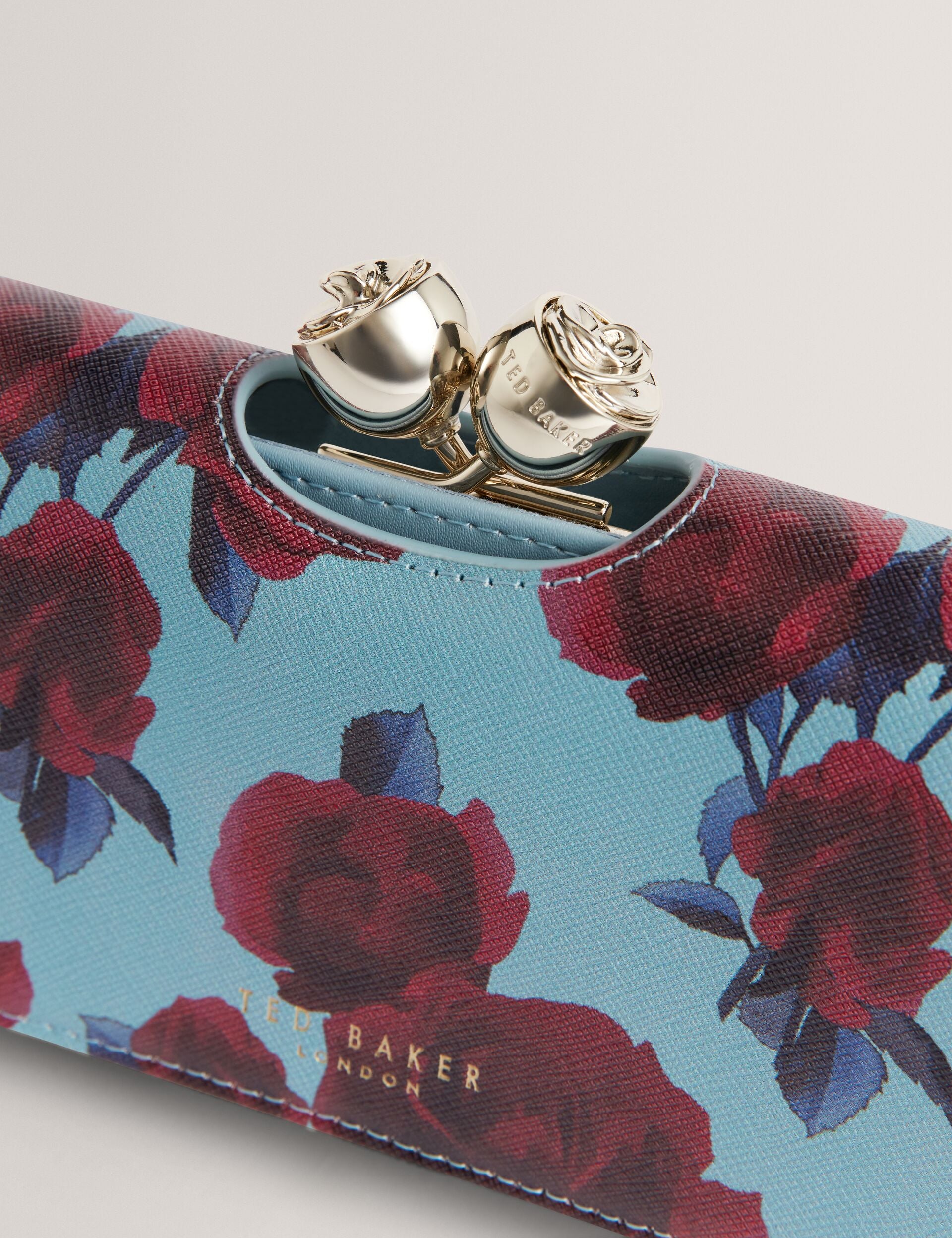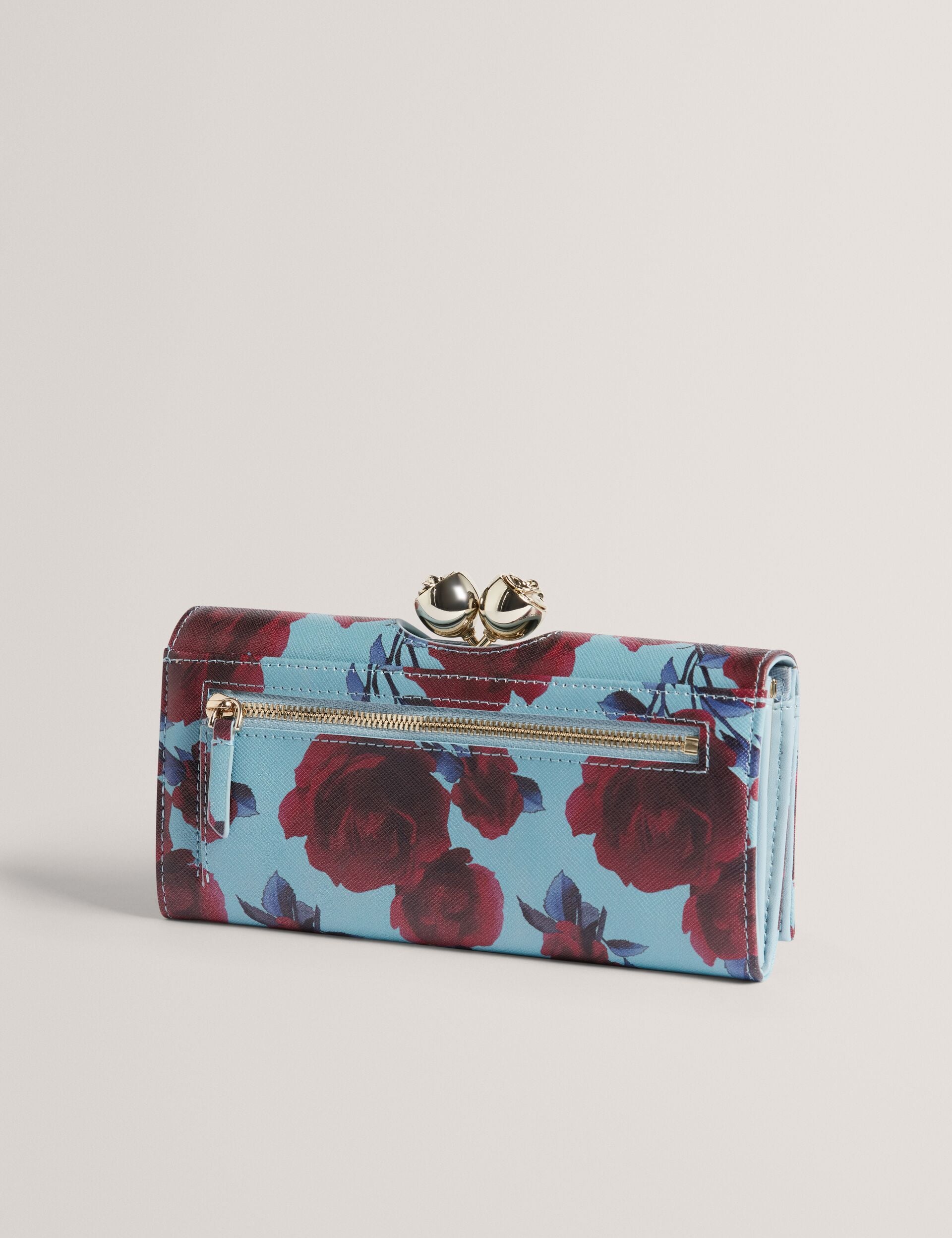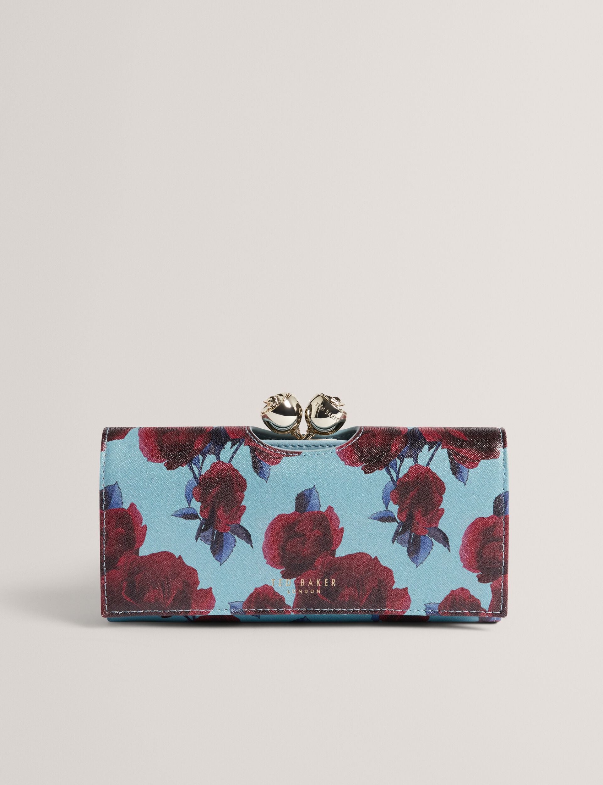 Crafted from saffiano texture leather and printed with a deep red rose motif, the ELLRIE large purse combines heritage charm with signature Ted Baker style. Because we love detail, the gold-tone bobble clasps are shaped into roses design for a polished yet sweet touch.