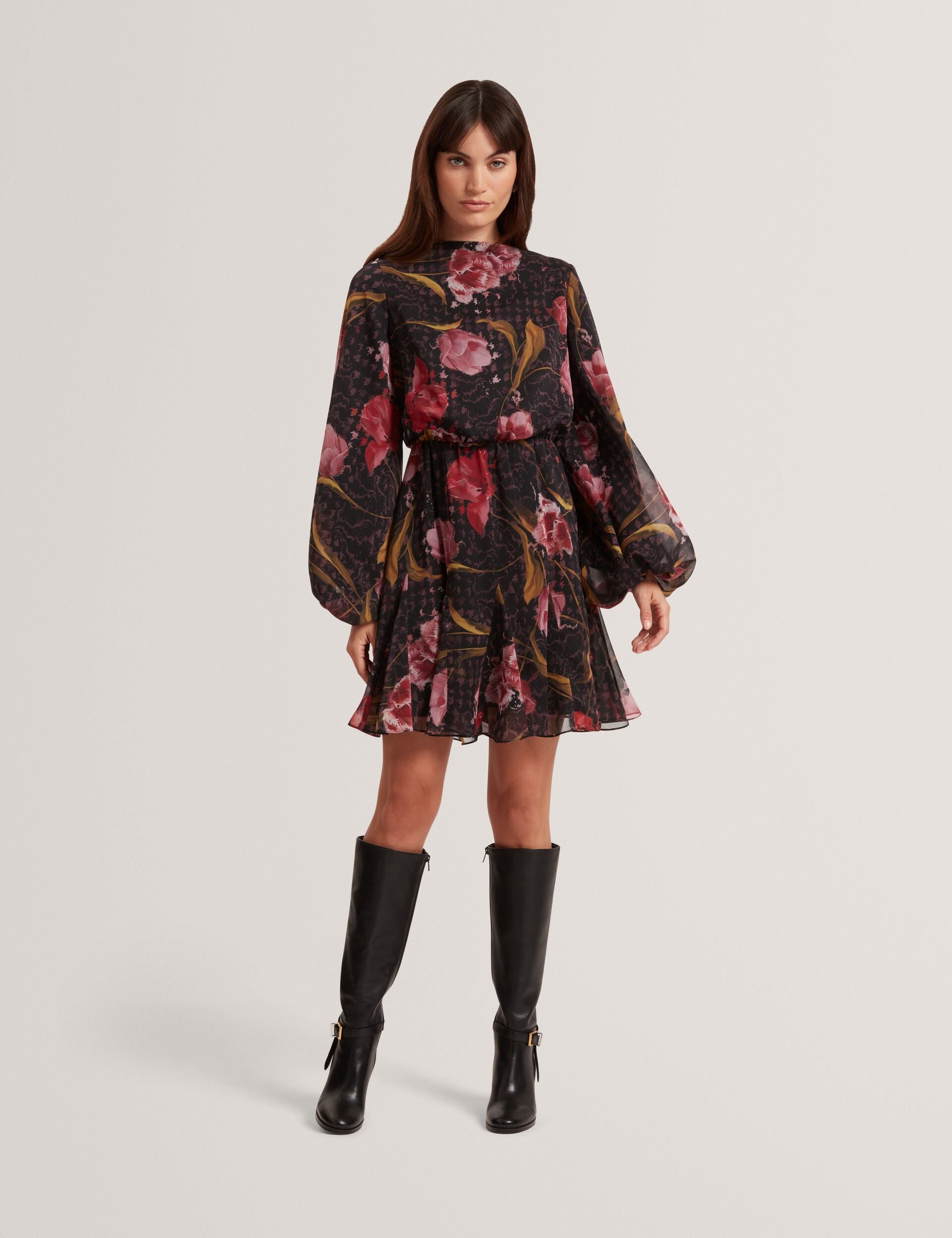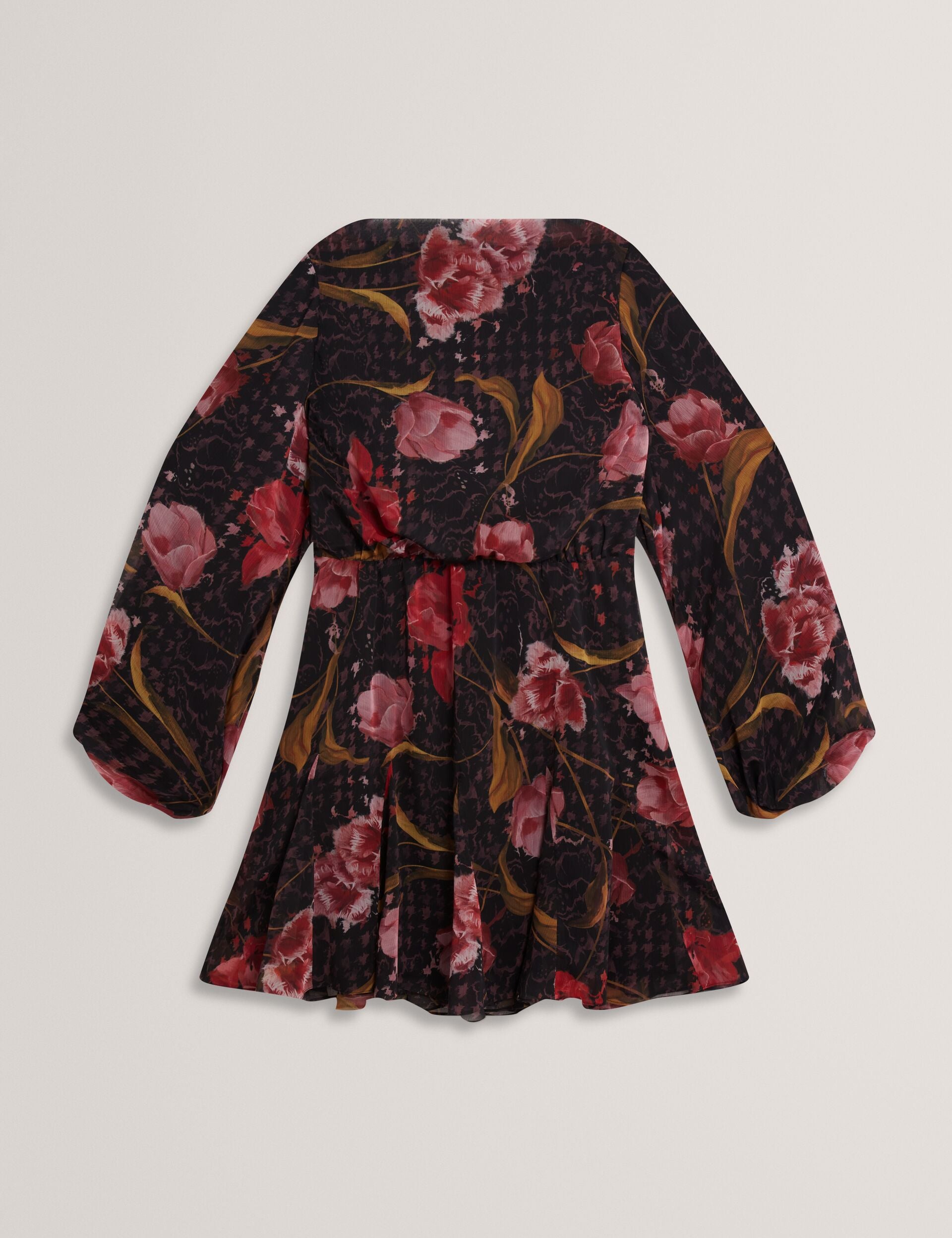 With voluminous balloon sleeves, a flowy skirt and our signature floral check print, the ENDRINA mini dress makes an effortlessly feminine statement. Crepe chiffon fabric moves like a dream, gathered waist for a silhouette that flatters.