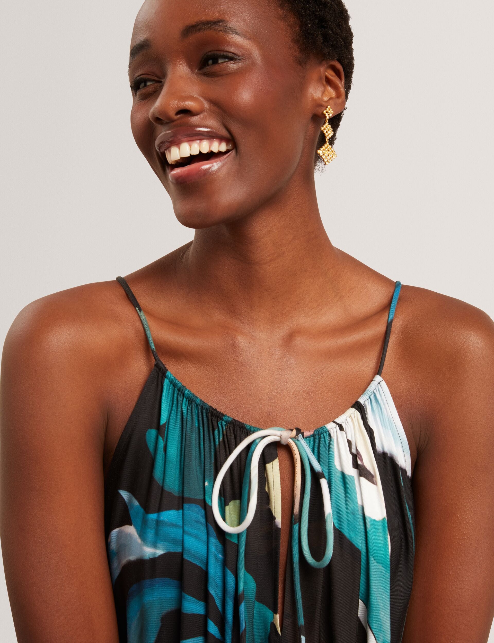 - Gathered neckline with front tie