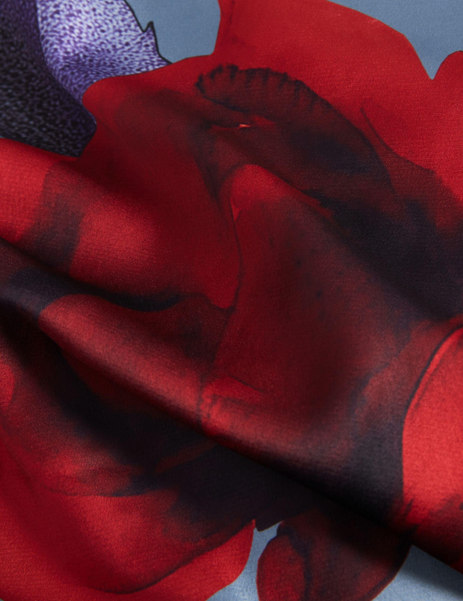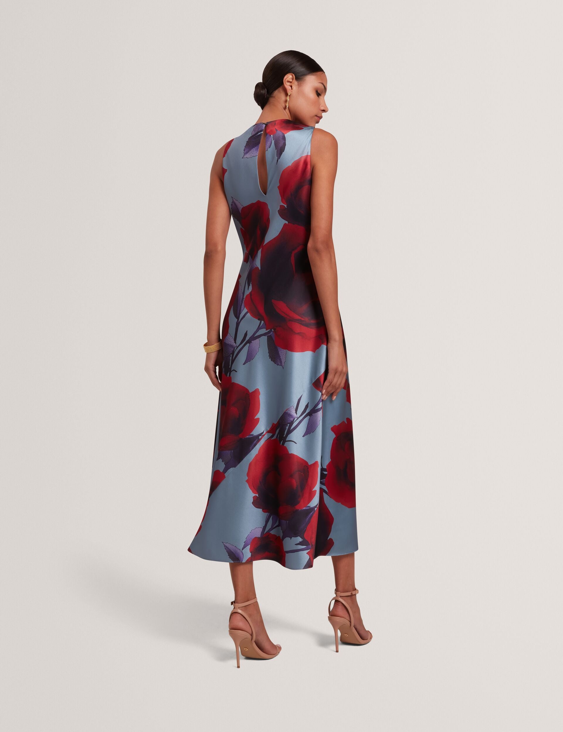 Have your modern romance moment in the HARRLIA sleeveless midi dress, featuring a dark red rose print that pops against soft blue satin fabric. Designed in a bias cut silhouette with a delicately draped neckline, its elegance is undeniable.