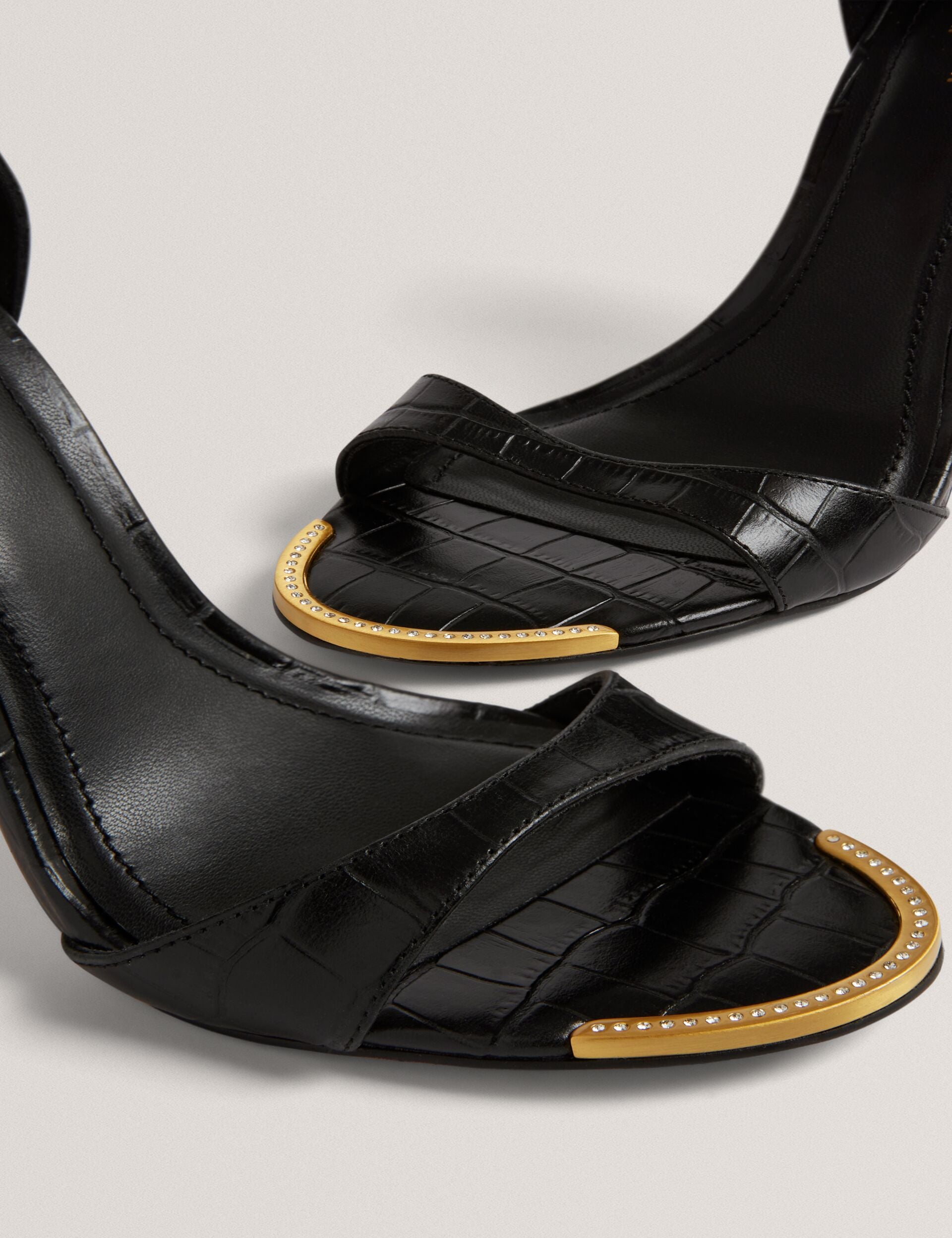 Crafted from a croc texture leather with a sleek stiletto heel, the HELLIY sandals offer elevated style and effortless sophistication for day or evening, plus the crystal hardware bar detail at the toe adds a sparkle to your step.