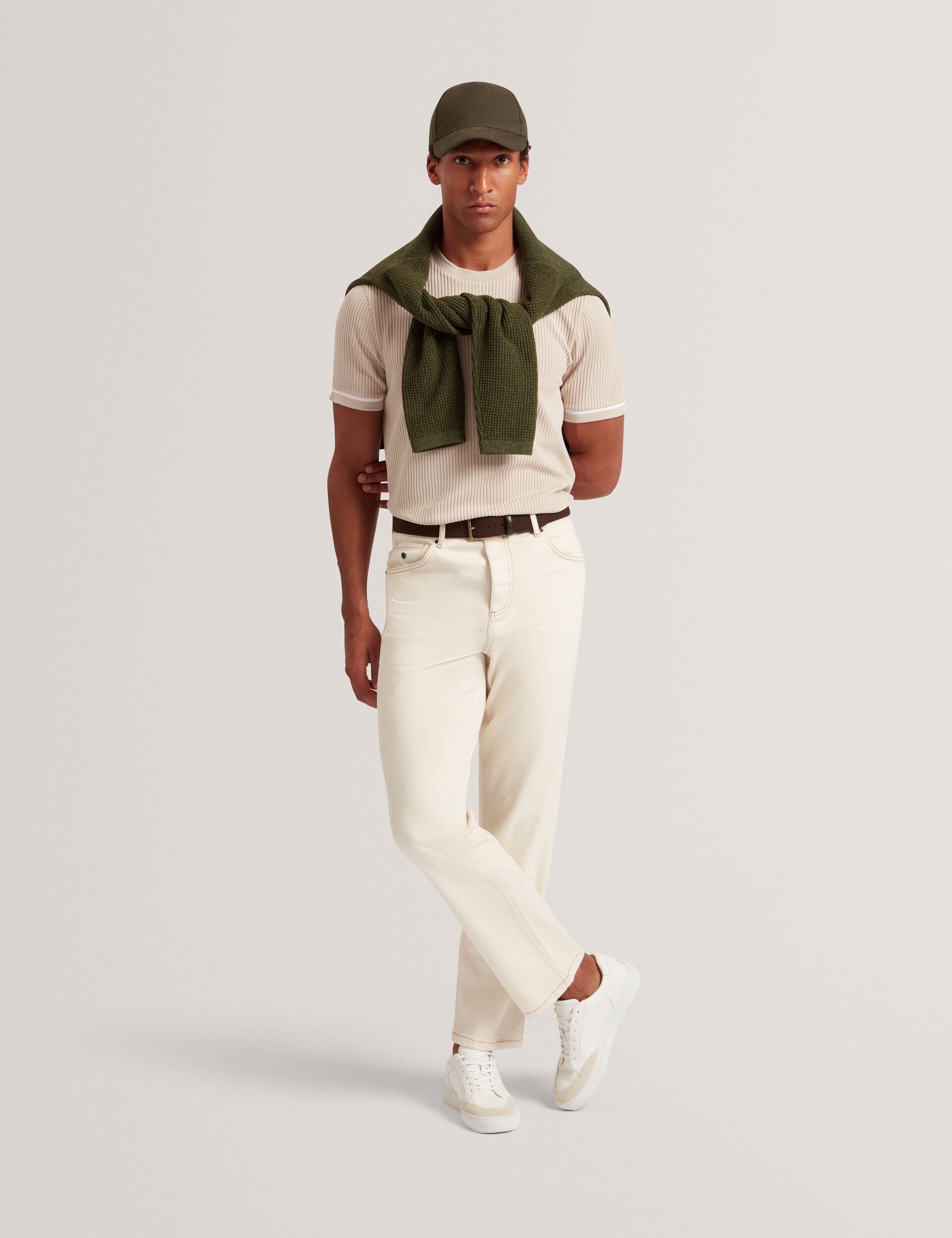 - Block stripe trim at cuffs and hem