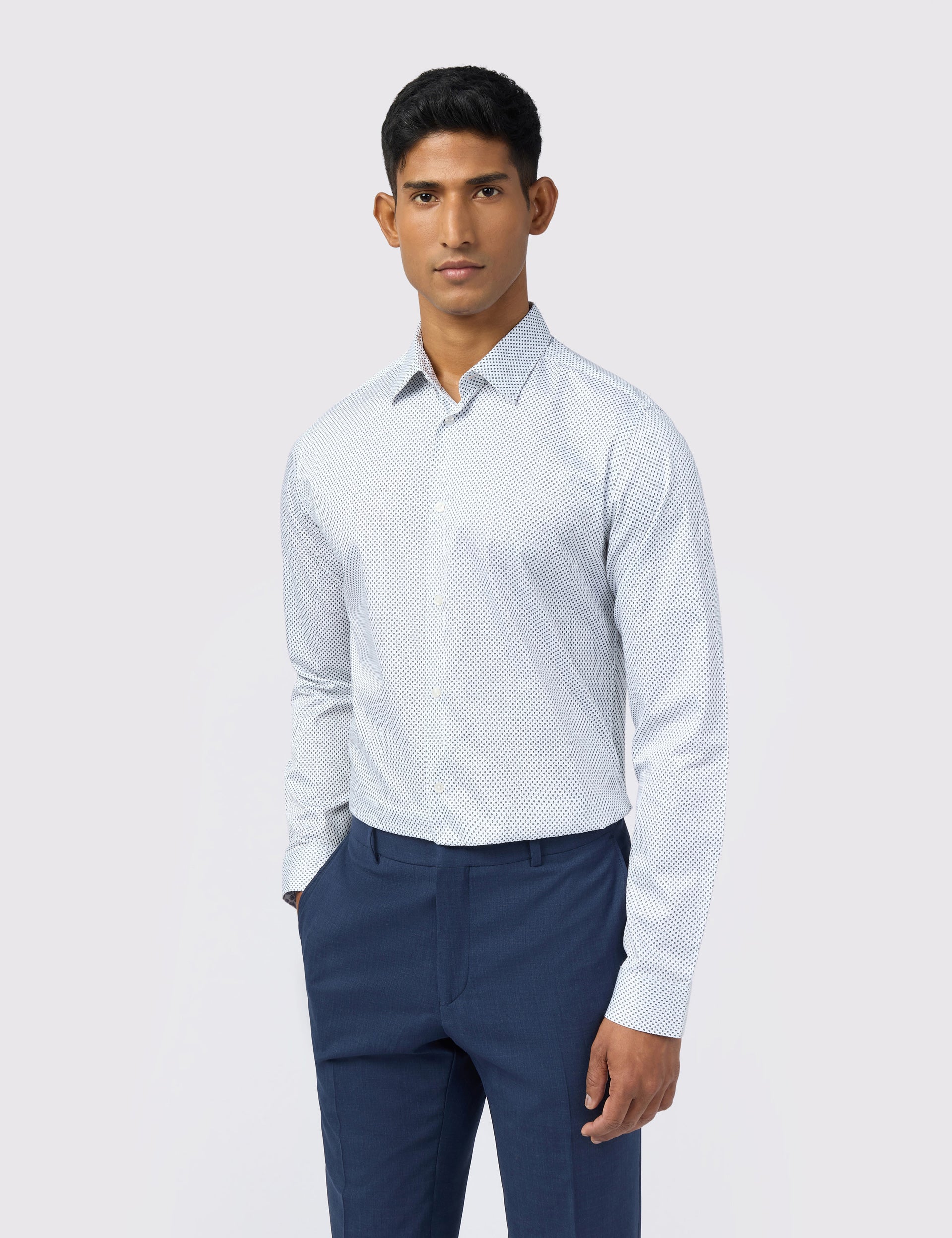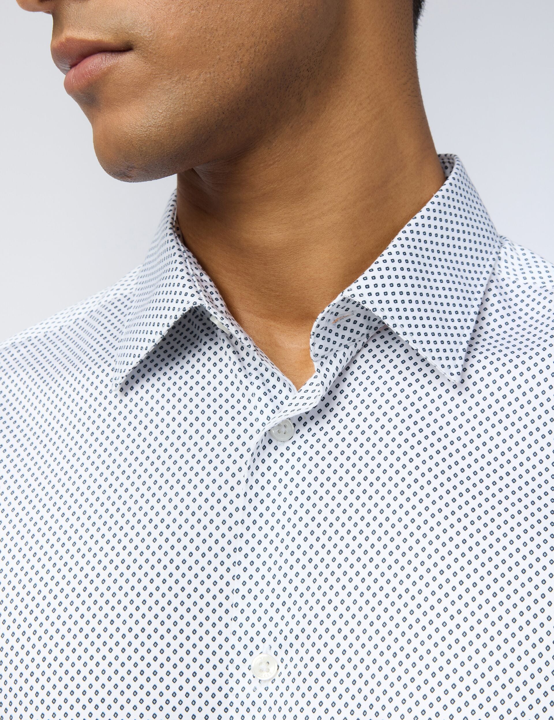 Mix understated print into your tailoring with the IVE long sleeve shirt, designed with a micro diamond pattern all over its soft sateen fabric. Crafted from a organic cotton with a touch of stretch, this slim fit layers comfortably under blazers and suit jackets.