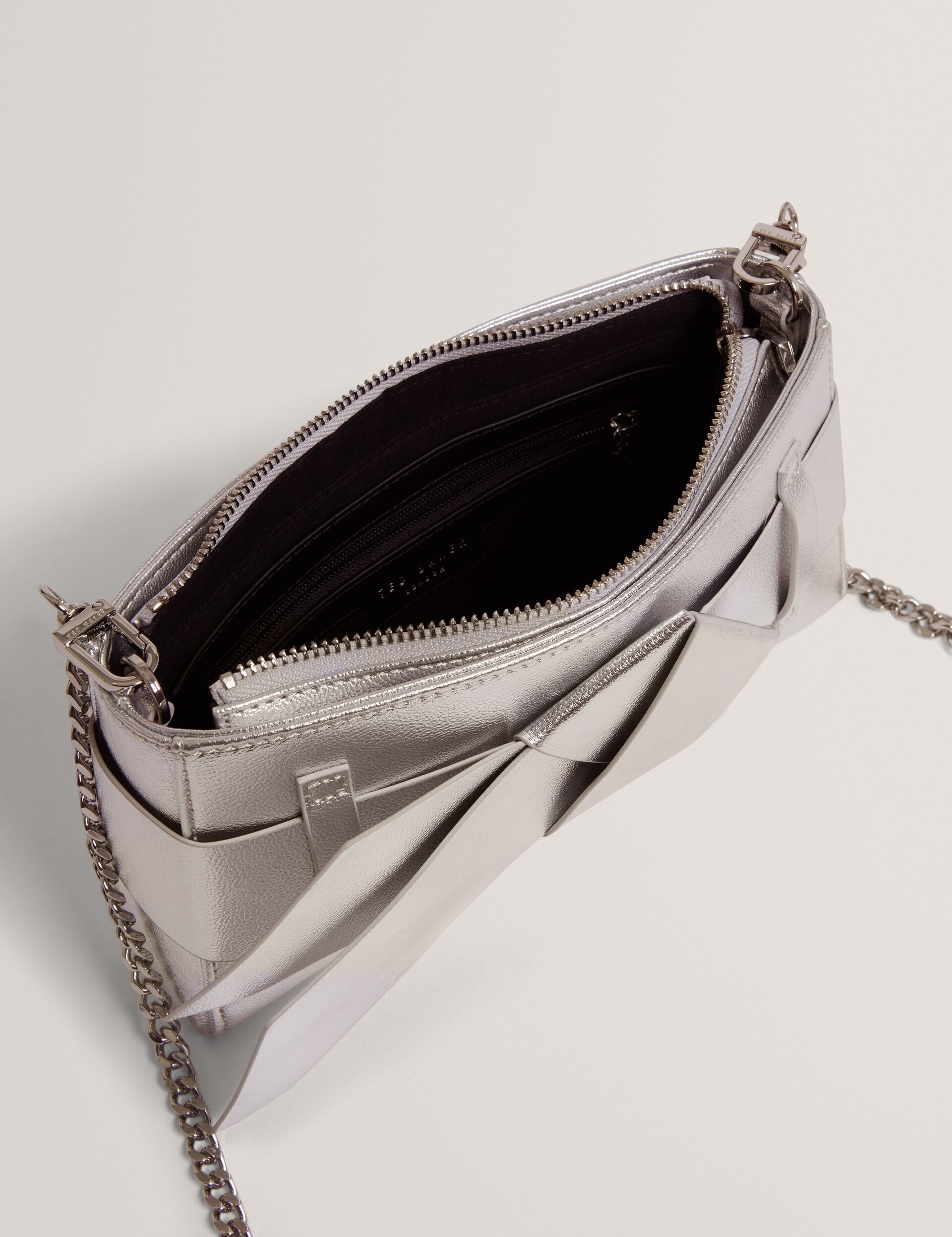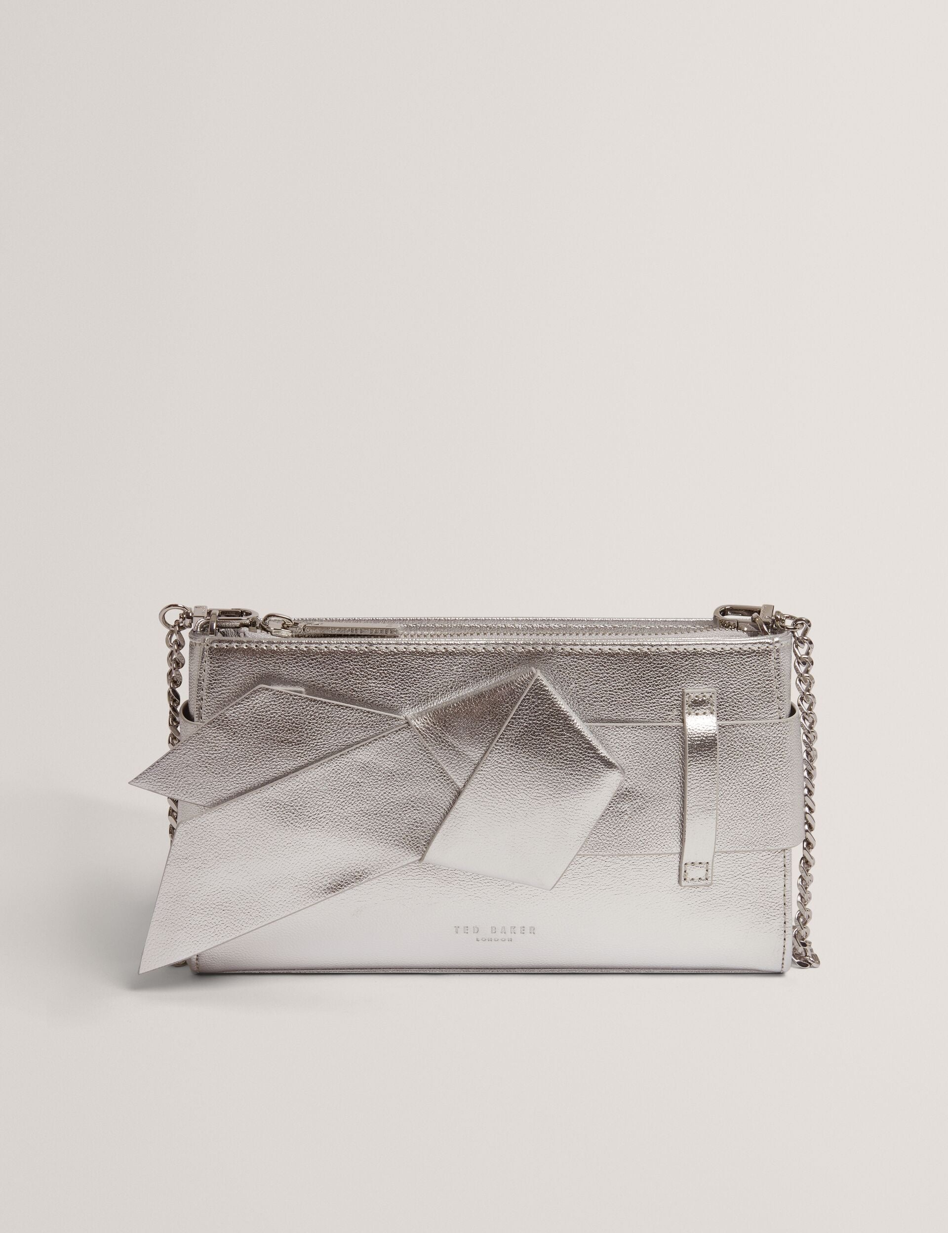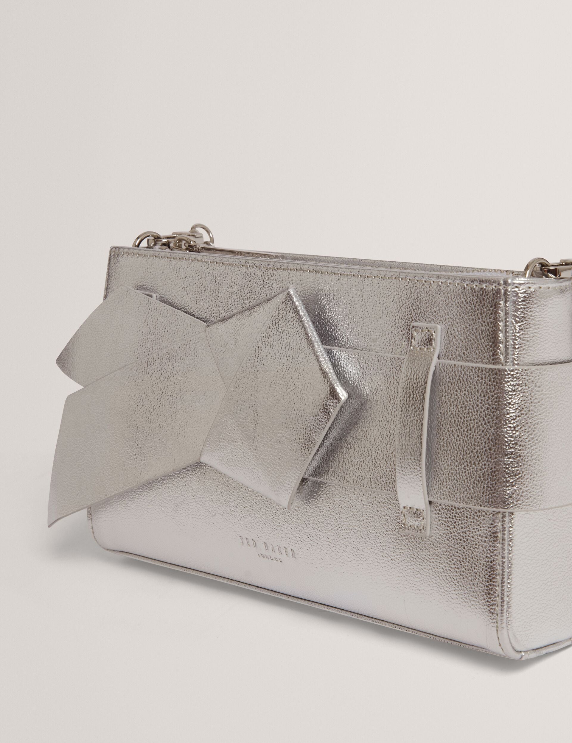Fit for a night out, the JIMMAH clutch is crafted from a dazzling metallic faux leather and features our signature knotted bow trim detail. Take this compact clutch hands-free with the removable shoulder strap.