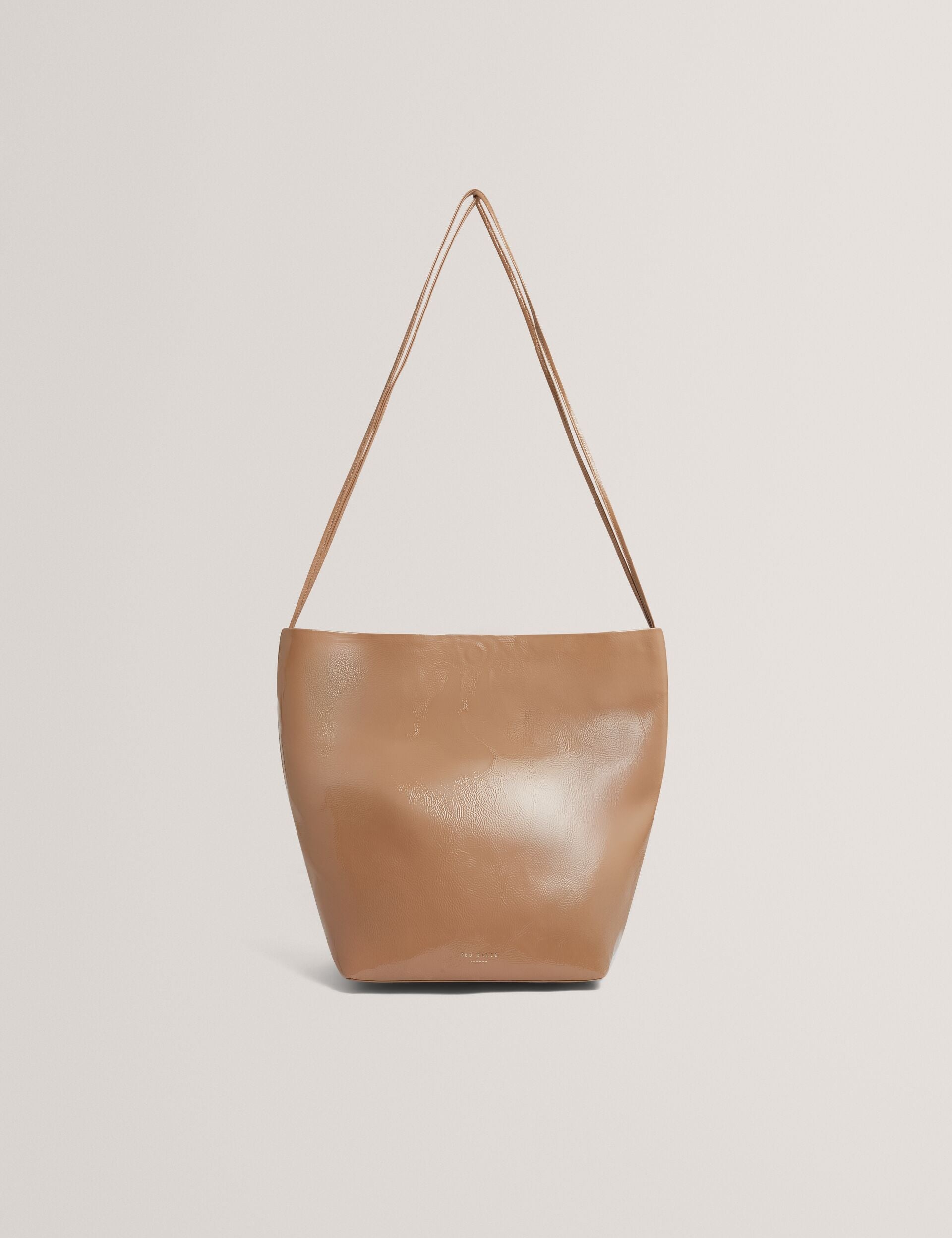 Sleek and minimalist, the KAMILAA bucket bag features a slim shoulder strap and roomy interior. Its patent faux leather is finished with a crinkled texture for effortless, everyday style.