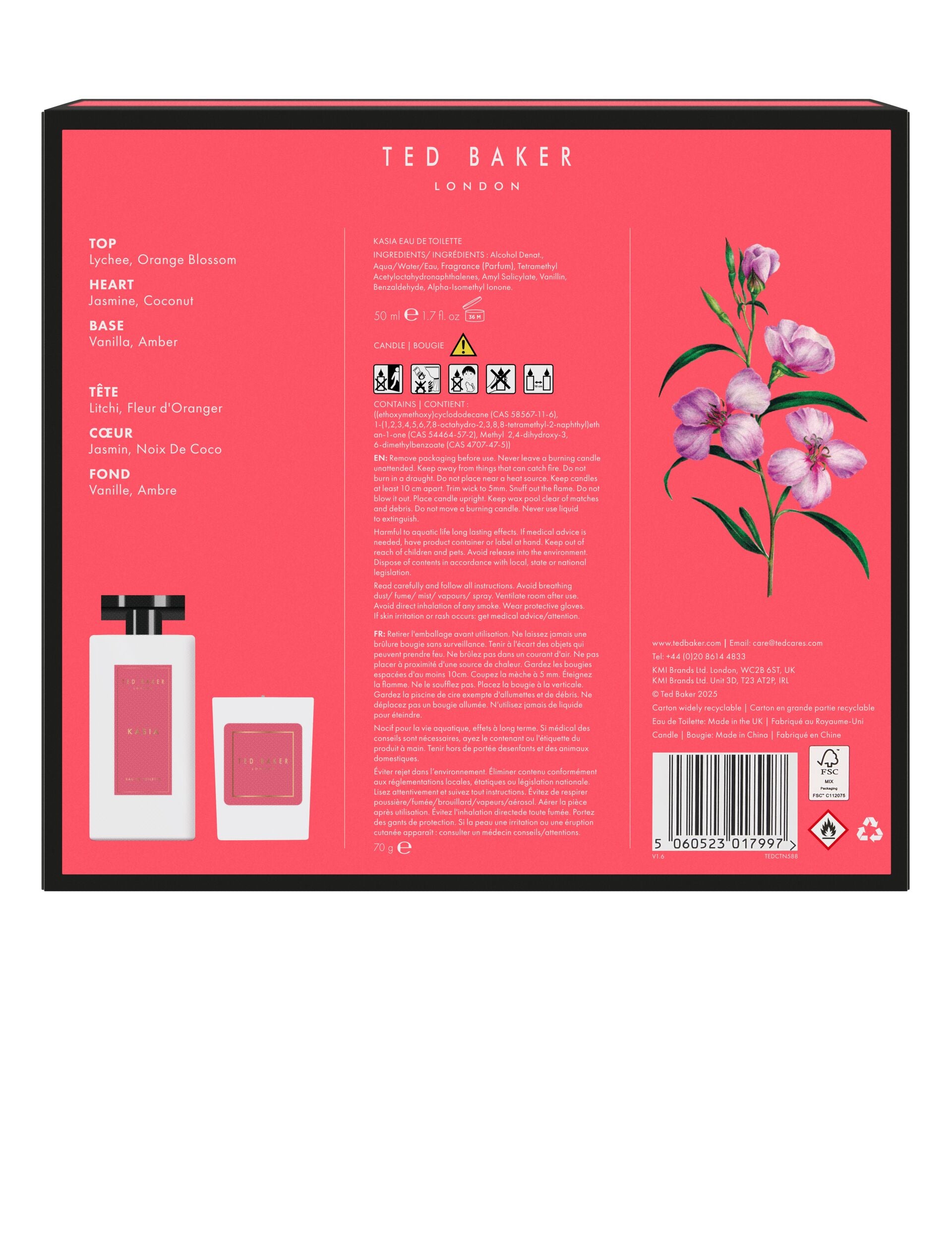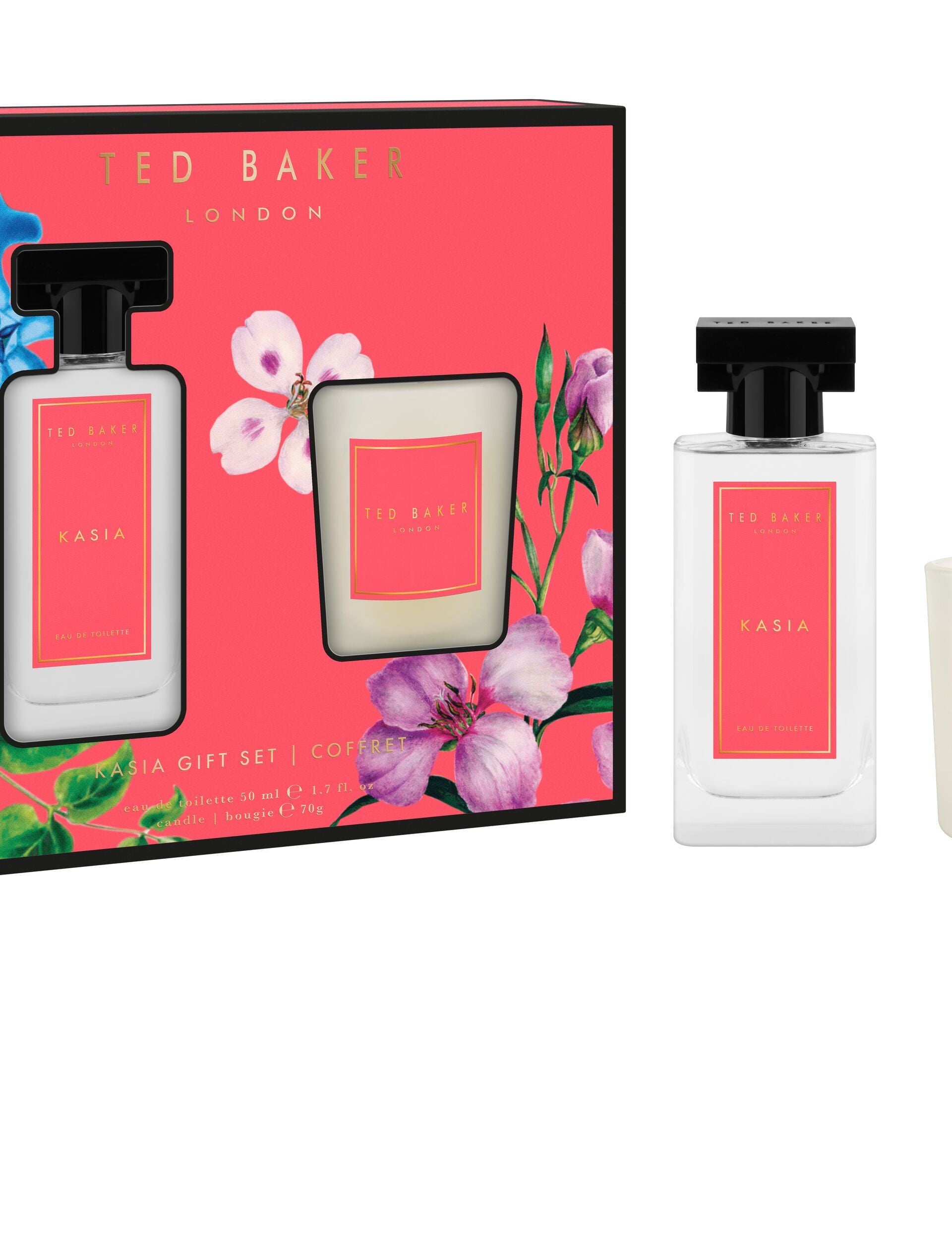 The joy of a Ted Baker fragrance for you and your home. The KASIA gift set features a full-sized eau de toilette as well as a scented candle in one of our signature floral fragrances. Complete with gift box packaging, it's the perfect present to gift her for festive season or special occasions.