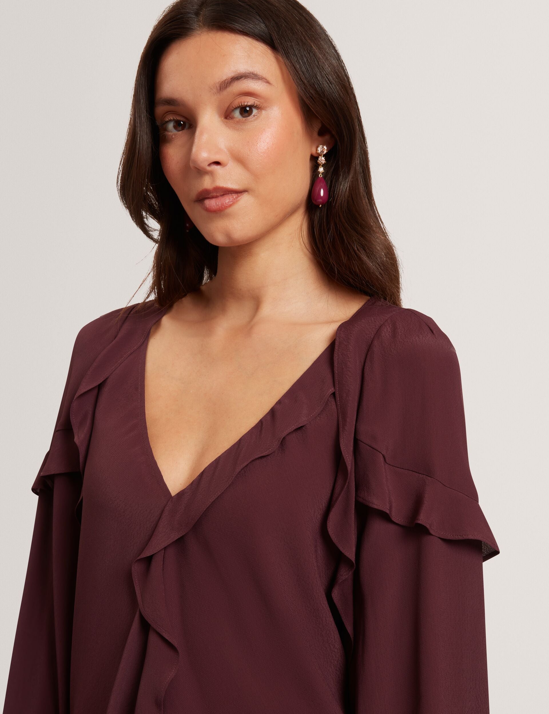 Go for that floaty, feminine feel with KAYFA. It's trimmed with waterfall ruffles across the bodice and shoulders, and finished with long puffed sleeves. Pair this V-neck blouse with fitted trousers for a charming evening look.