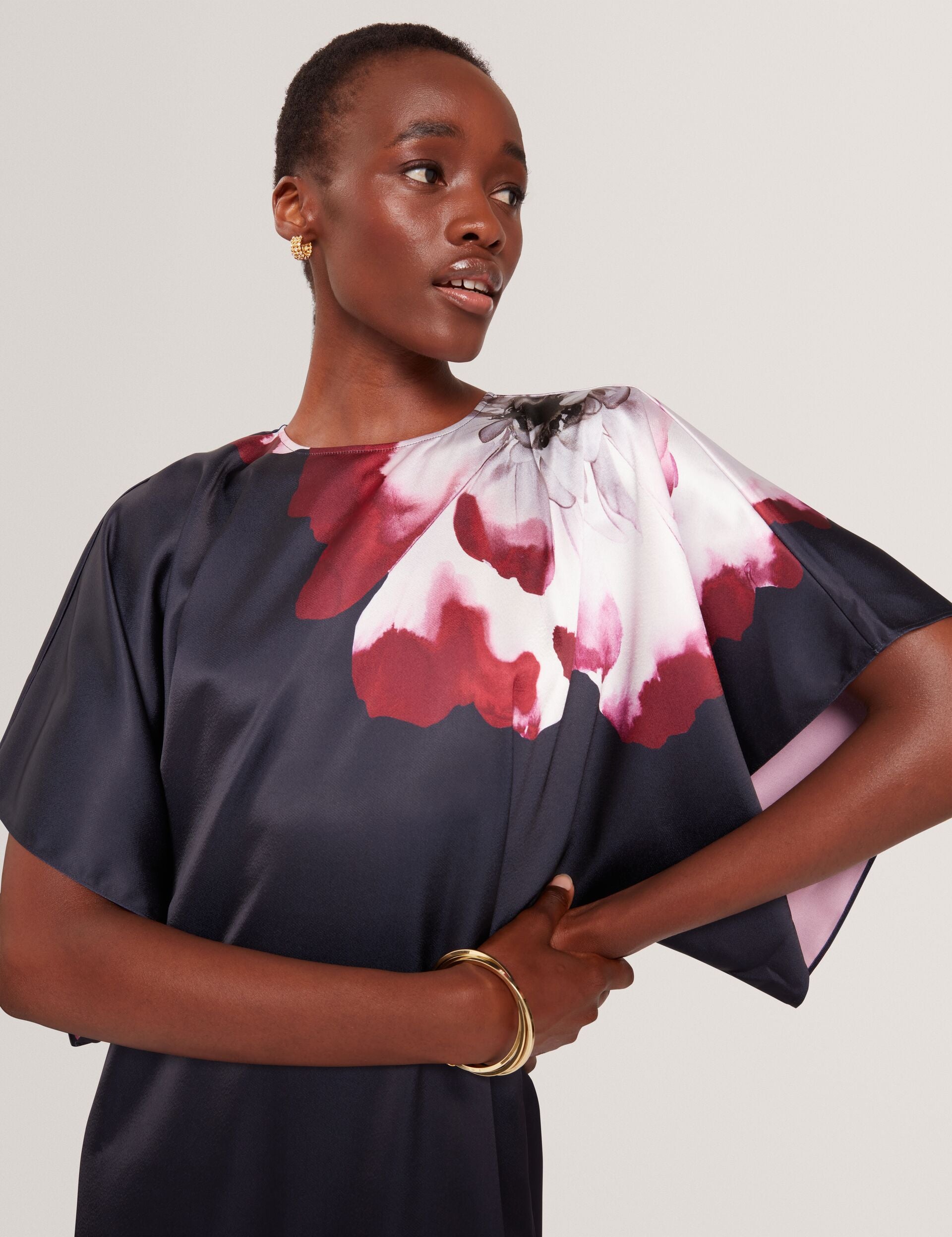 Floral Print Batwing Satin Midi Dress