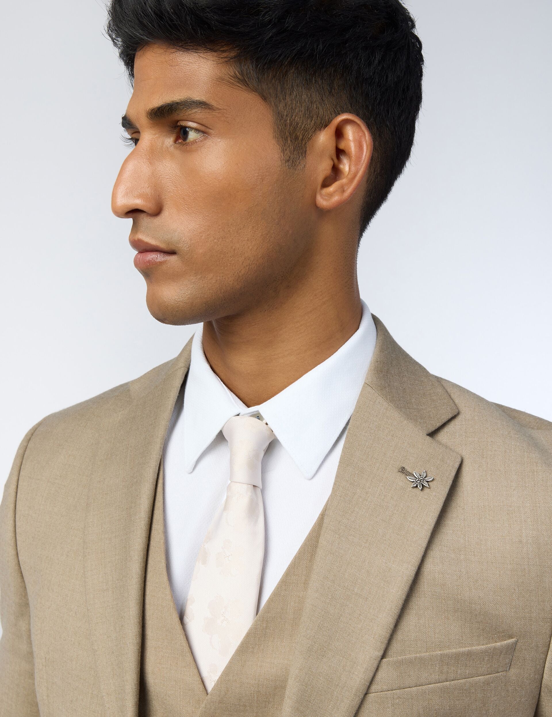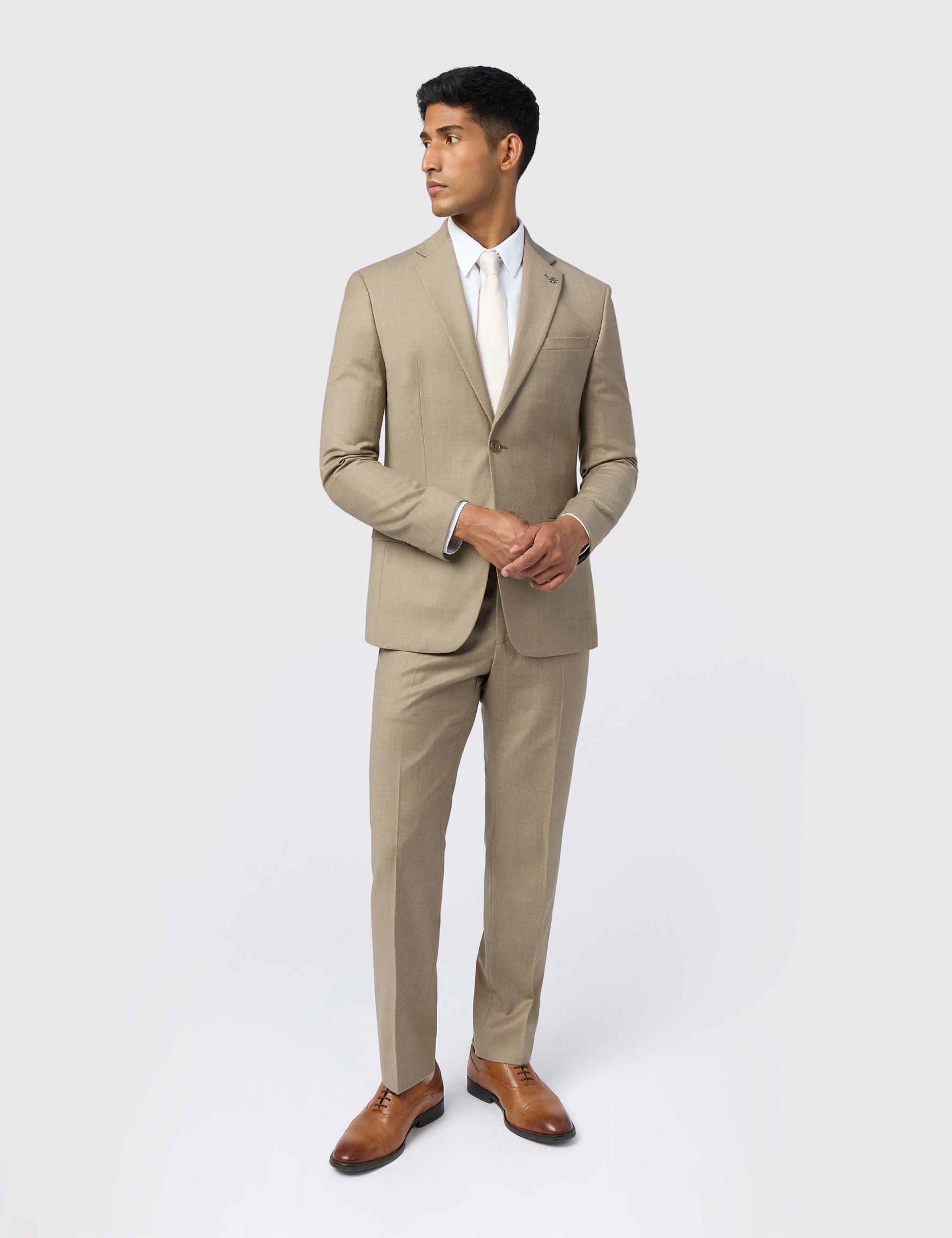 The LARKIN suit jacket feels fresh and contemporary in its neutral oatmeal shade, made from a soft flannel fabric that brings subtle texture. Cut to a contemporary slim fit, the wool-rich blend features a hint of stretch and natural warmth that keeps you comfortable through office days and winter weddings.