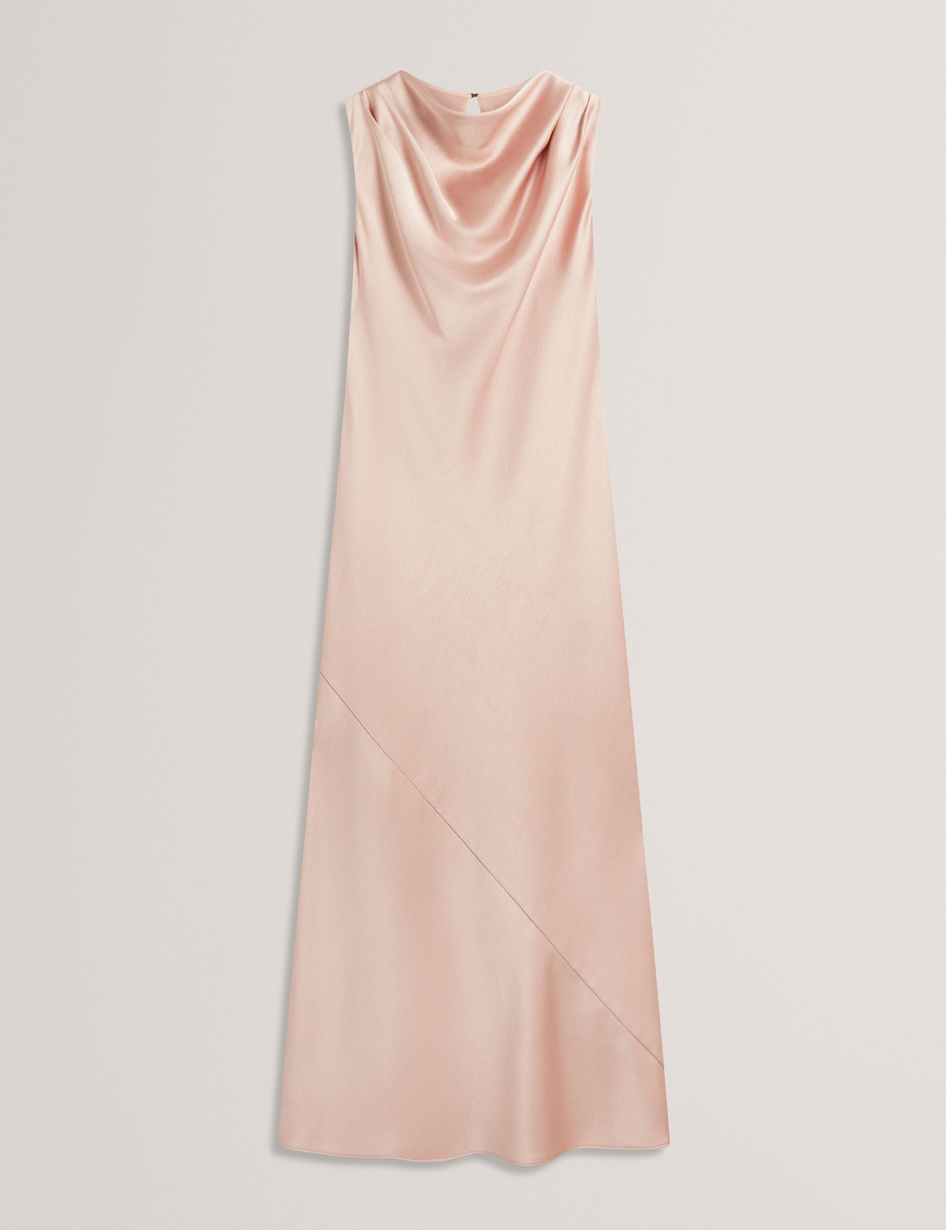 Turn heads, but do it elegantly in the LIIMAA sleeveless midi dress. Crafted from a dusky pink satin fabric, its flowy bias cut is complemented by delicate draping at the neckline, creating a piece that oozes femininity.