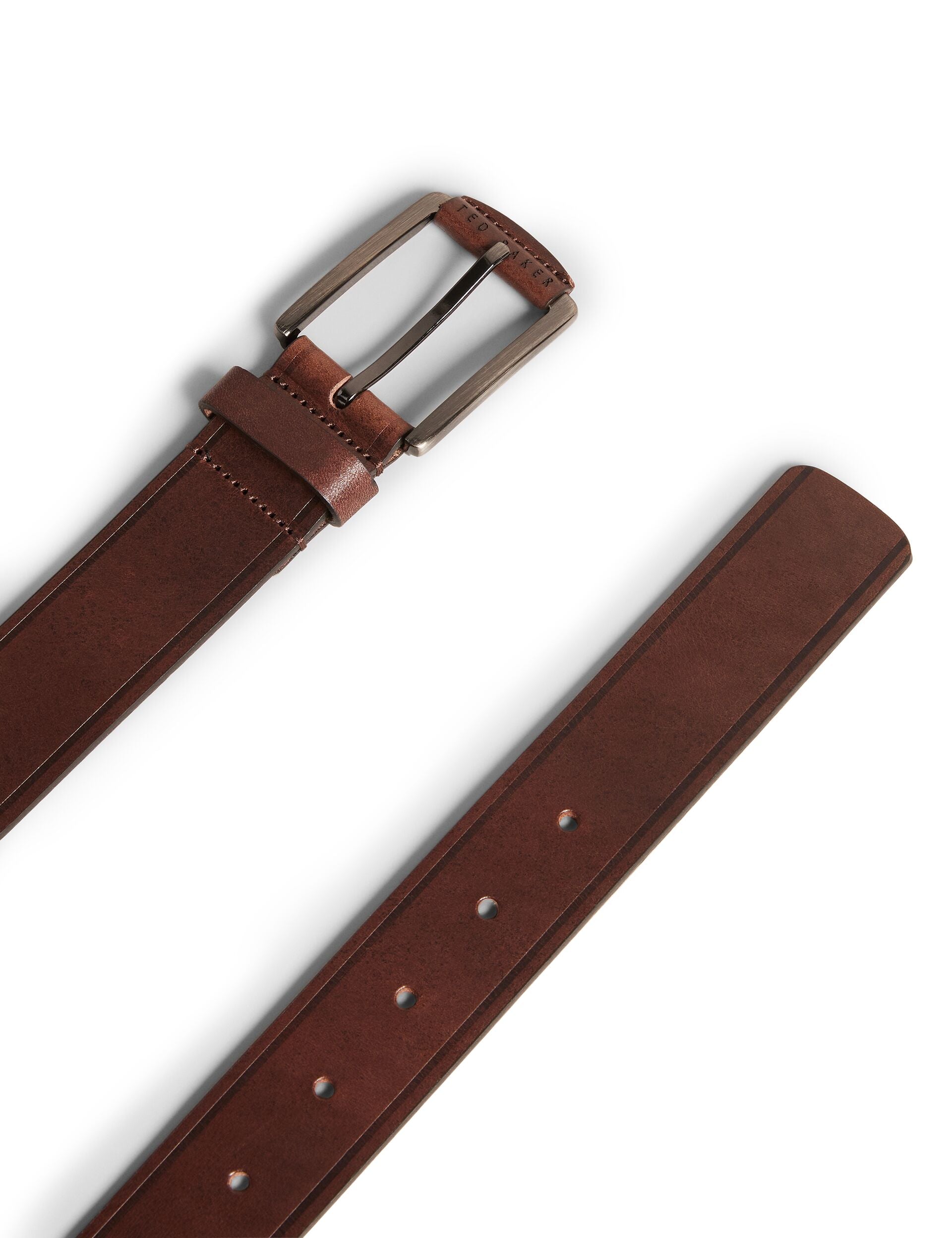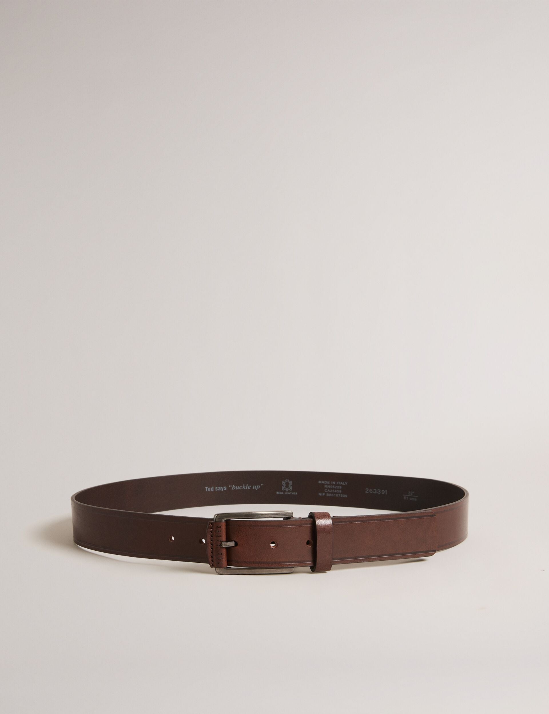 - Branded leather tab on buckle