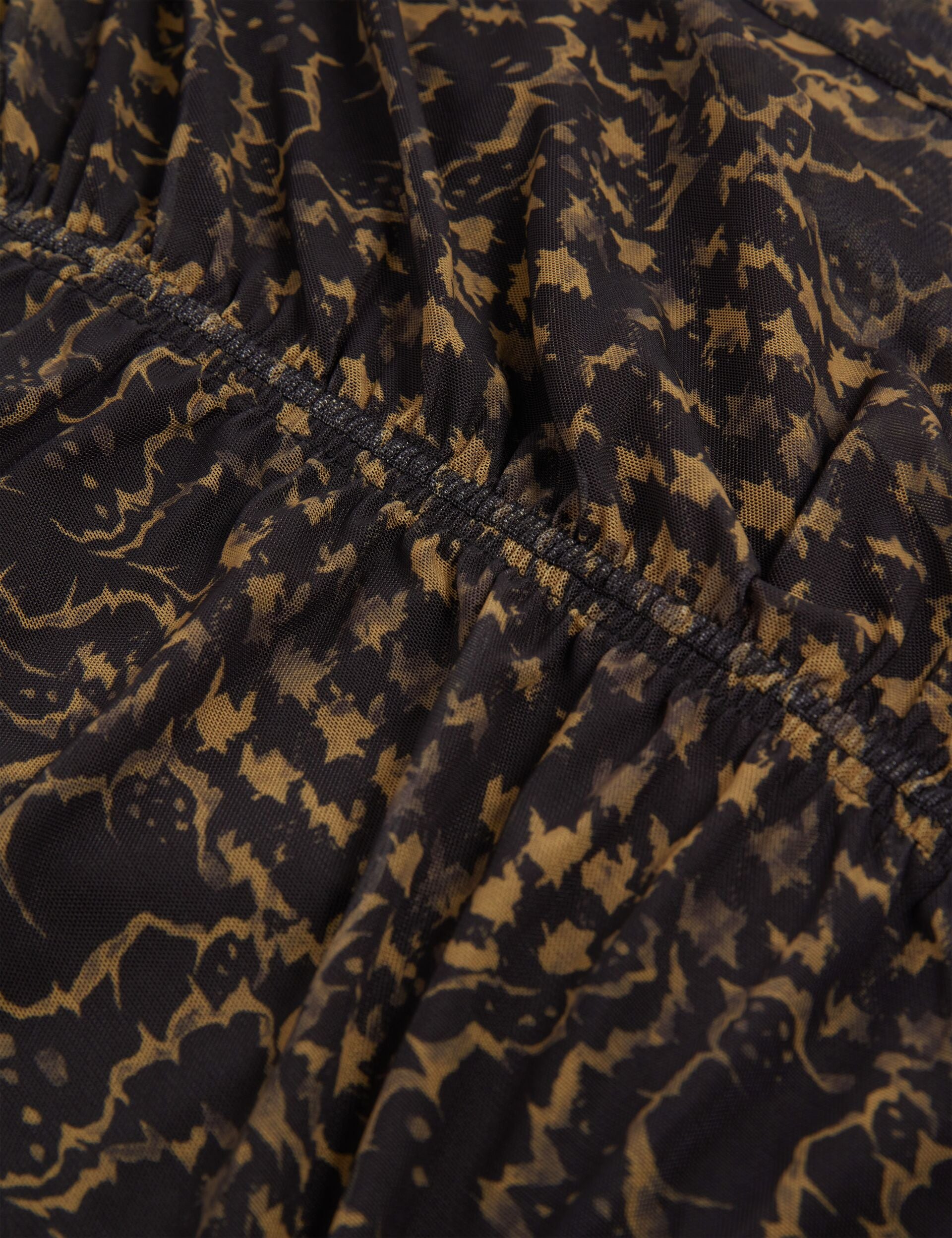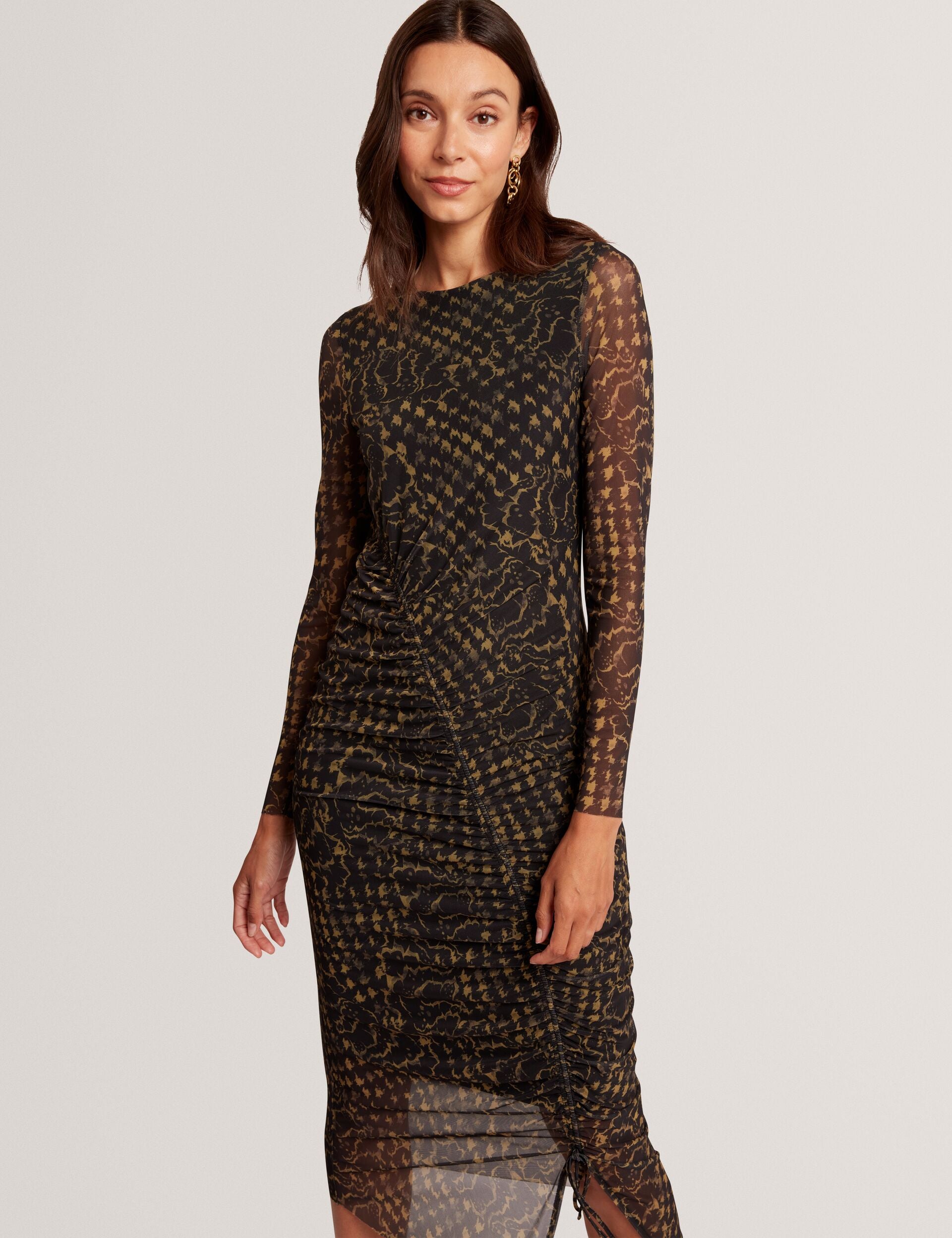 Printed Mesh Ruched Bodycon Midi Dress