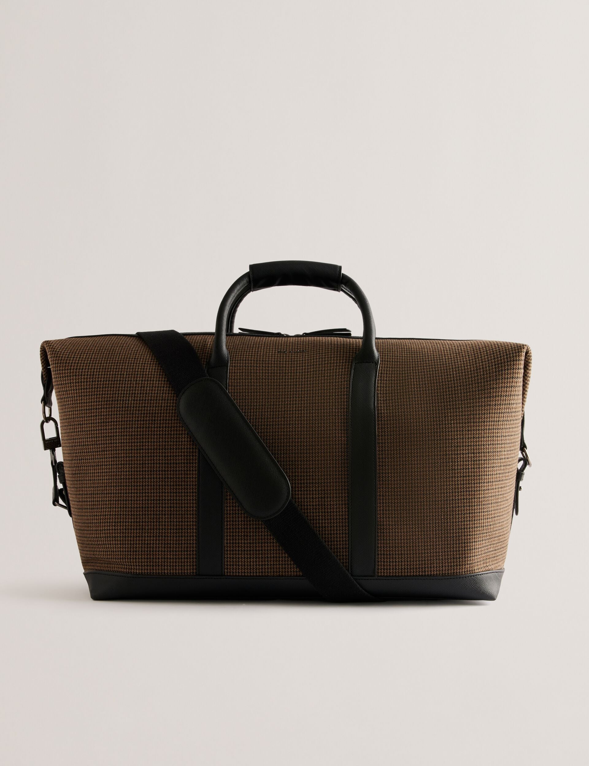 The MALCOM holdall bag is the only accessory needed for your weekend getaway. A checked wool blend fabric gives it a preppy feel, elevated by faux leather trims with a crosshatch texture. It's easy to carry on your travels thanks to top handles that feature a handy holder tab, as well as a removable strap fitted with shoulder pad.