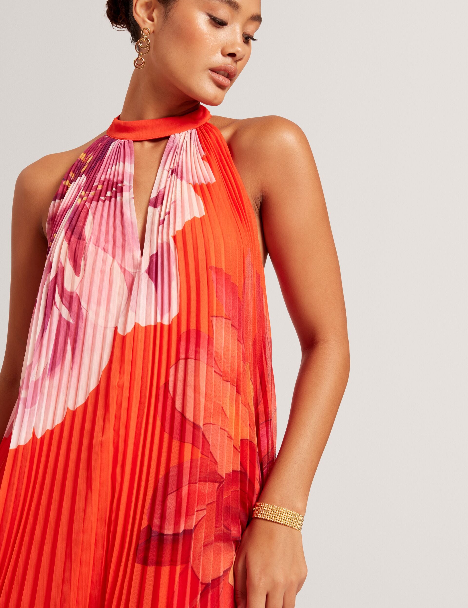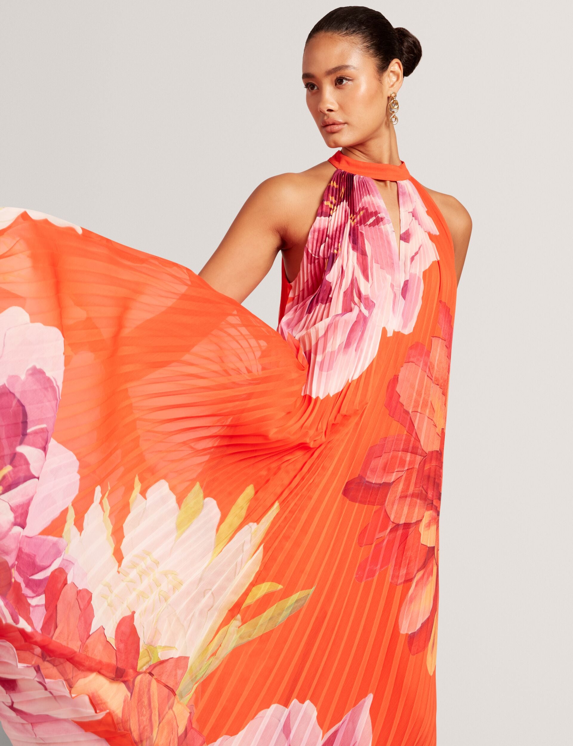 Floral Halter Neck Pleated Chiffon Maxi Dress