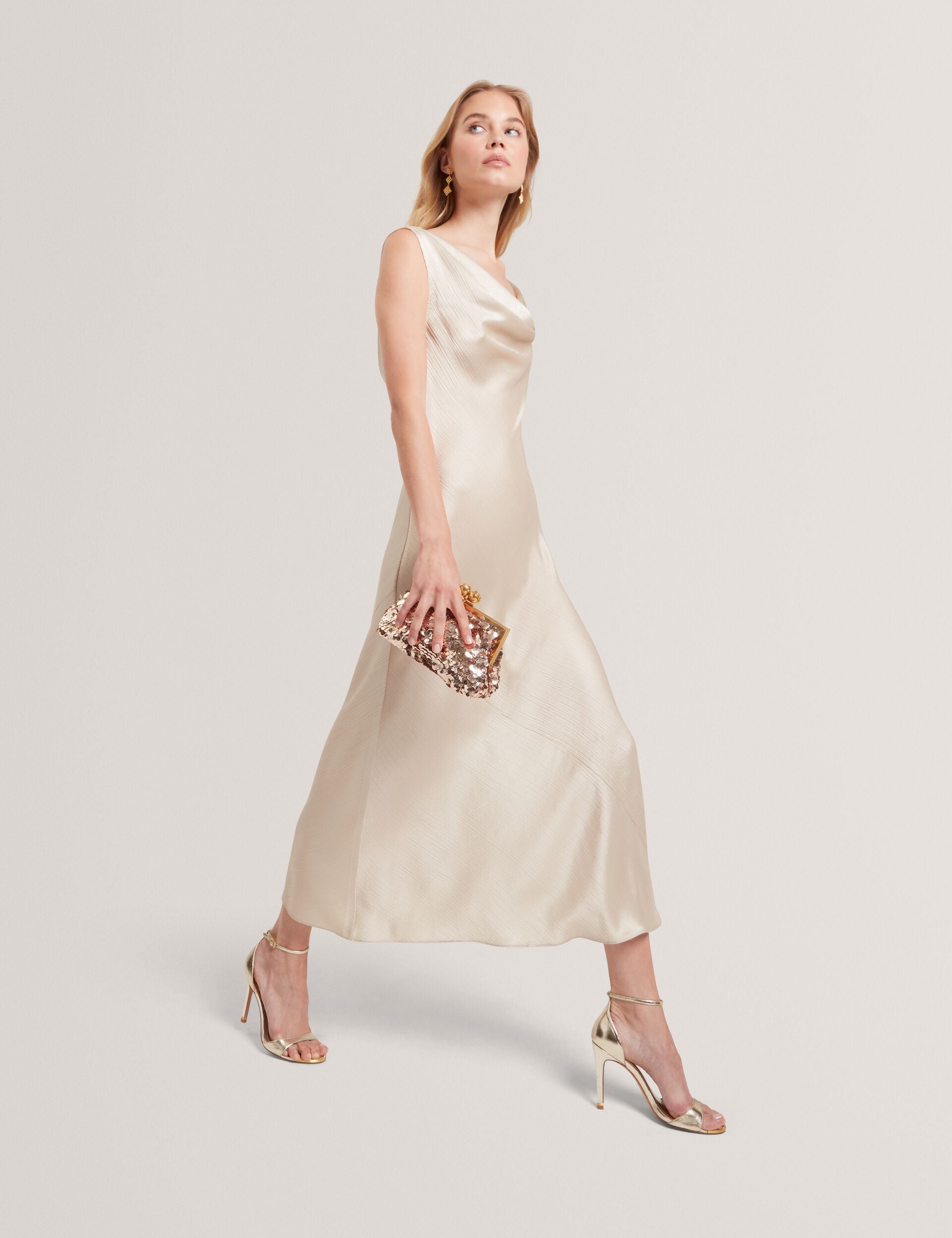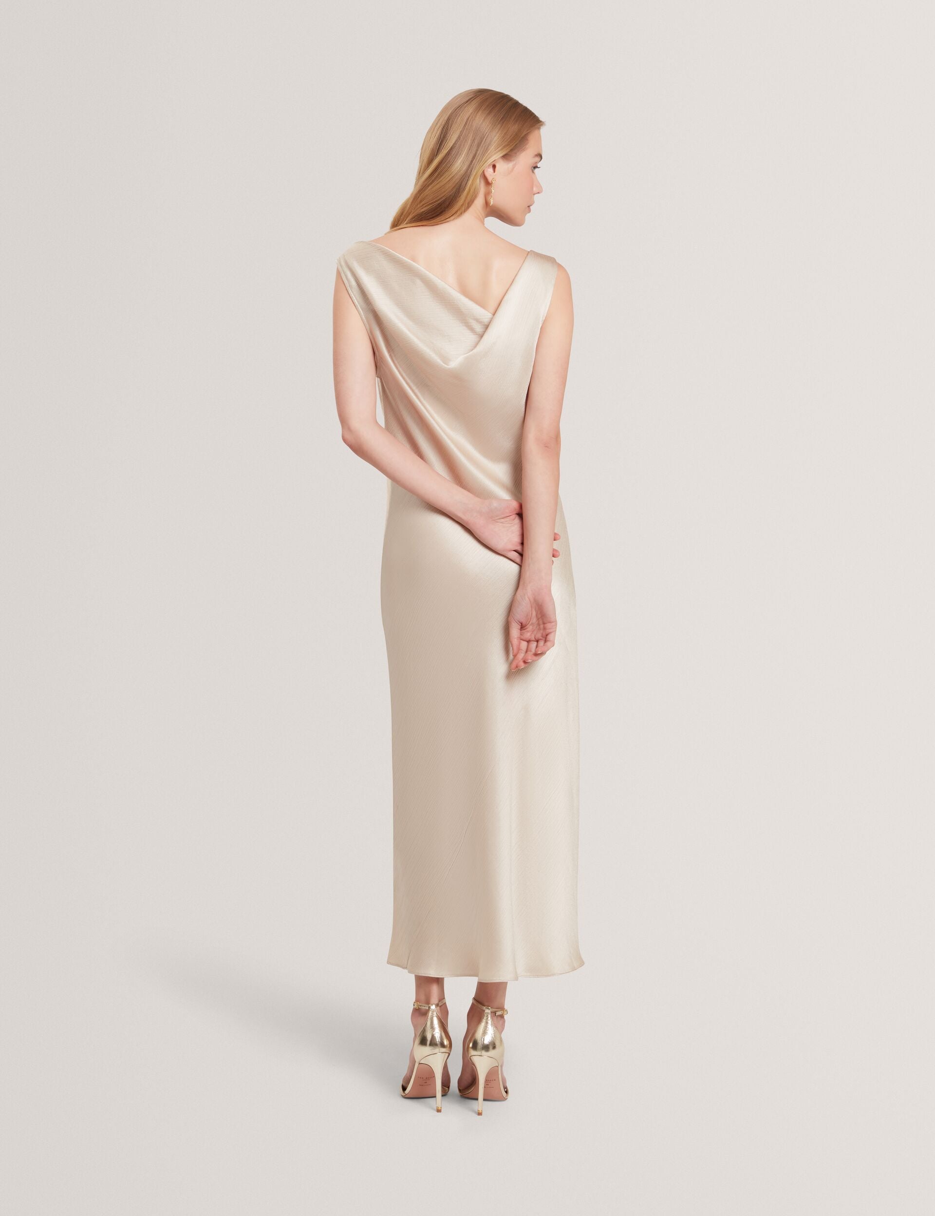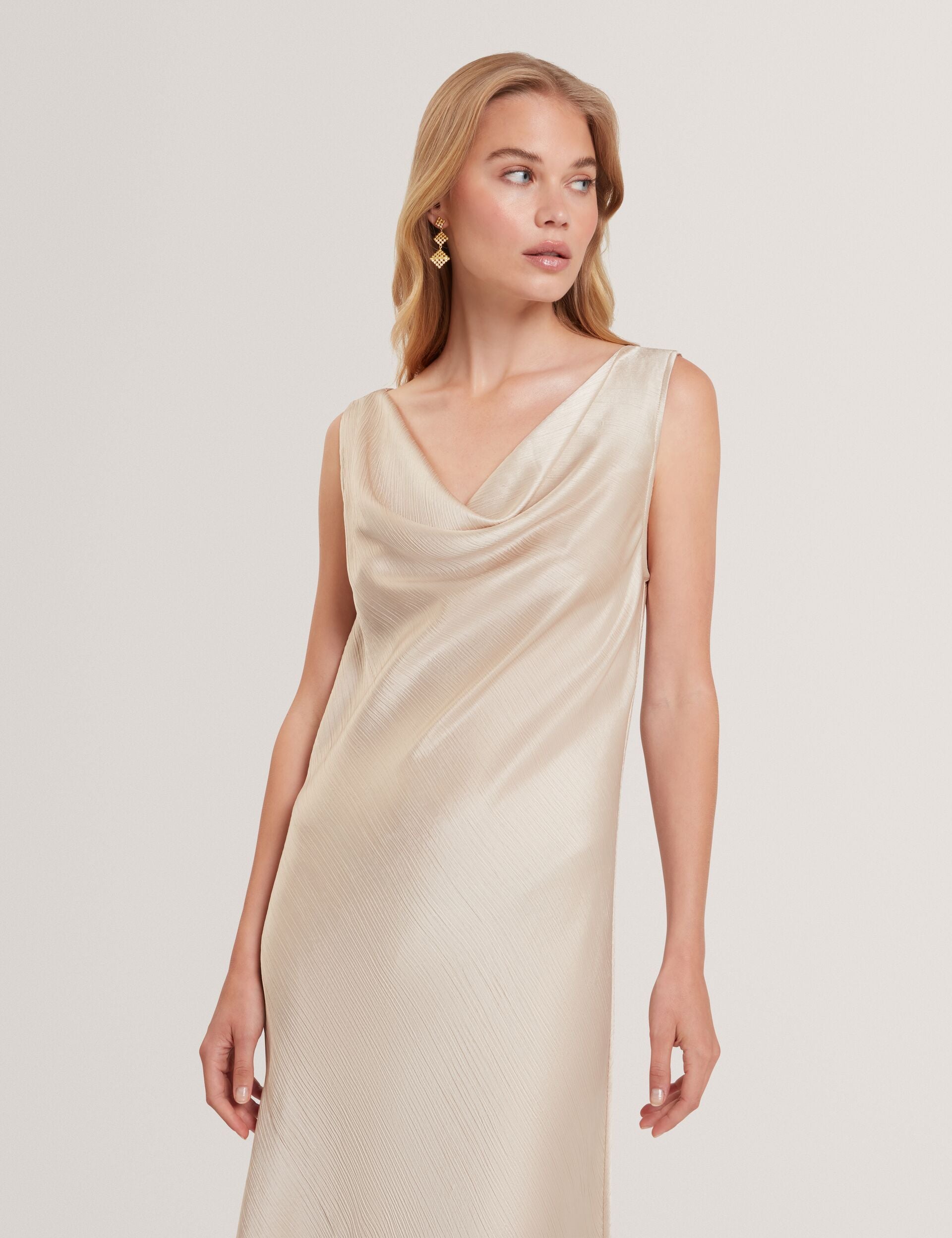 Simple and sophisticated, the MIINTA midi dress makes a key piece for your occasion wardrobe. Crinkled satin fabric creates a beutiful sheen and drapes elegantly over your shape with the slip silhouette, complete with a cowl neckline that brings feminine draping.