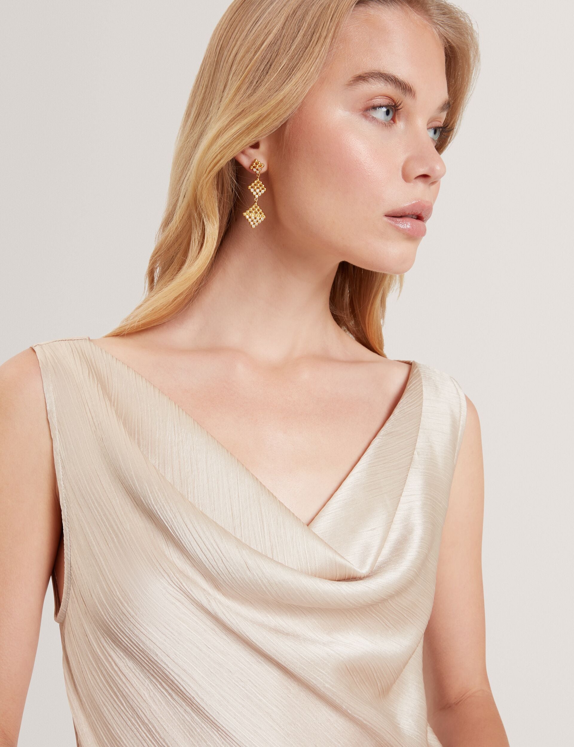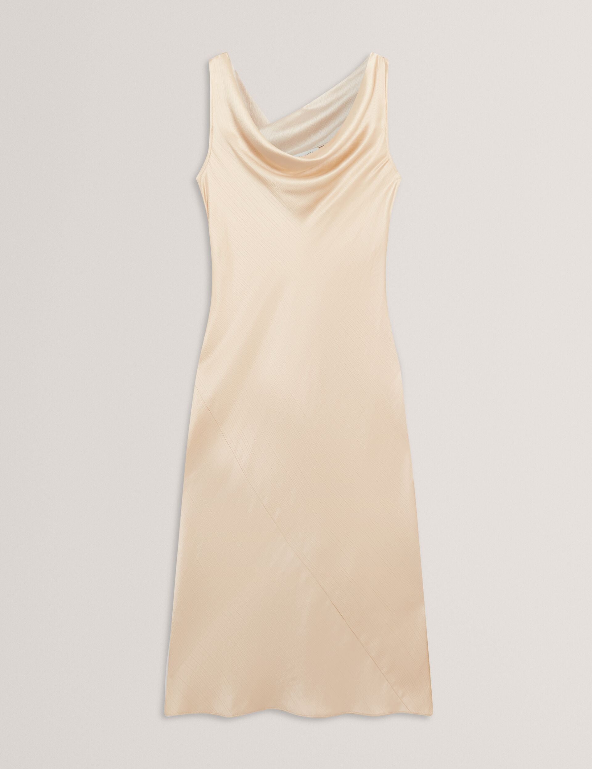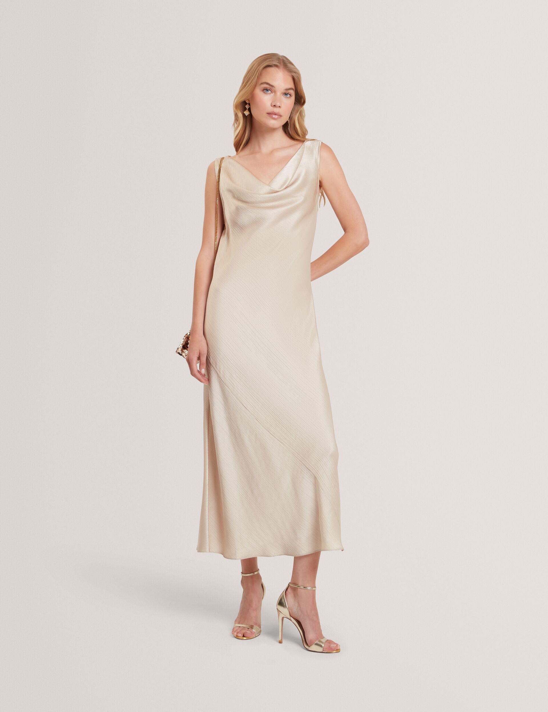 Simple and sophisticated, the MIINTA midi dress makes a key piece for your occasion wardrobe. Crinkled satin fabric creates a beutiful sheen and drapes elegantly over your shape with the slip silhouette, complete with a cowl neckline that brings feminine draping.