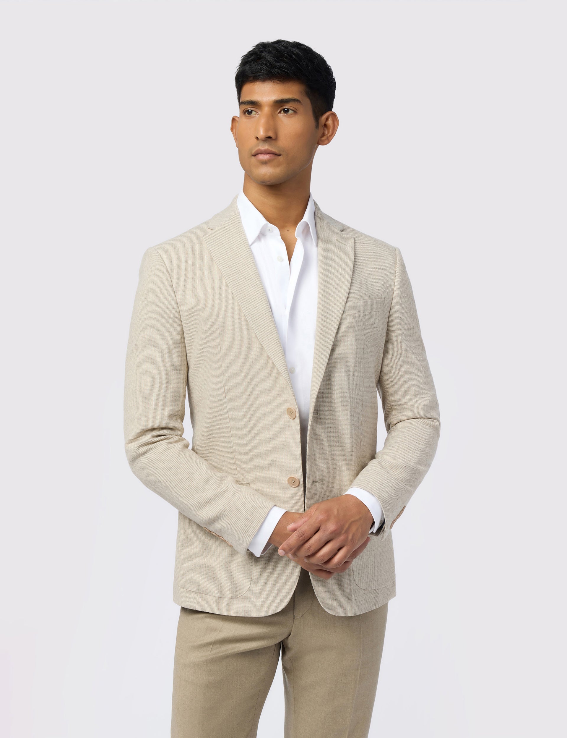 Designed with a micro check pattern, the MONRO blazer will elevate staple chinos and suit trousers with its neutral stone colour and subtle texture. Cut in a wearable slim fit and crafted from a soft wool blend, this tailored jacket is comfortable on all occasions thanks to its breathable finish and hint of stretch.