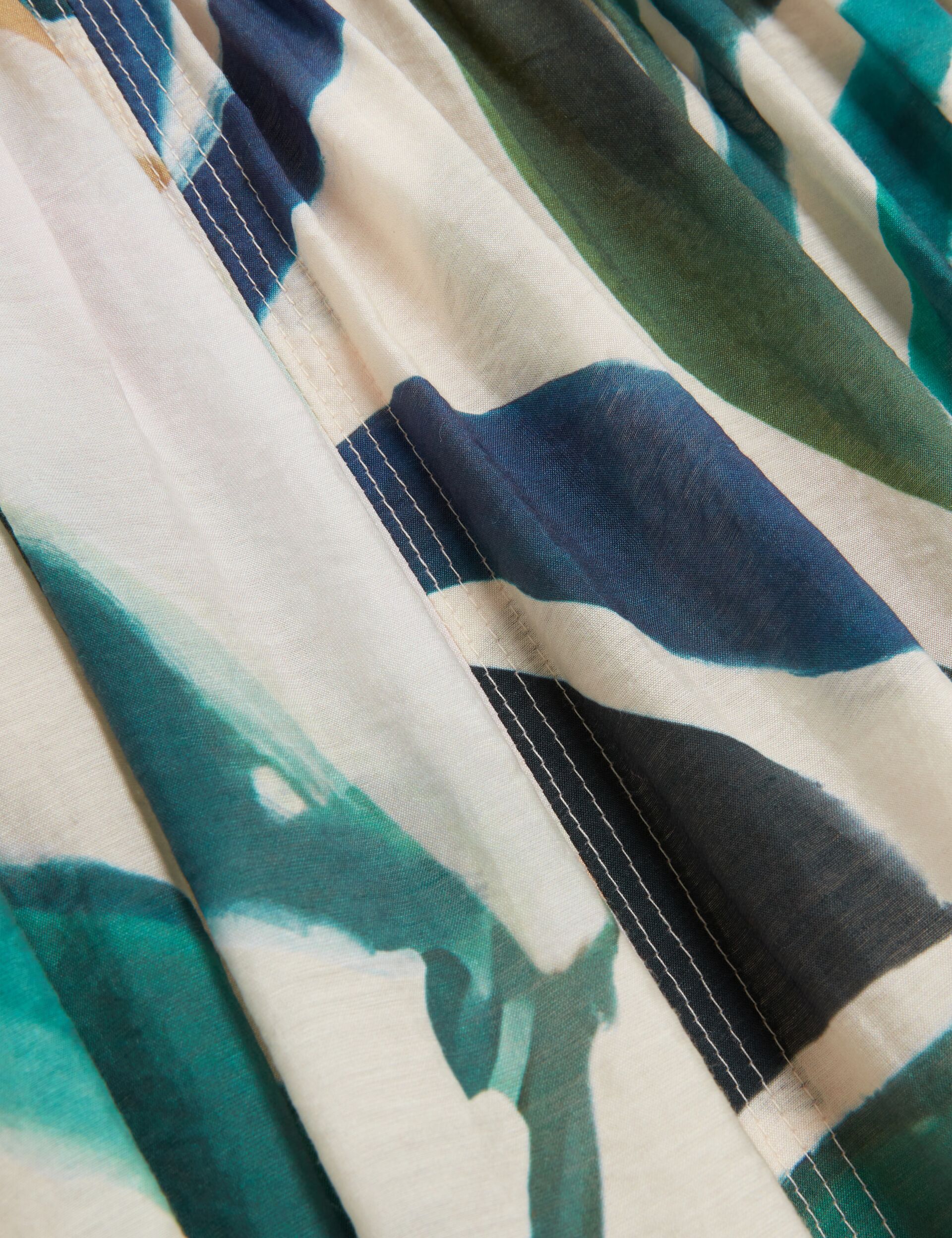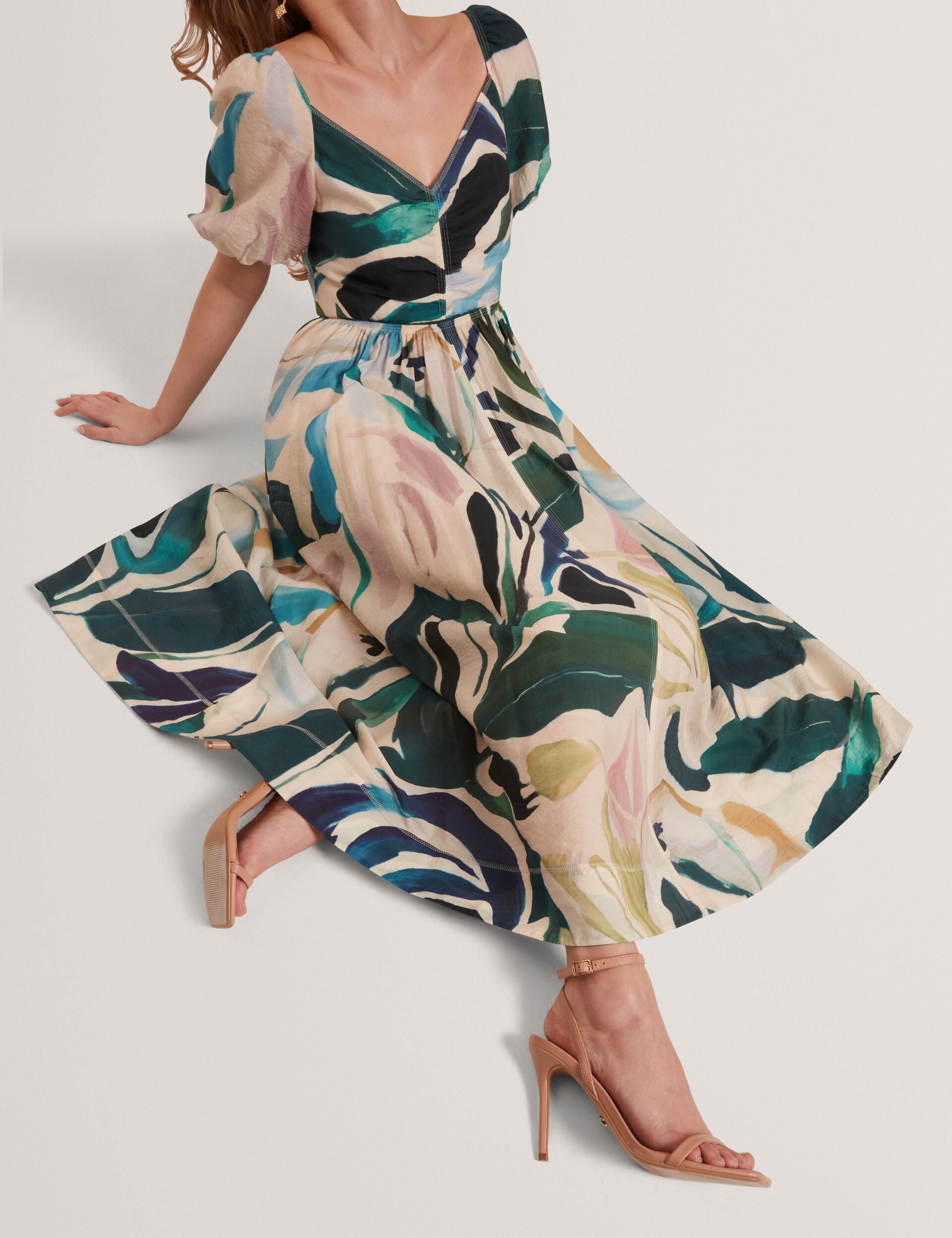 Printed Puff Sleeve Stitch Detail Midi Dress