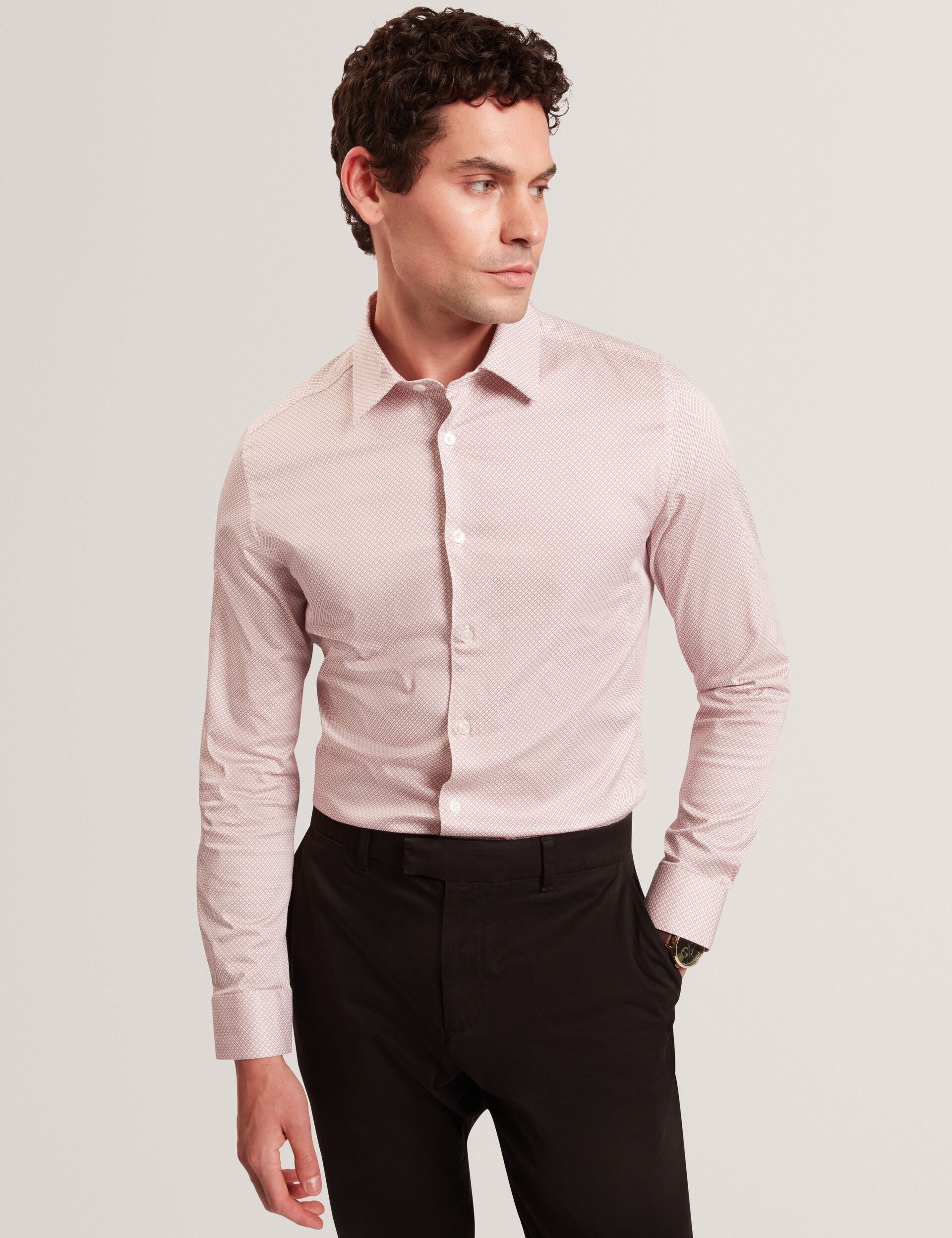 Contemporary shirting with signature Ted Baker flair. The OLWENO shirt features a micro geometric design that infuses your formalwear with personality whilst still feeling smart. Crafted from breathable cotton with a touch of stretch, style this slim fit piece with plain suits and classic chinos.