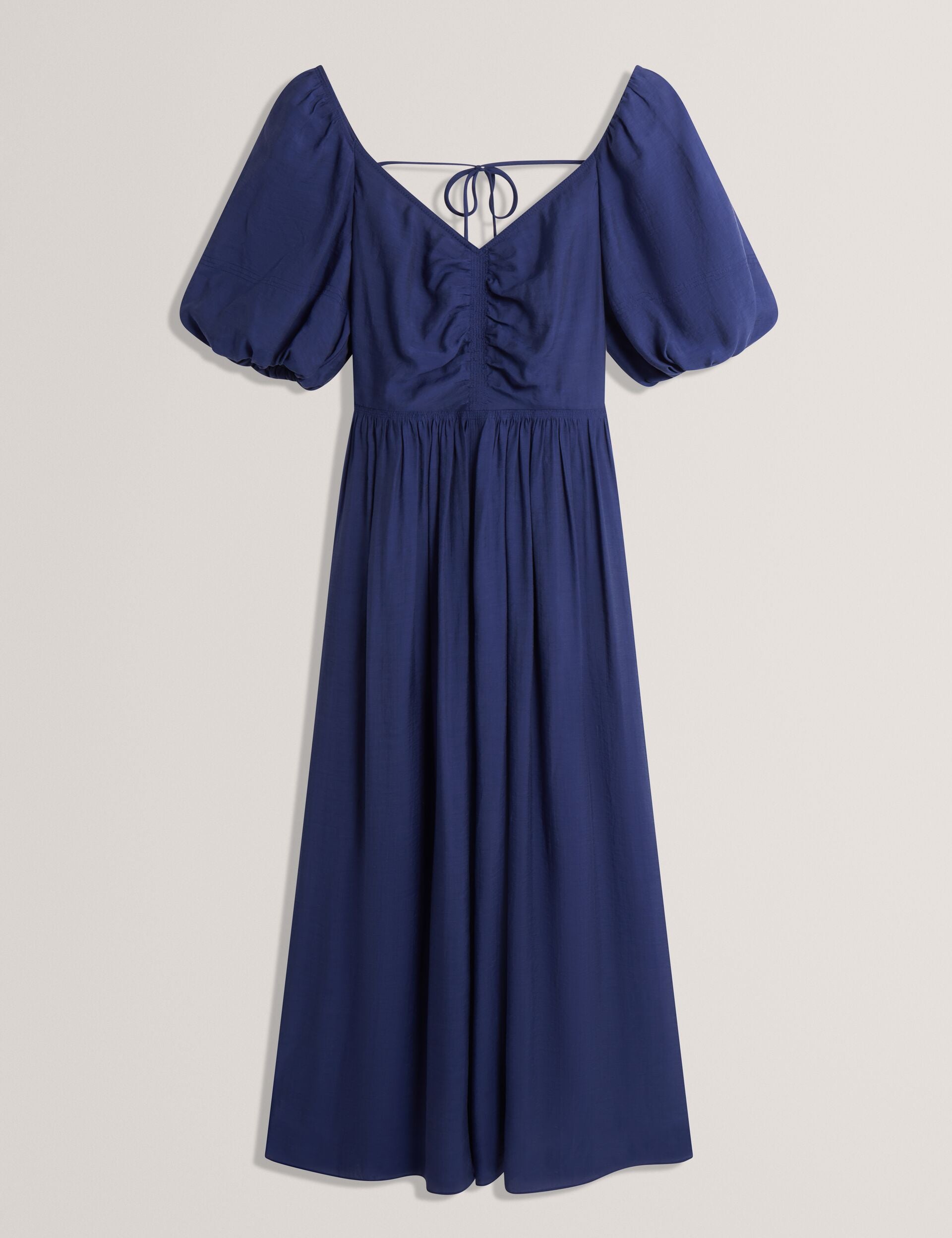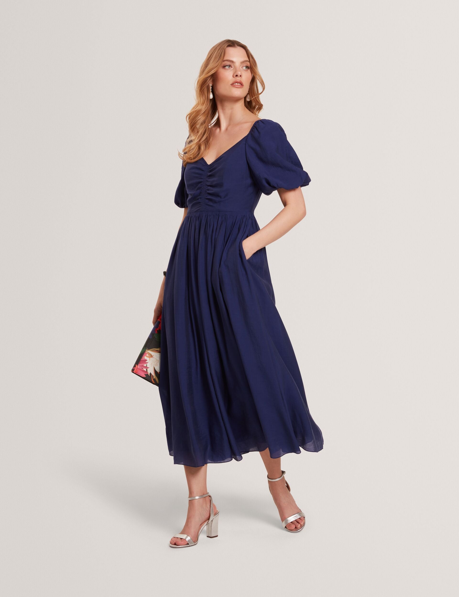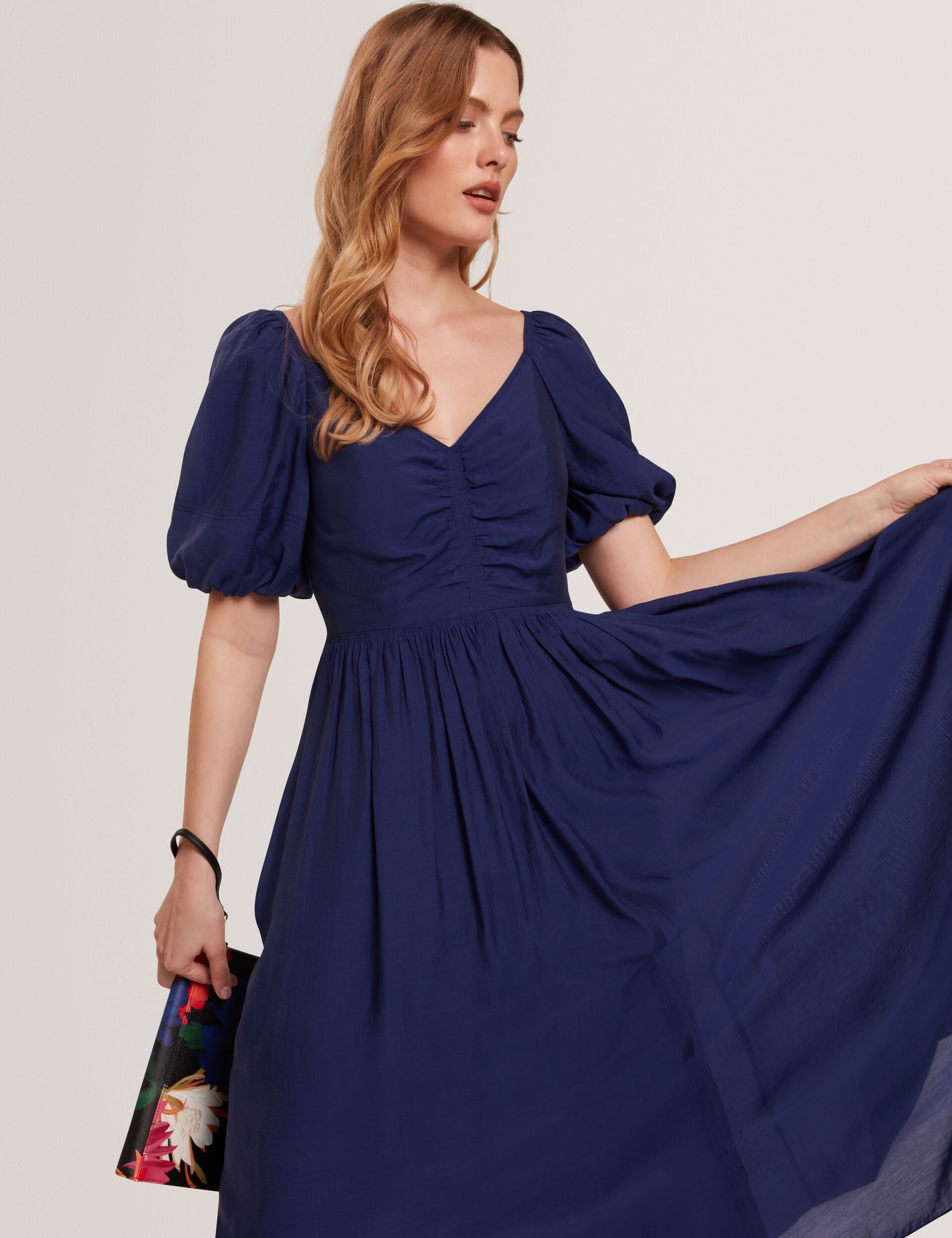 Puff Sleeve Ruched Detail V Neck Midi Dress