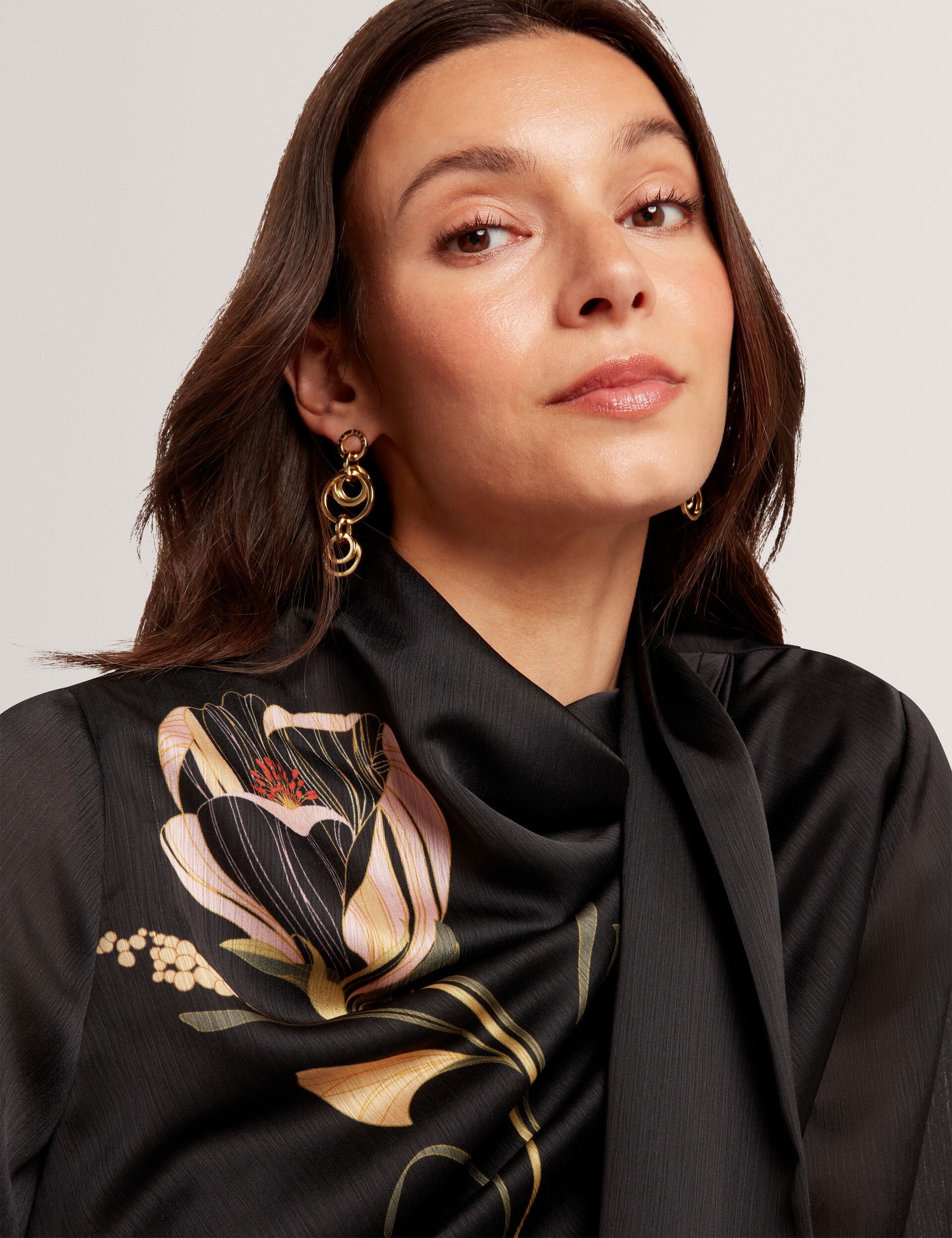- Draped high neck with tie fastening