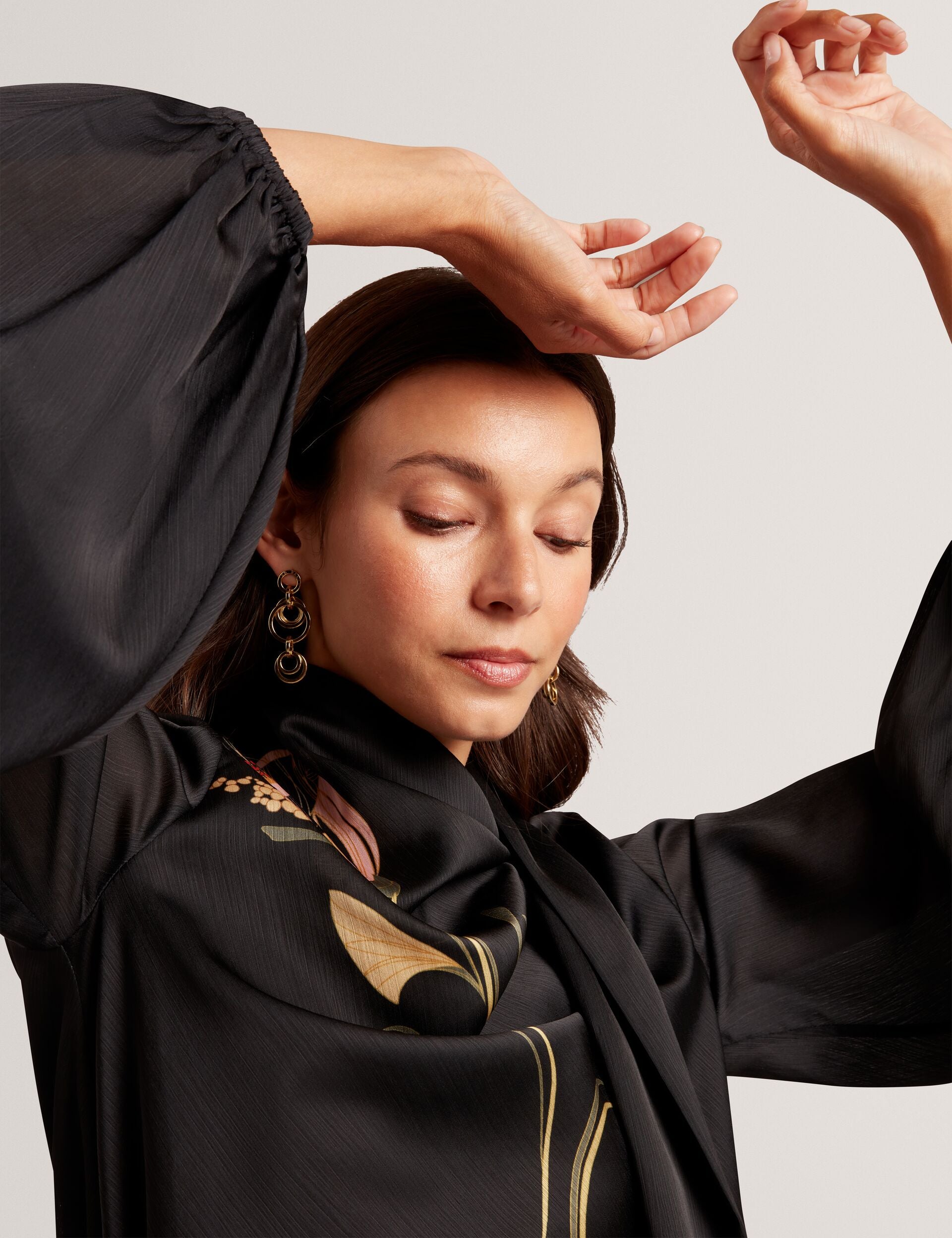 Whether it's desk to dinner or brunch to bar, our ORTUGA blouse is forever chic. Printed with our nouveau swirl design on a crinkled satin chiffon, it brings refined colour and texture to your staple pieces. Long blouson sleeves and a tie neck detail create a modest silhouette that still feels feminine.